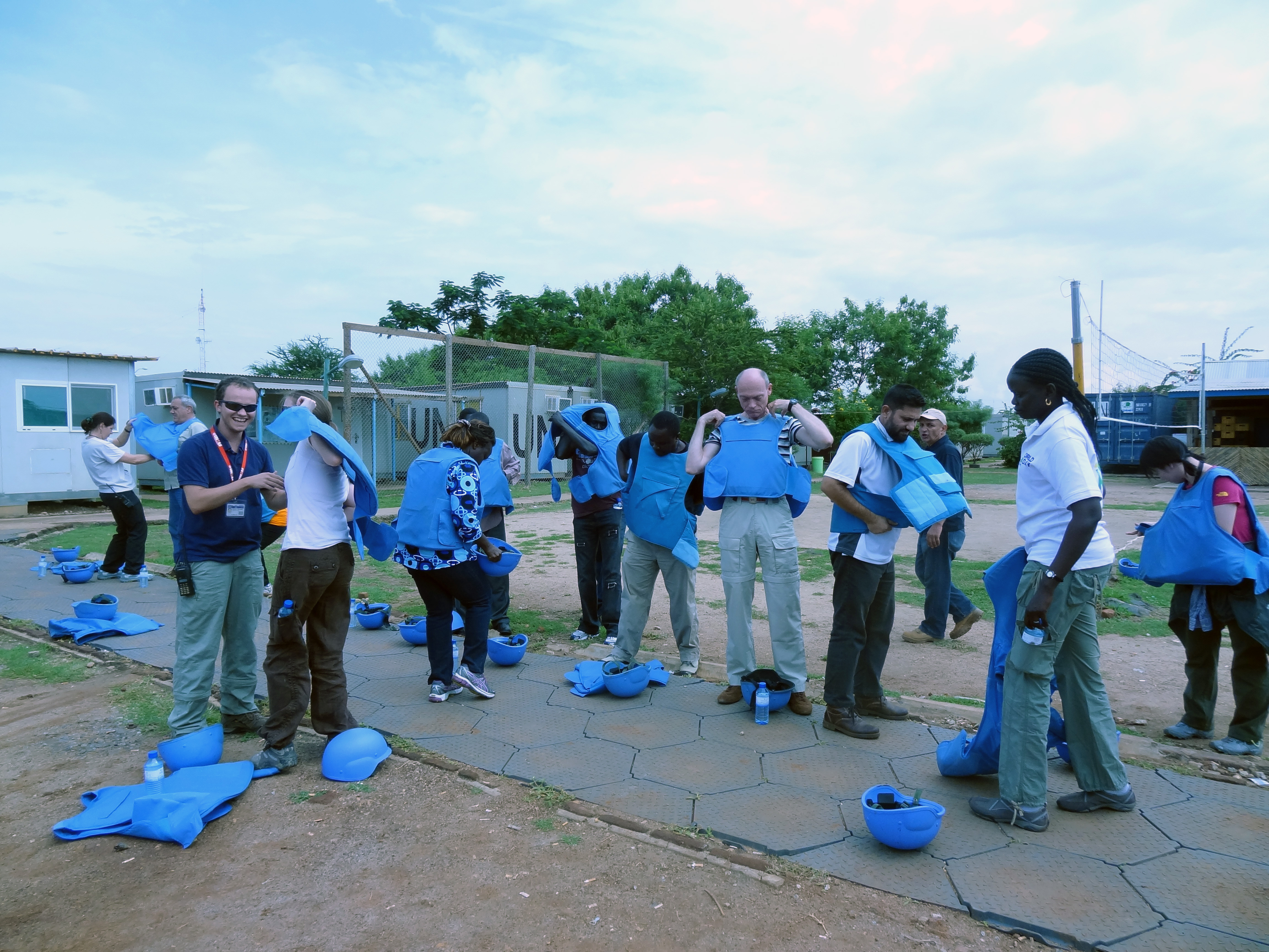 Het eerste wat we te doen kregen na aankomst in Juba was het volgen van een veiligheidstraining. Niet even een ochtend of middag, maar gelijk drie dagen training bij de VN-missie in Zuid-Sudan, UNMISS. Weliswaar geen militaire training, de training was bedoeld voor burgerpersoneel van de VN en ook toegankelijk voor NGO’s die in het land aan het werk zijn. Maar wel een training die gegeven werd door (voormalige) militaire trainers en dat was te merken. Ze hadden er duidelijk lol in om af en toe over hun militaire verleden te vertellen of even te doen alsof ze voor een groep militairen stonden. Ik heb het maar genegeerd, verder waren ze wel aardig…
