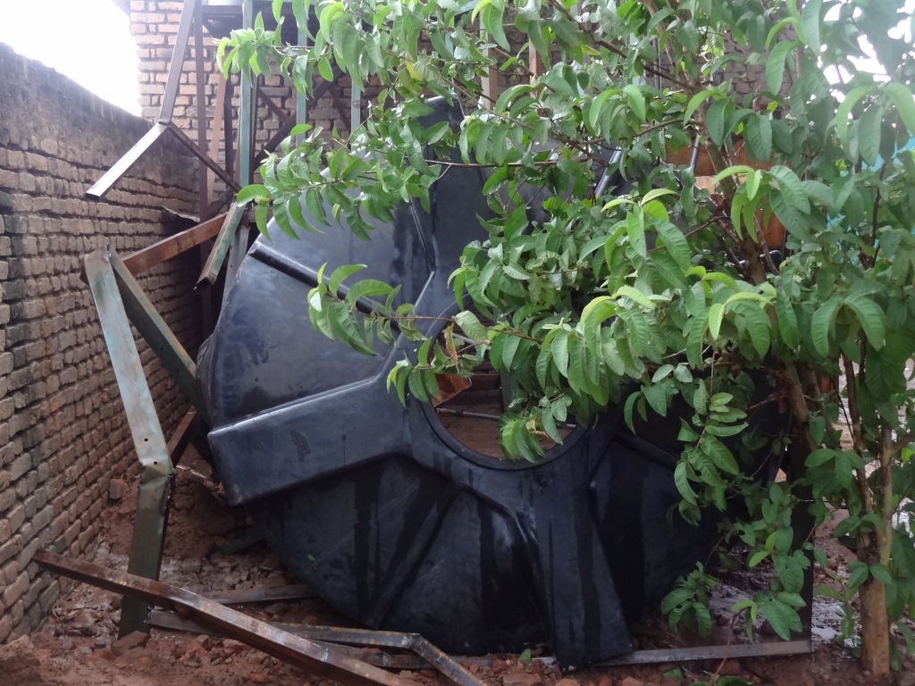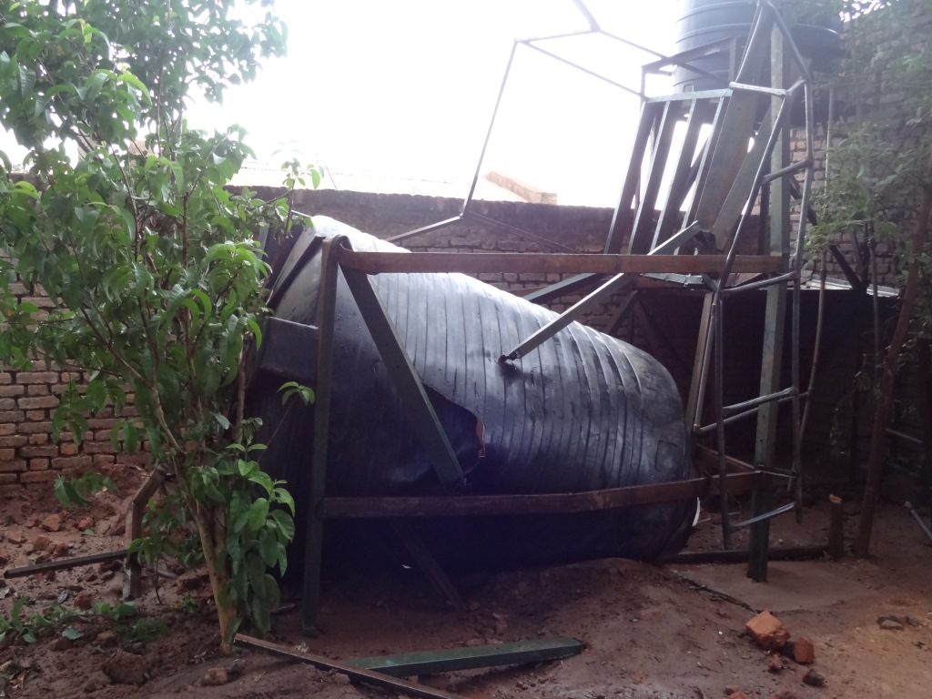 Het water kwam gisteravond. De waterwagen stond voor de muur en zoals gebruikelijk klom één van de twee mannen die dat komen brengen naar boven om de slang in de tank te hangen. Pomp aanzetten en vullen maar. Dat ging goed totdat de nieuwe tank bijna vol was. Een luid gekraak en de stellage bezweek onder het gewicht van de volle tank. Verbogen staal, gesprongen lasnaden, gescheurde tank, 5.000 liter water die in een grote golf over een modderig erf stroomt. Puinhoop.
