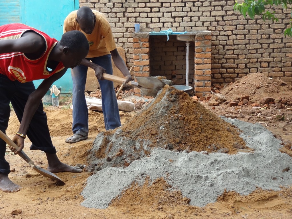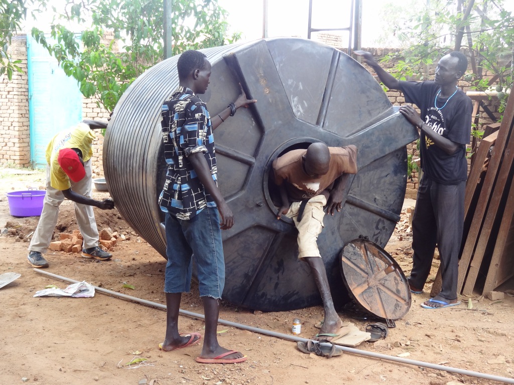 Het grind dat door het cement heen moest werd ter plaatse in kleine stukken gehakt (van het restant van onze verharding dat uit de gaten was gekomen, ruimt tenminste een beetje op). Geen betonmolen natuurlijk, dus het cement werd met een schep gemengd. Ze zijn opnieuw de hele dag bezig geweest, maar toen stond de stellage dan ook. Werd maandag vervolgd met de komst van de watertank. De aansluiting op de waterleiding werd gemaakt door een staaf te verhitten in een houtskoolvuurtje en het plastic van de tank te smelten op de plaats waar de leiding doorheen moest. Vervolgens kroop er iemand in de tank om de aansluiting van binnen af te dichten. Dan nog met een paar man de tank op de stellage zetten, de leiding aan de andere kant aansluiten en toen was het wachten op het water.