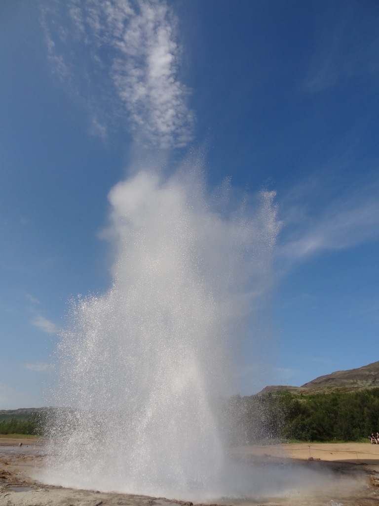 De afgelopen weken in IJsland was dat heel anders. Water is overal, in alle mogelijke vormen. Stromend water in de vorm van rivieren, beekjes en watervallen, meestal zo schoon dat het gewoon drinkbaar is. Water in vaste vorm als sneeuw en ijs op bergtoppen of gletsjers. Water in de vorm van stoom die overal uit de grond komt, het spectaculairst om te zien. Water wordt ondergronds opgewarmd tot boven het kookpunt en spuit uit geisers, dampt uit gaten of scheuren in de grond of borrelt in een poeltje kokend water. De gevolgen hiervan zijn overal in het landschap zichtbaar. Als het water zo warm opborrelt, stinkt het meestal vreselijk omdat er zwavel (eigenlijk waterstofsulfide) in is opgelost. Ooit rotte eieren geroken? Zo dus. Dat hete water wordt in veel hotels gebruikt om warme baden te creëren, heerlijk om op te warmen na een koude, winderige dag. Prima, maar we hebben gemerkt dat sommige hotels het ook uit de warme kraan laten stromen. Om te douchen niet zo’n probleem, maar om te drinken toch wel vies… Gelukkig gold dat niet voor het koude water, dat konden we zo uit de kraan drinken.