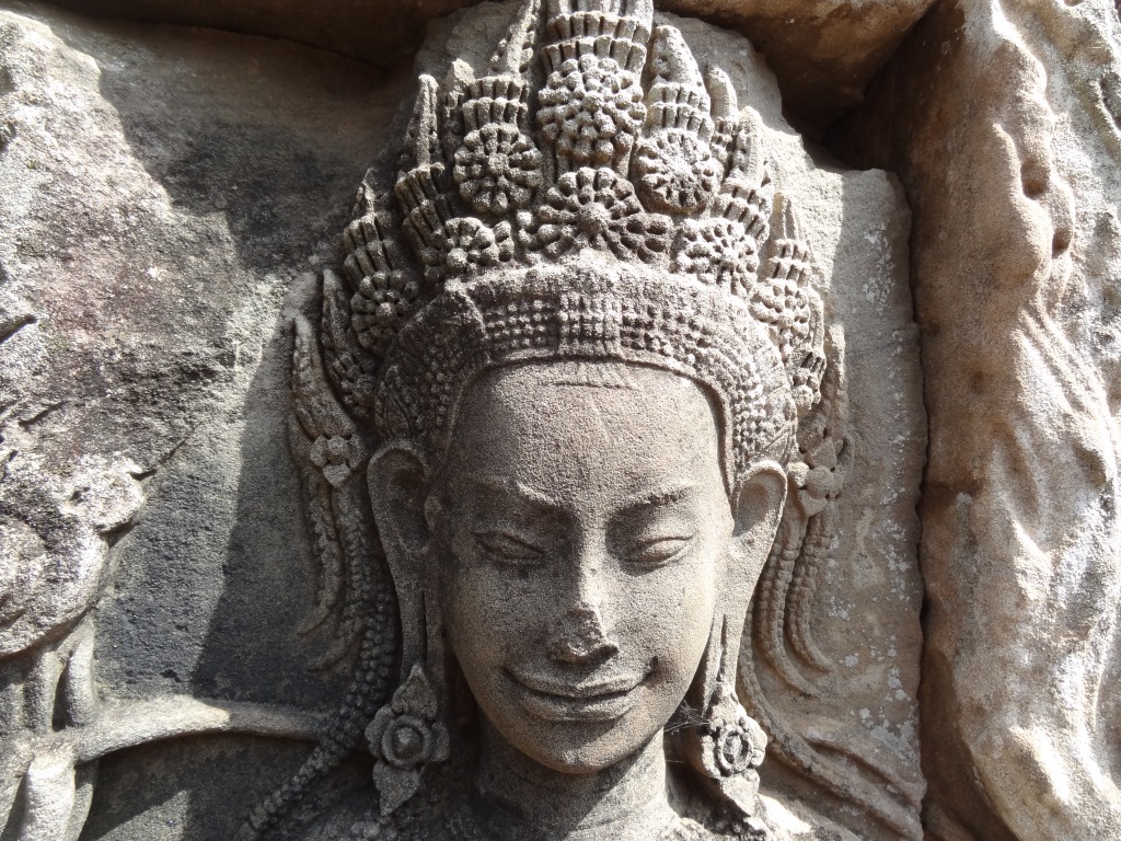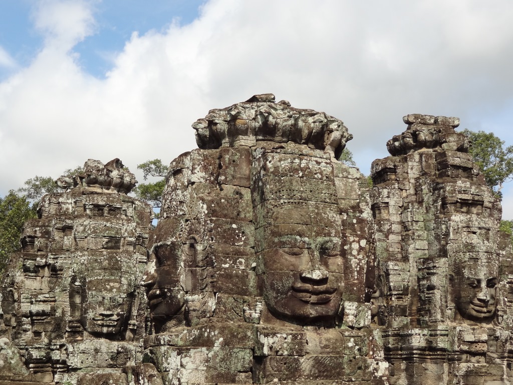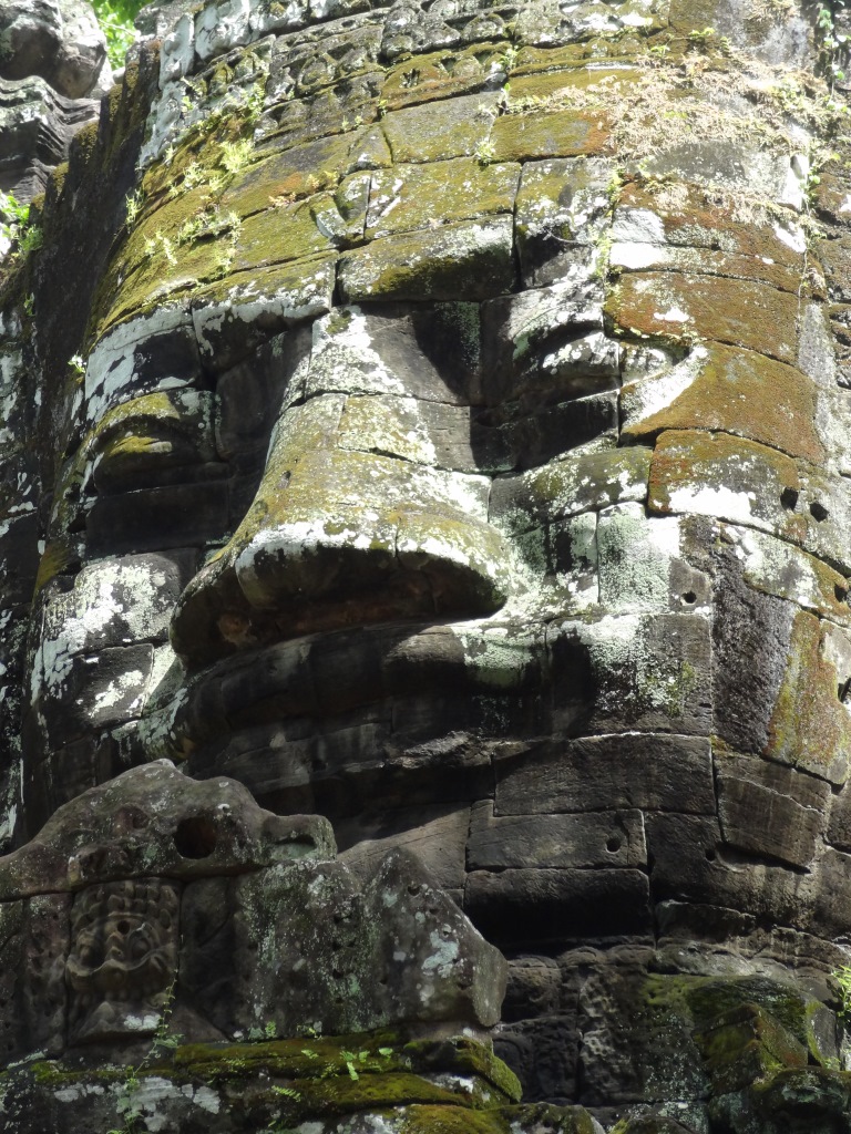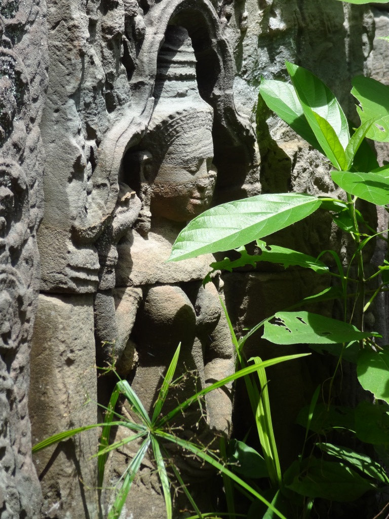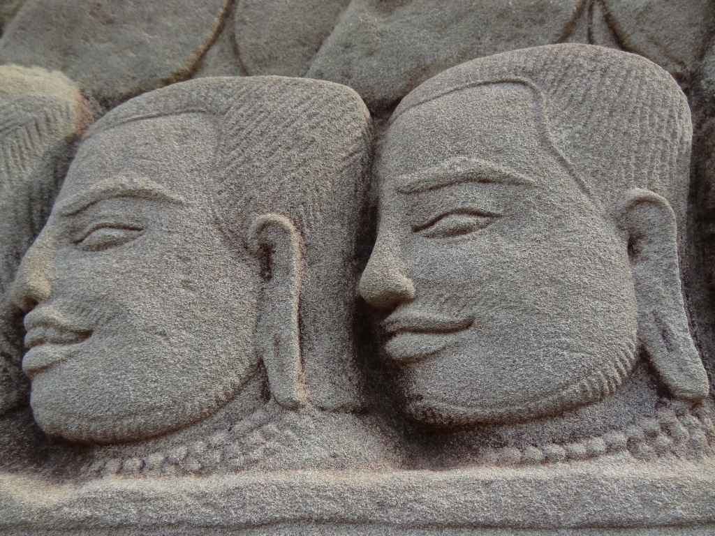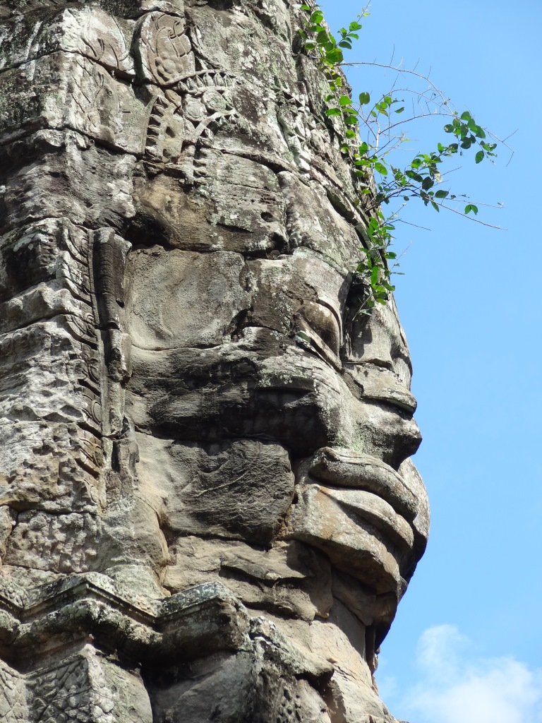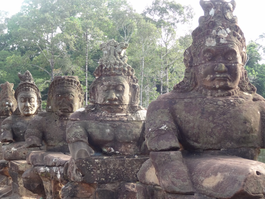Honderden ogen volgen je op je tocht door Angkor. Ogen, gezichten, uit steen gehouwen of in steen gekerfd, met grote lichamen of kleine figuurtjes. Goden en demonen, mensen en dieren zijn overal aanwezig. Prominent op de toegangspoorten, verstopt in de basis van een pilaar, de brug dragend of in de muren gebeiteld, overal wacht een nieuwe ontmoeting.