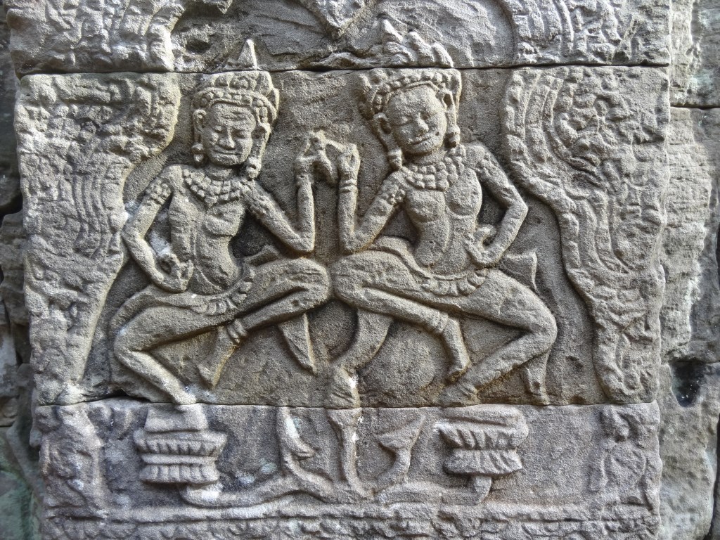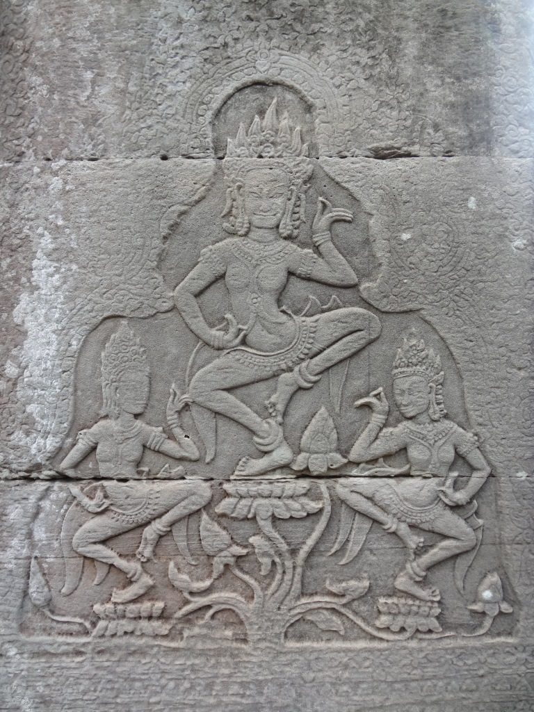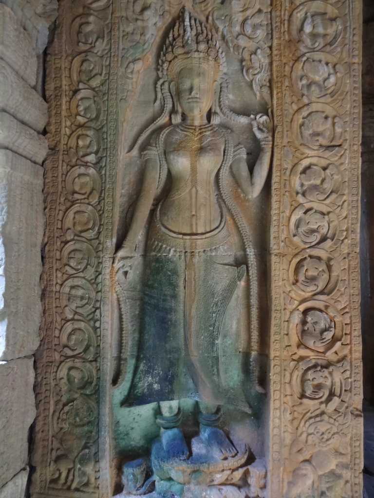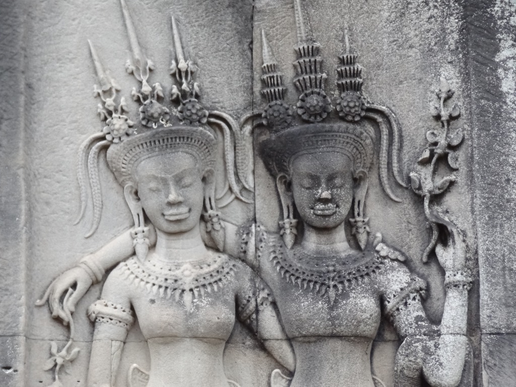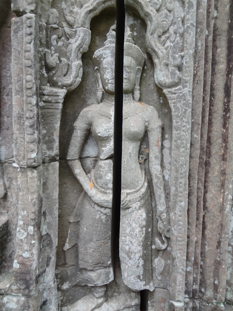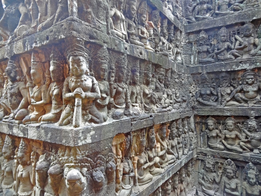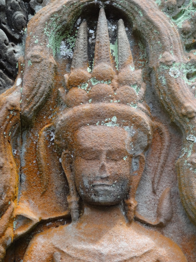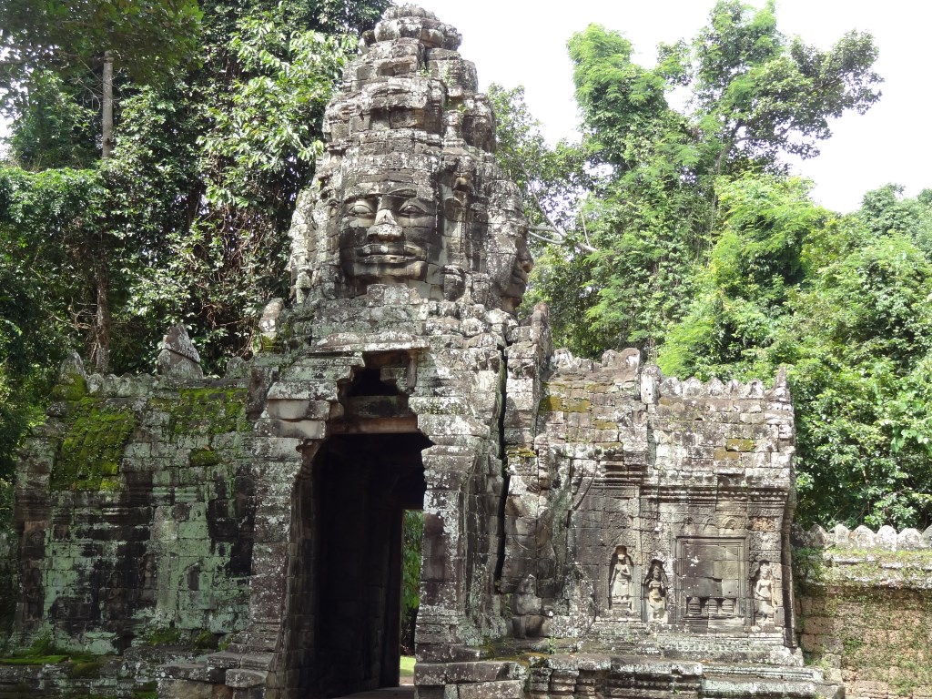 Honderden ogen volgen je op je tocht door Angkor. Ogen, gezichten, uit steen gehouwen of in steen gekerfd, met grote lichamen of kleine figuurtjes. Goden en demonen, mensen en dieren zijn overal aanwezig. Prominent op de toegangspoorten, verstopt in de basis van een pilaar, de brug dragend of in de muren gebeiteld, overal wacht een nieuwe ontmoeting.