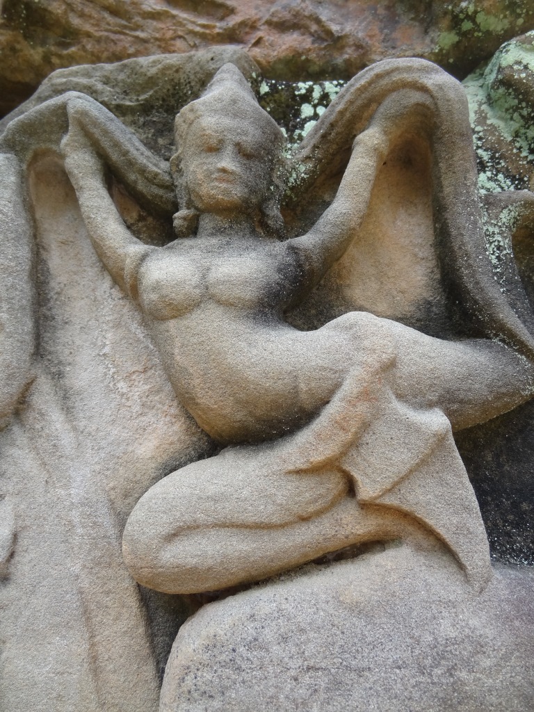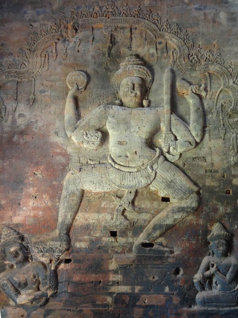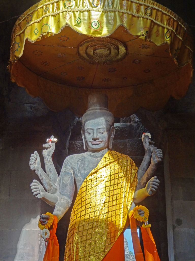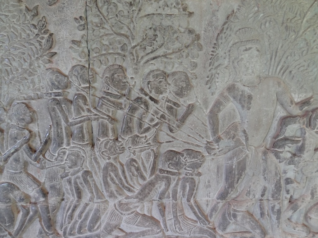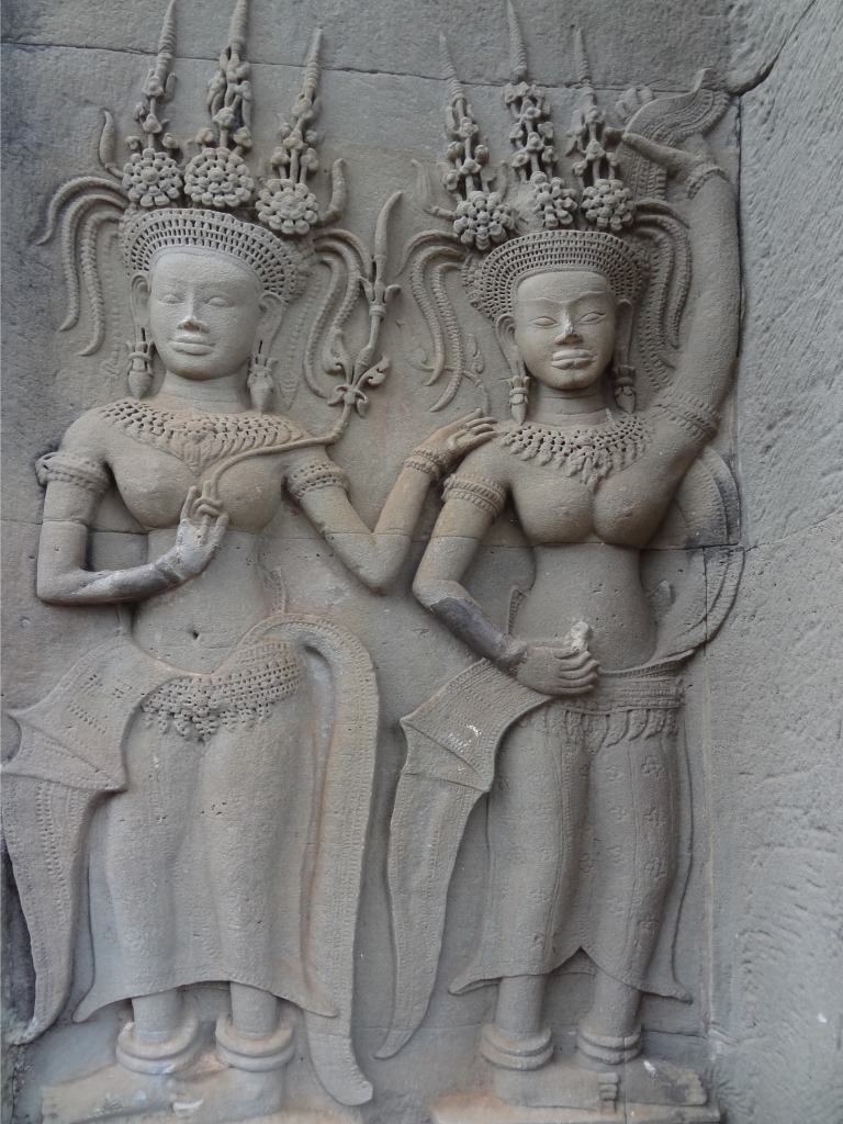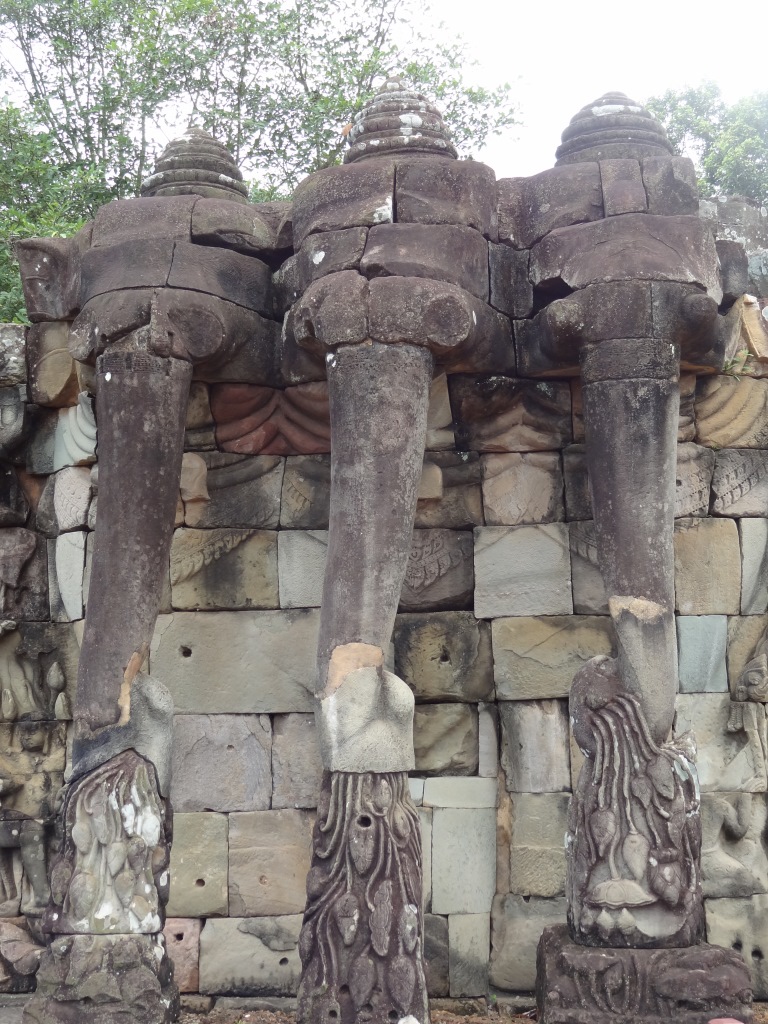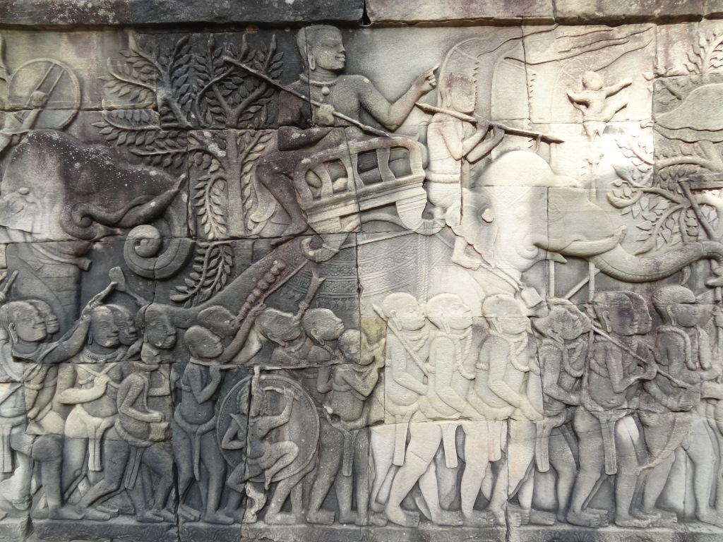 Honderden ogen volgen je op je tocht door Angkor. Ogen, gezichten, uit steen gehouwen of in steen gekerfd, met grote lichamen of kleine figuurtjes. Goden en demonen, mensen en dieren zijn overal aanwezig. Prominent op de toegangspoorten, verstopt in de basis van een pilaar, de brug dragend of in de muren gebeiteld, overal wacht een nieuwe ontmoeting.