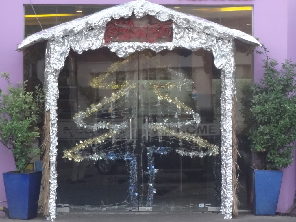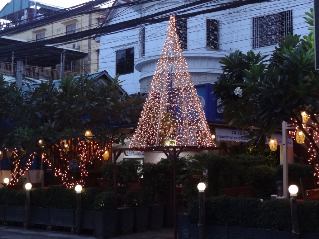 Ruim 95% van de bevolking in Cambodja is boeddhistisch en dat is ook de staatsreligie. Kerstmis is dus iets wat de Cambodjanen niet vieren. Geen vrije dagen, geen kerstbomen of kerstversiering, geen feestjes met de familie of naar de kerk. Nou is het ook lastig een kerstgevoel te krijgen als continu de zon schijnt en de temperatuur rond de 30 graden ligt, voor Cambodjanen zijn 25 en 26 december dagen als alle andere. Behalve hier in Phnom Penh. De stad, en zeker het deel waar wij wonen, telt zoveel expats dat kerst hier iets bijzonders begint te worden, wat ook echt zichtbaar is. De appartementencomplexen waar expats wonen hebben kerstversiering voor de deur en winkels proberen, meer of minder geslaagd, op de kerst in te spelen.