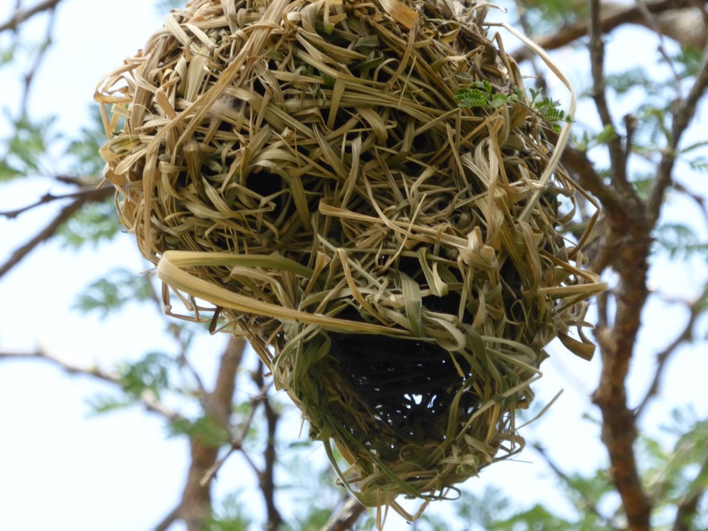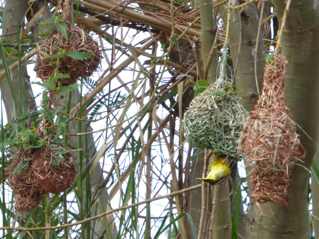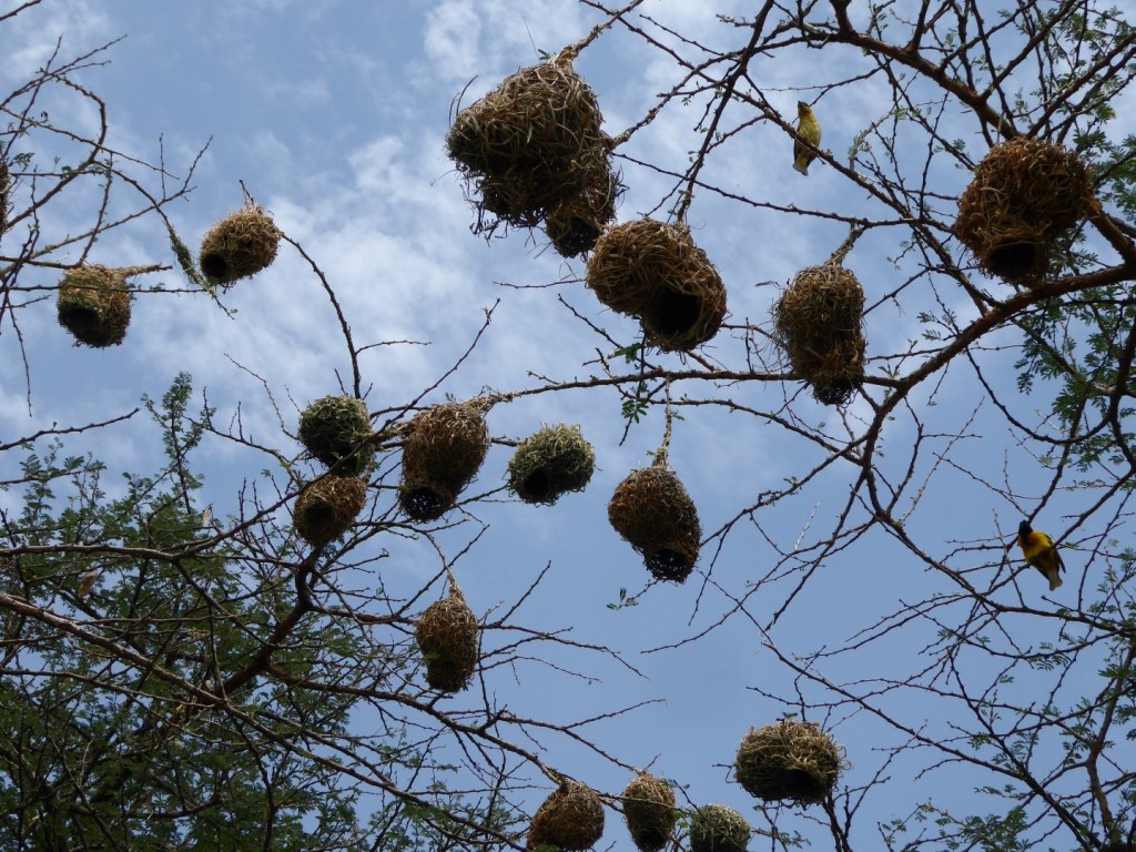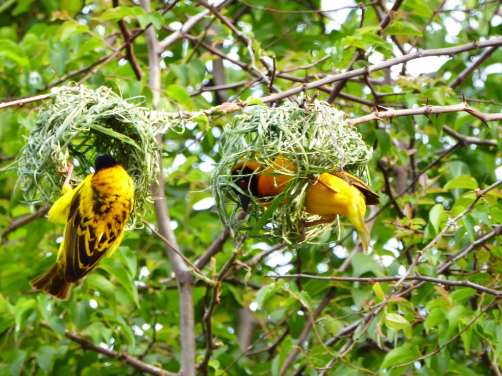 De kleurrijke mannetjes van de wevers bouwen (weven) ingenieuze nesten om de vrouwtjes te verleiden daar hun eitjes te leggen.