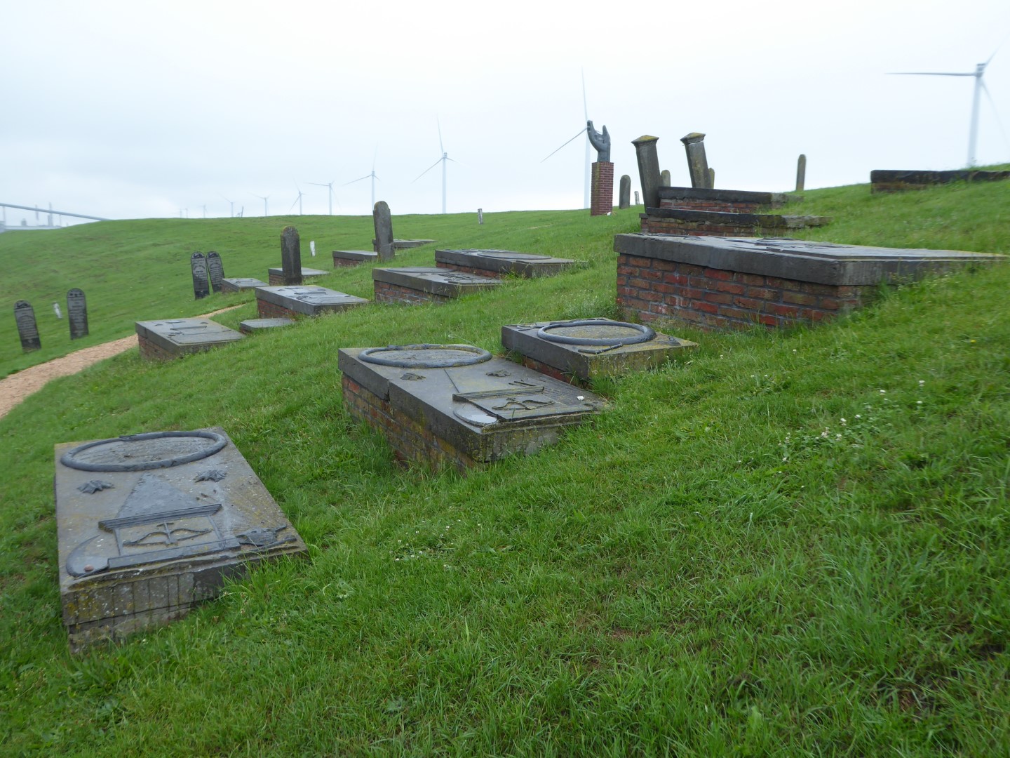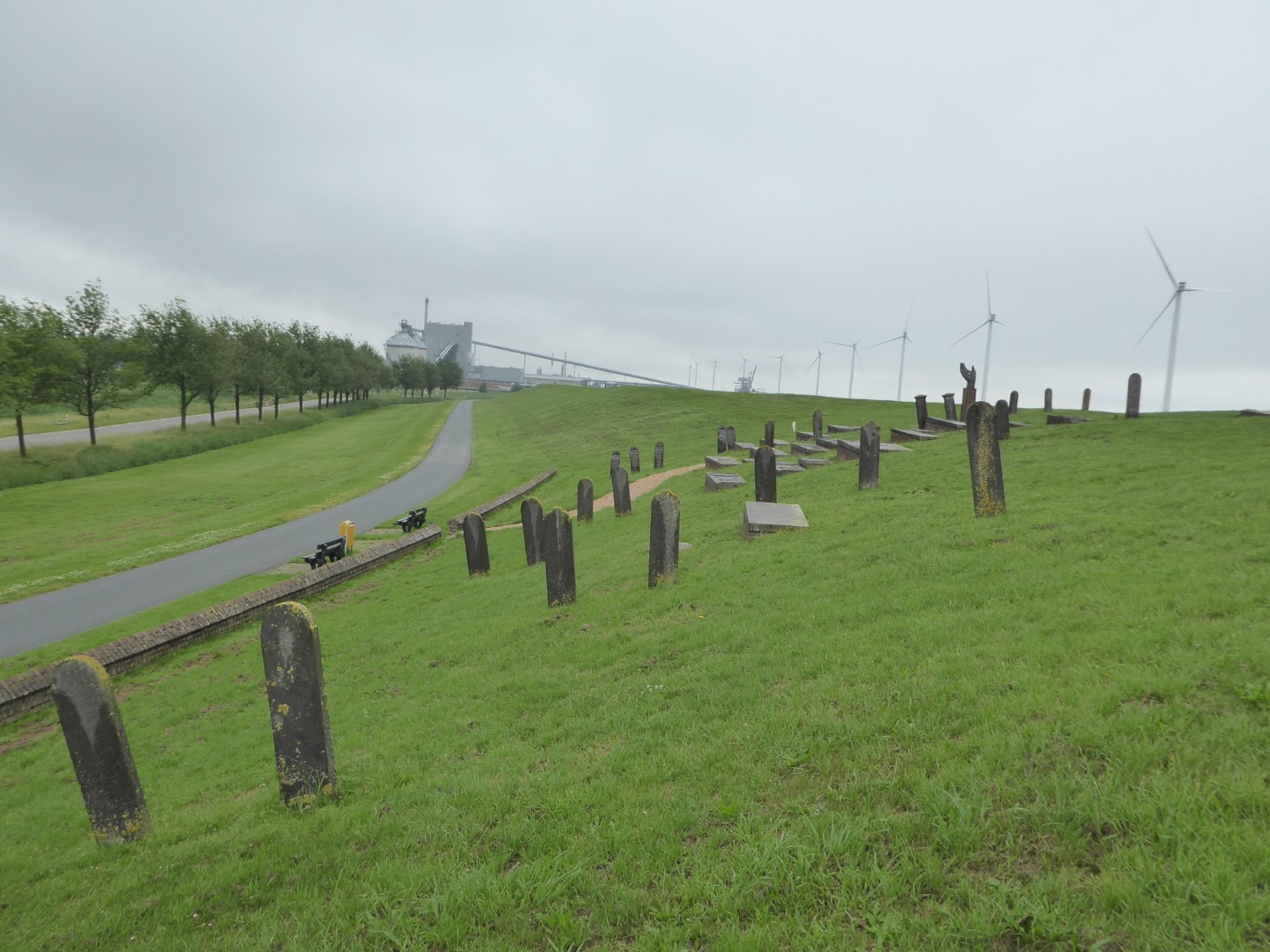 Voor de vergroting van de haven van Delfzijl, die uiteindelijk nooit plaatsvond, moest het hele dorp verdwijnen. Toen ook de dijk verhoogd moest worden om deze op delta-hoogte te krijgen, werden alle grafstenen verwijderd en bovenop de dijk weer terug geplaatst. Bij de begraafplaats werd een monument voor het verdwenen dorp geplaatst, waar het kerkje in de hand gehouden wordt. Oorspronkelijk van brons, maar na de diefstal is een kunststof replica geplaatst.