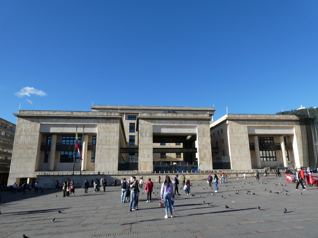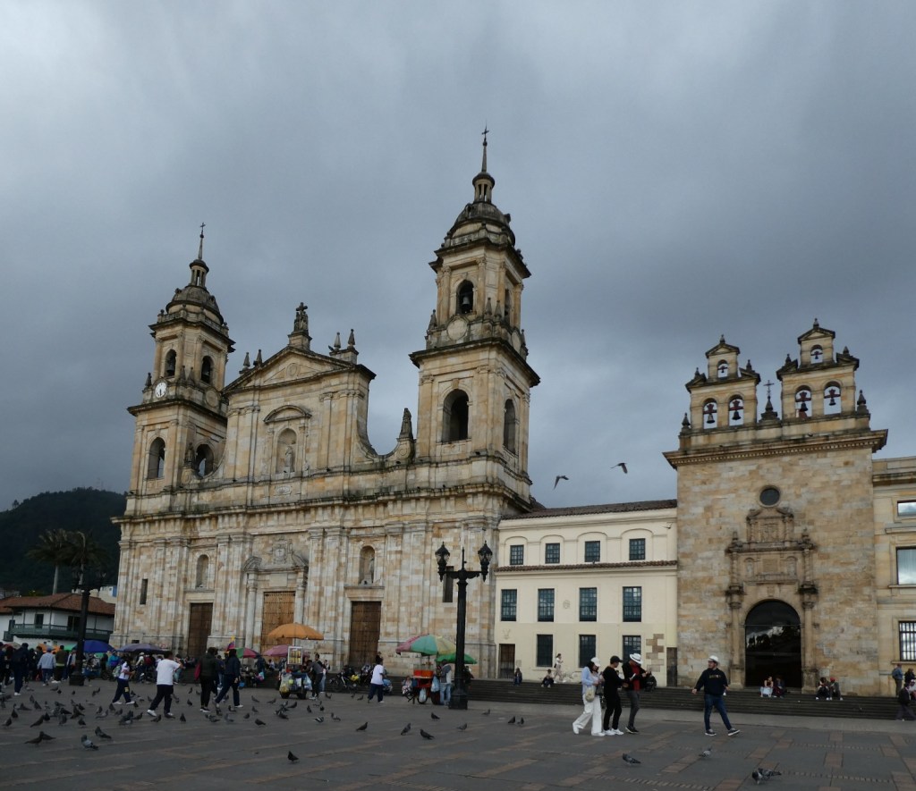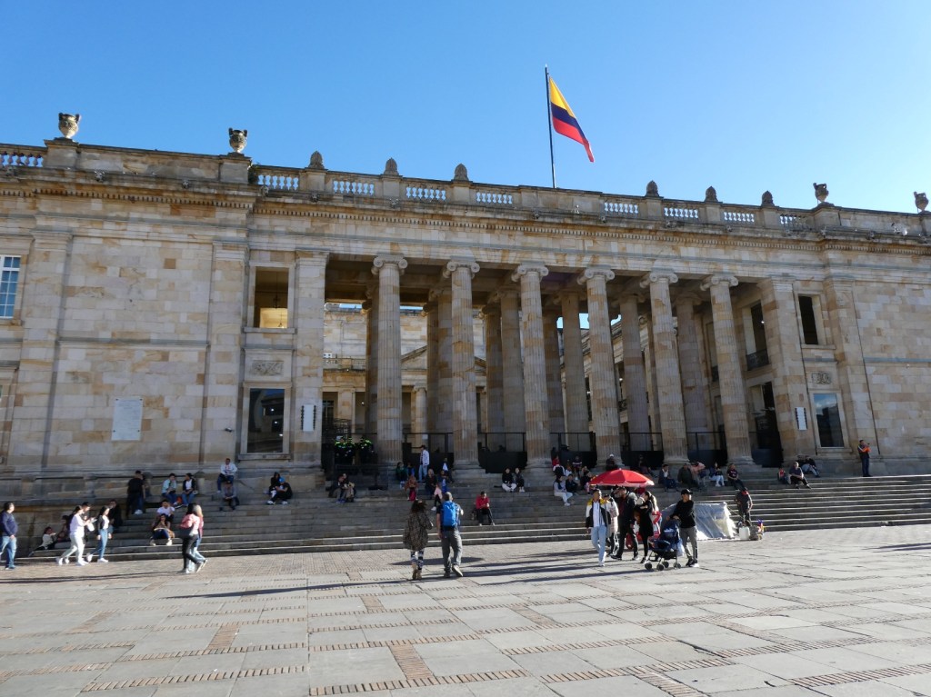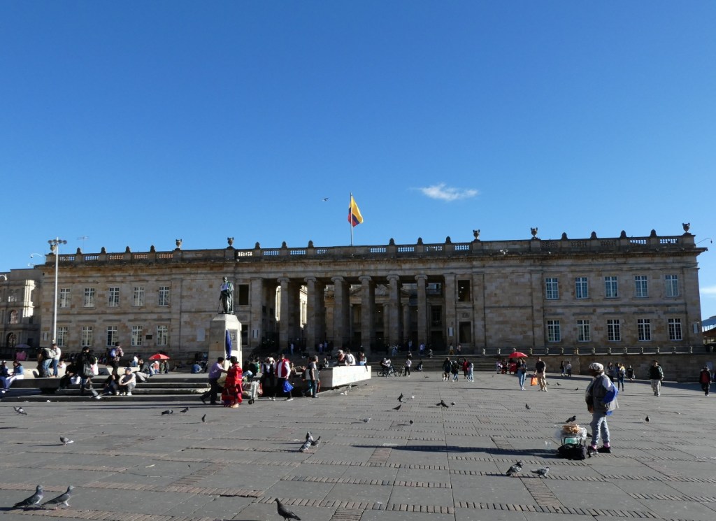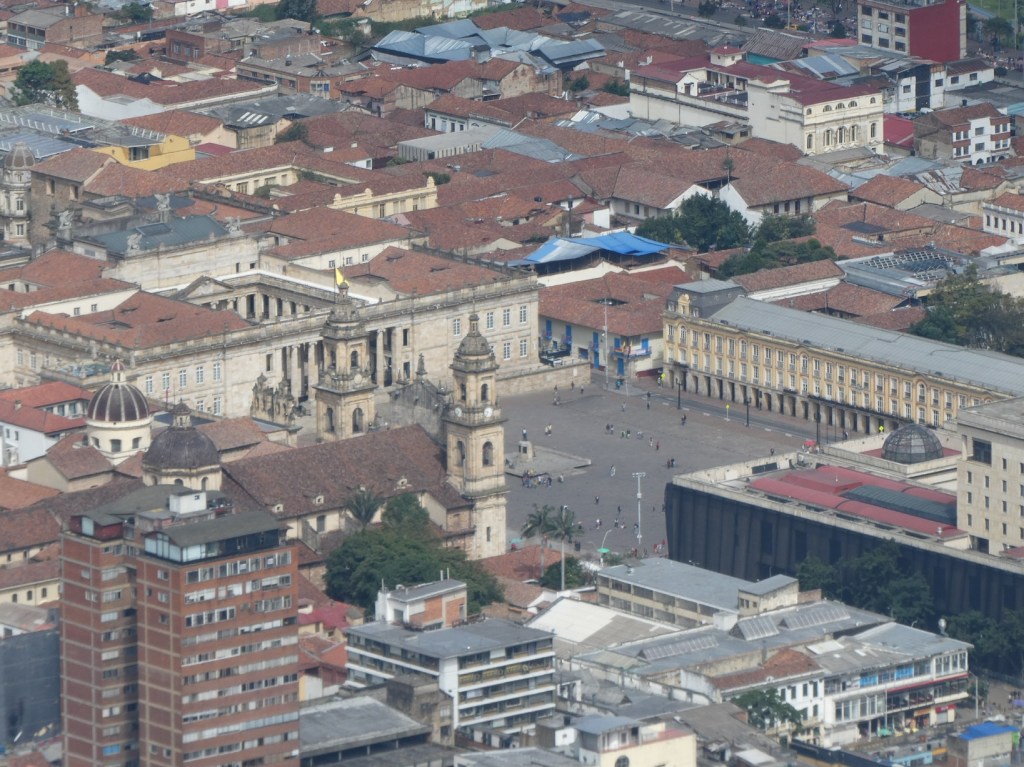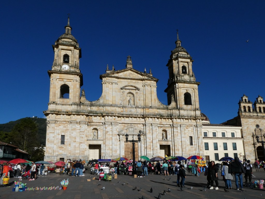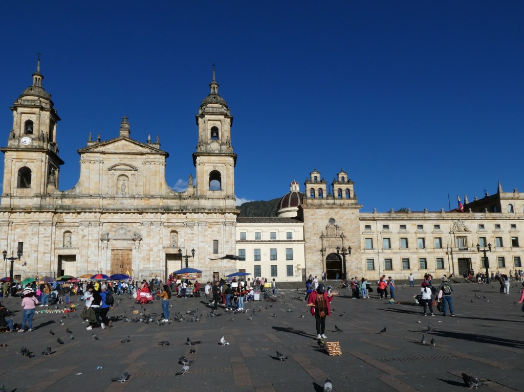 Plaza de Bolivar is het hart van Bogota, waar alle belangrijke gebouwen omheen staan. De kathedraal staat tegenover het gemeentehuis, het parlement tegenover het hooggerechtshof. En daartussen krioelt het aan het eind van de dag van de kraampjes, straatvoorstellingen en mensen die bedelen of gewoon met elkaar kletsen.