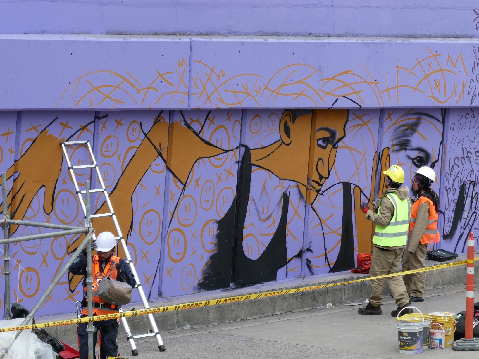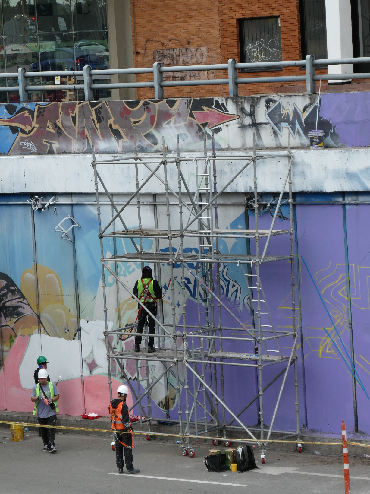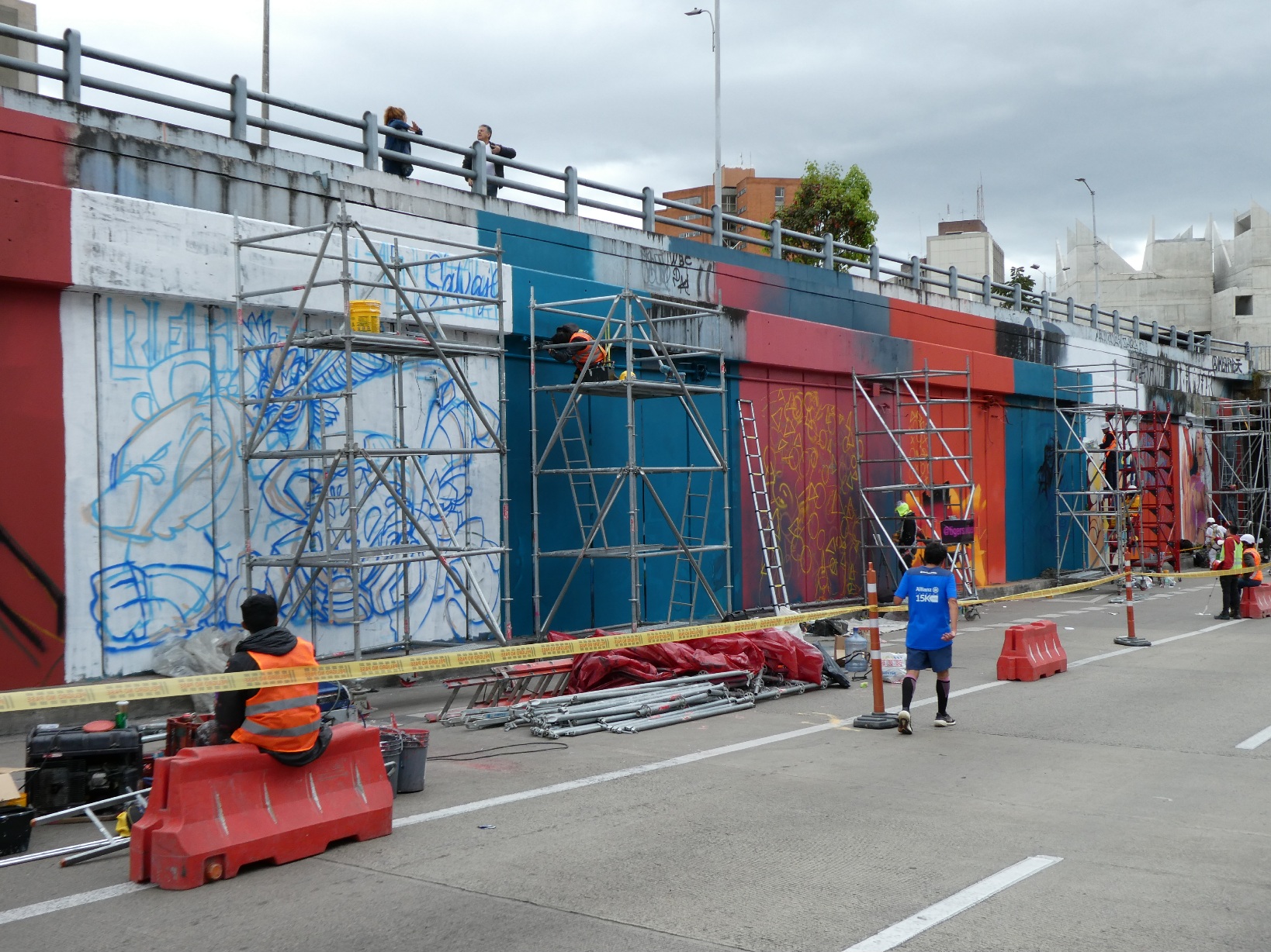 Dit gebeurt er dus in Bogotá als er nieuwe straatkunst gemaakt wordt. De weg wordt deels afgesloten, veiligheidsmaatregelen genomen, steigers gebouwd, en schilderen maar!