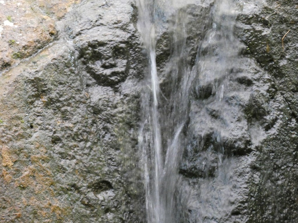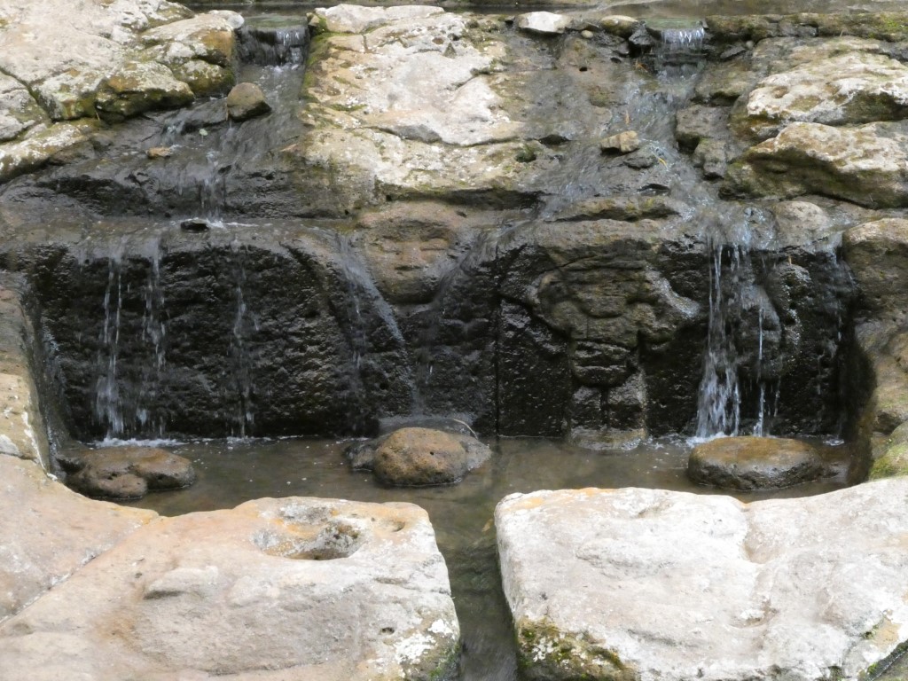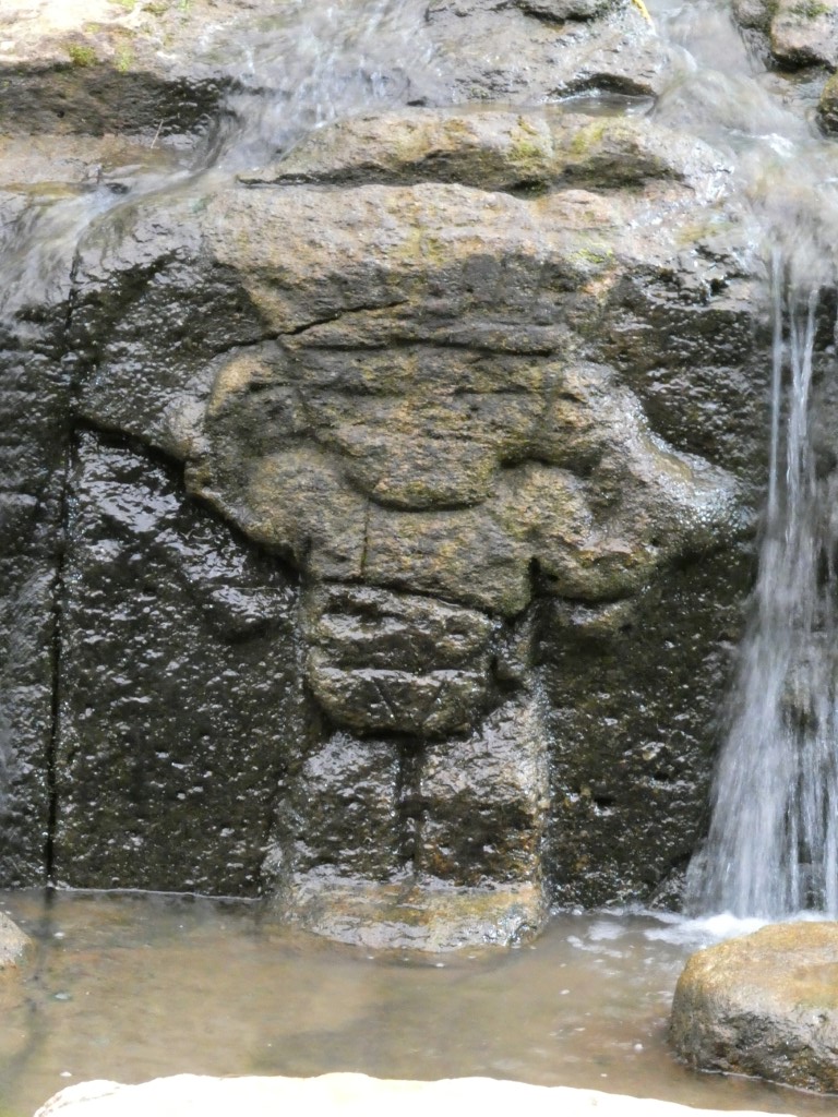 Vlak bij de bron staat een beeld van een kikker met de ogen gericht op de bron, als het ware op wacht.