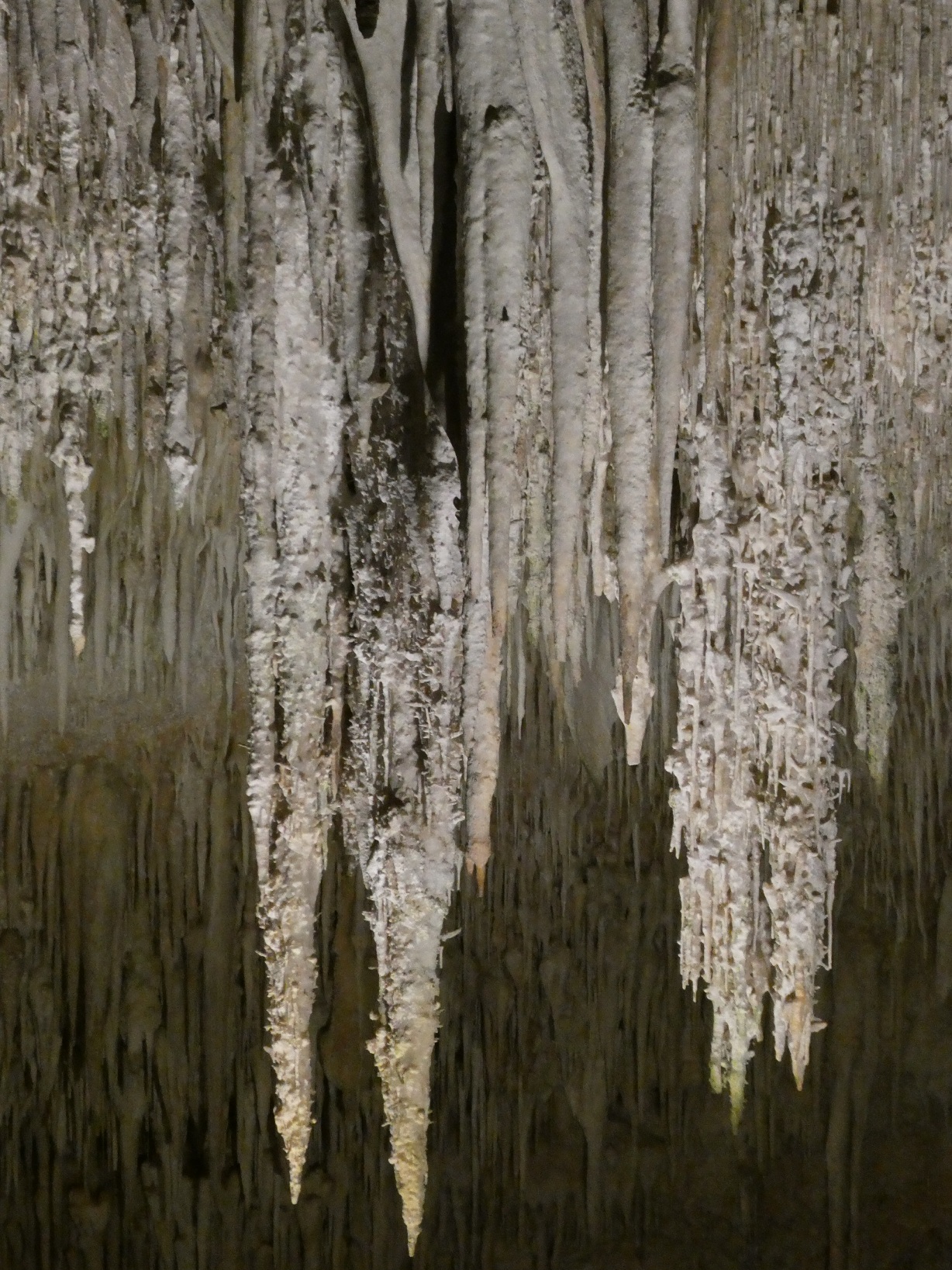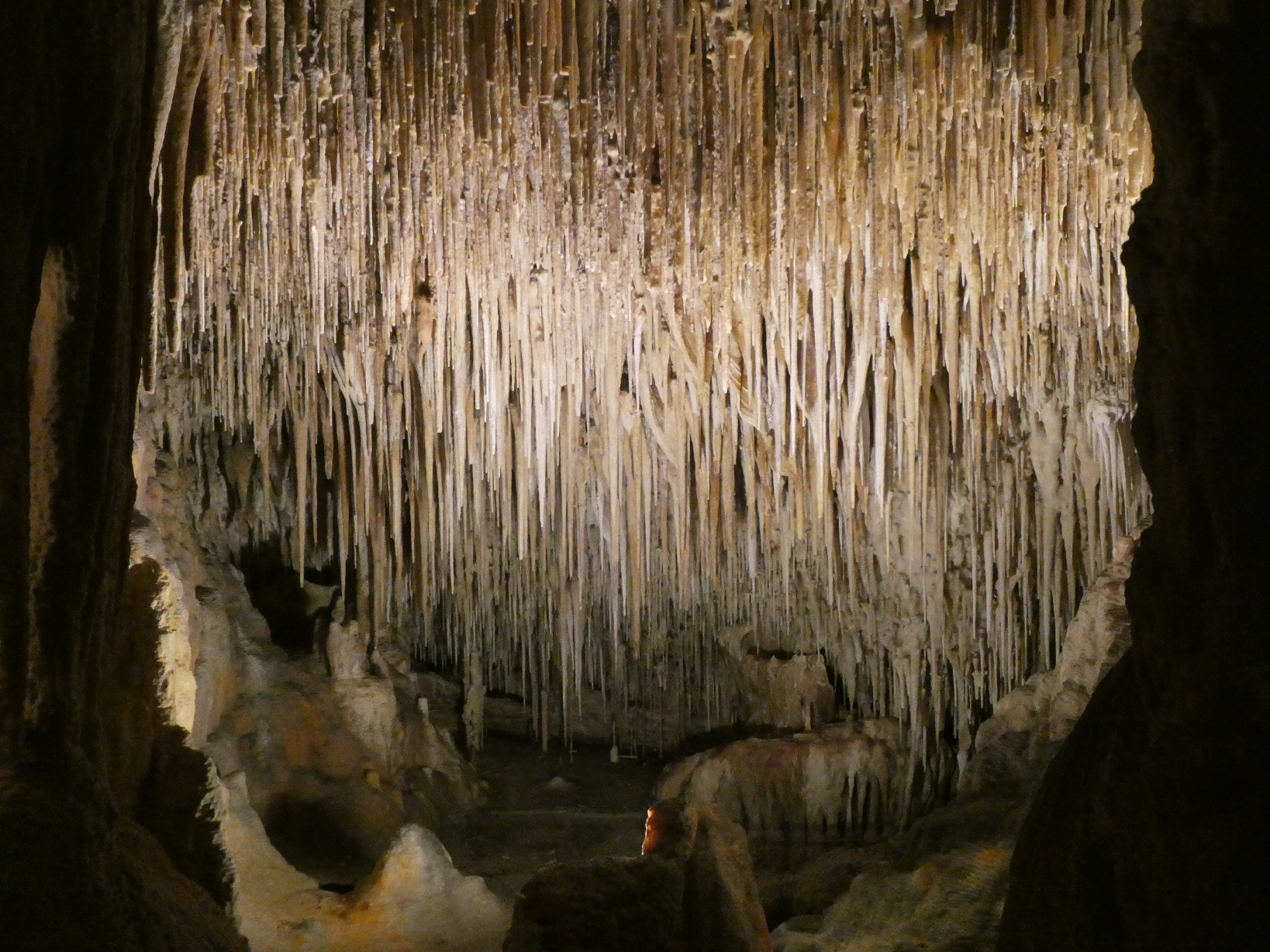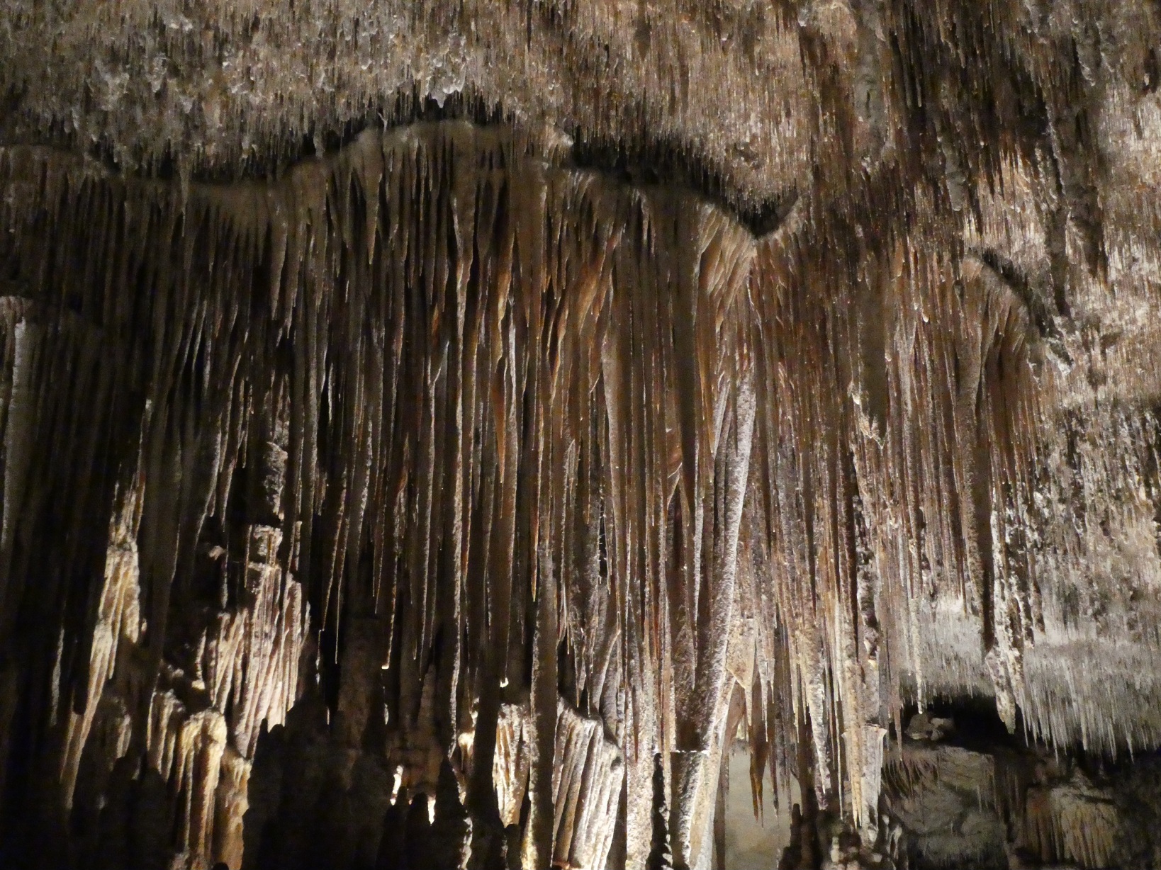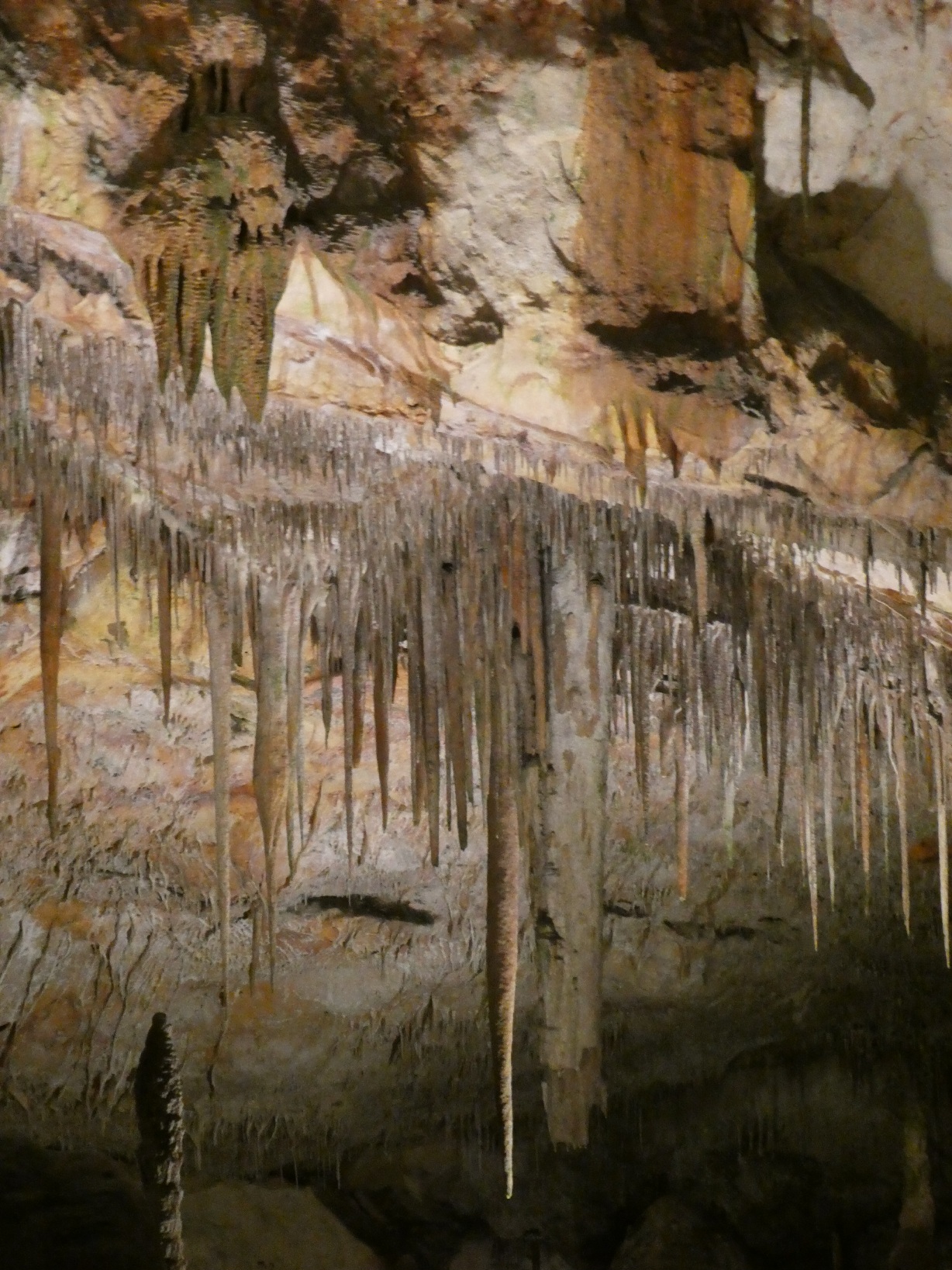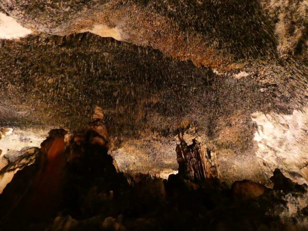 Het water dat naar beneden zakt neemt niet alleen kalk mee die de druipsteenfiguren creëert, maar ook mineralen en metalen. Als die zich op het plafond afzetten ontstaan de mooiste kleuren en patronen.
