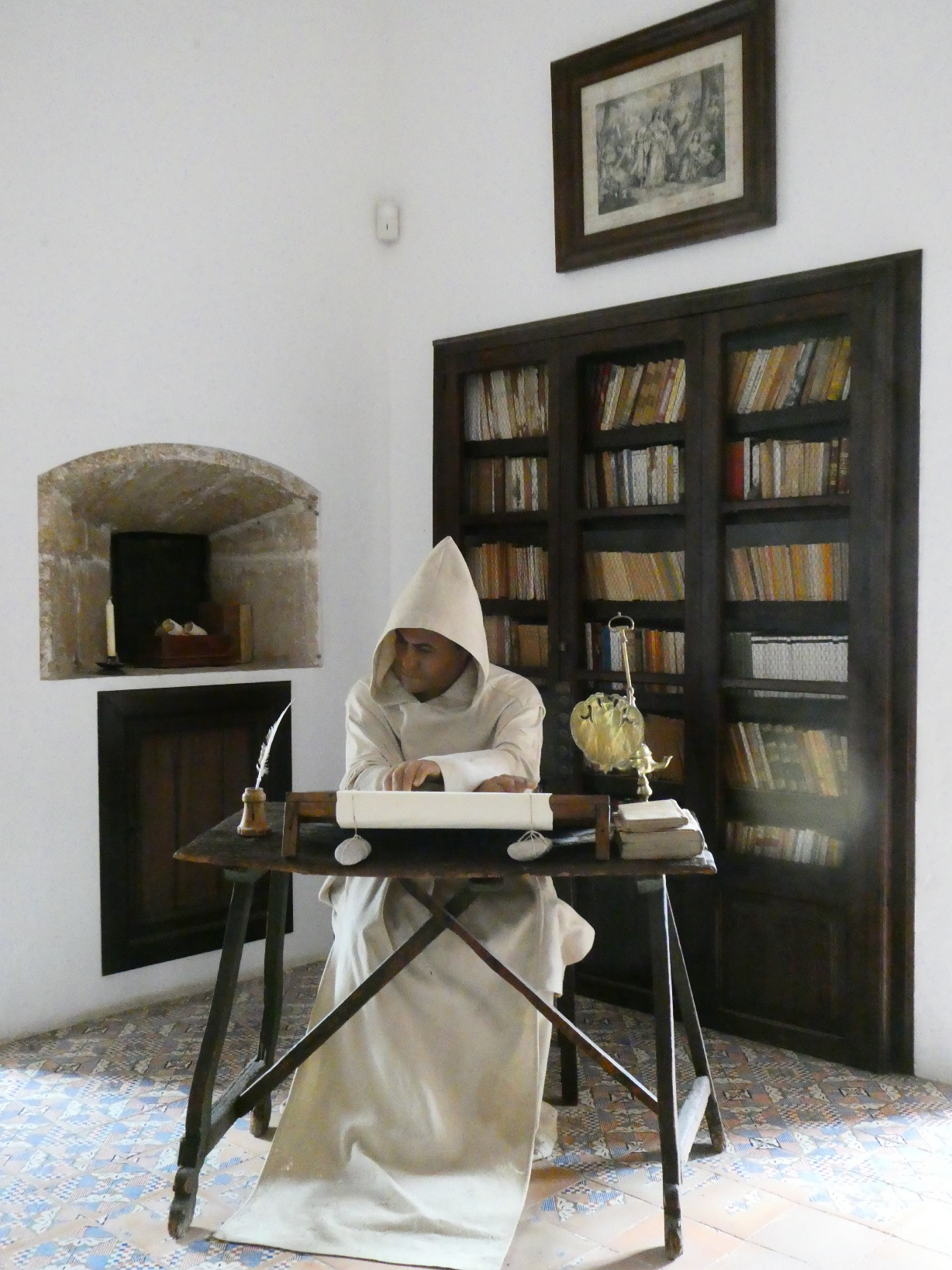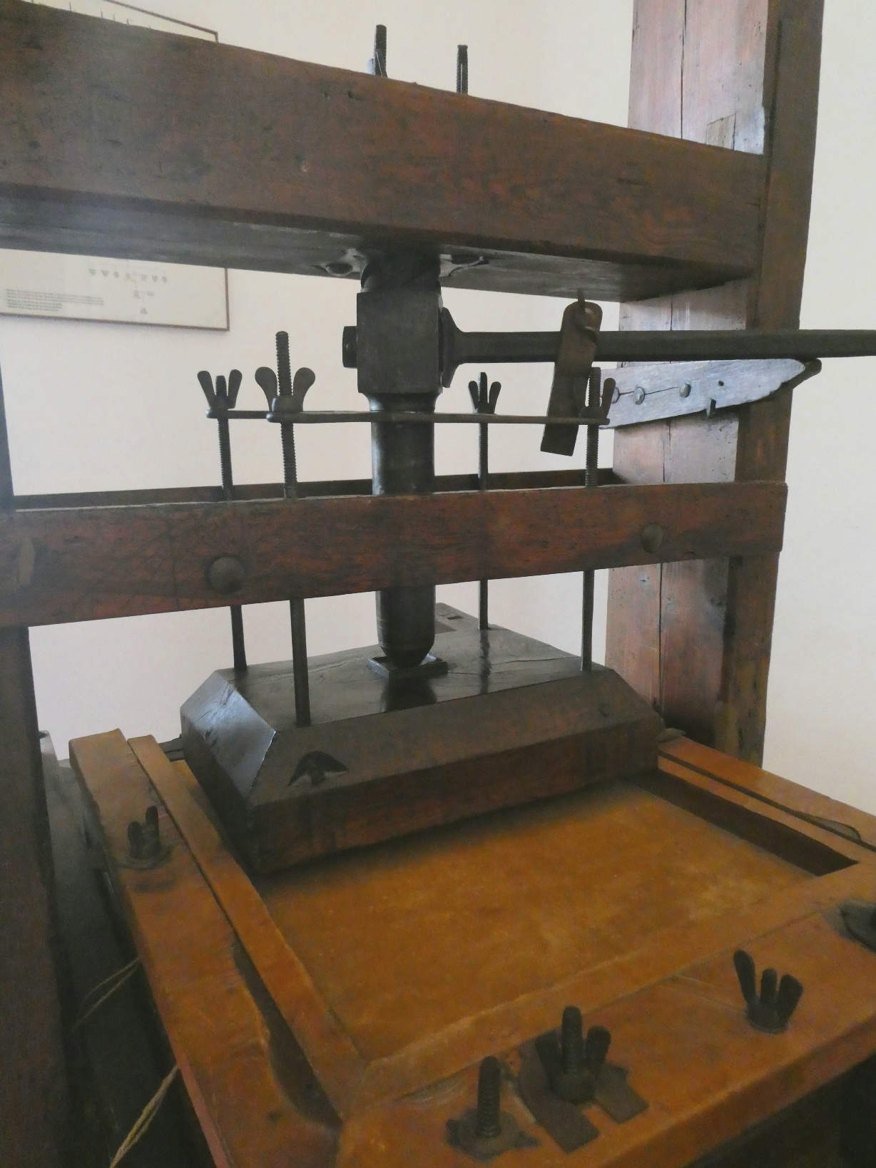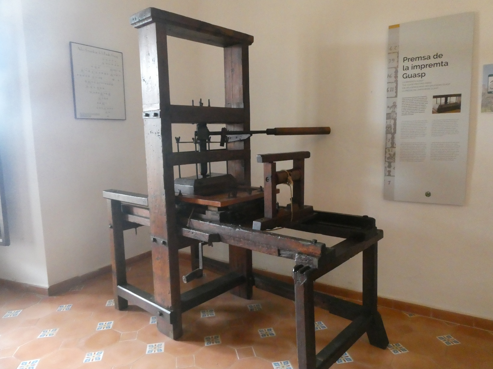 In één van de cellen staat een 17e eeuwse “Guasp” drukpers, met originele drukplaat en afdruk.