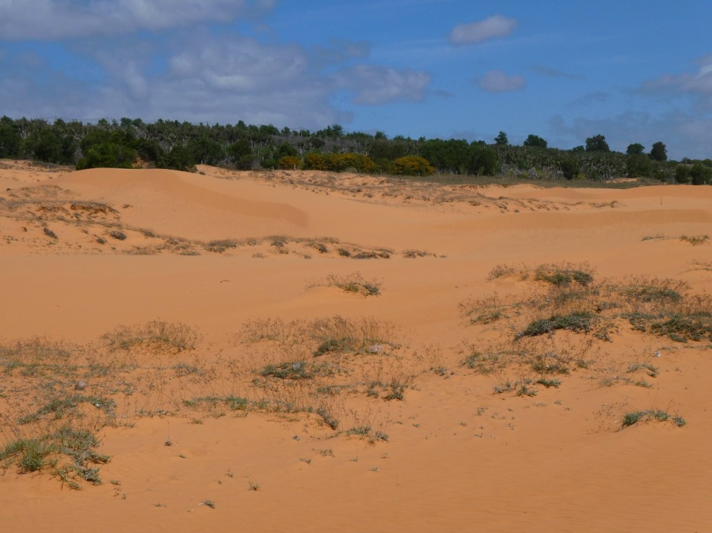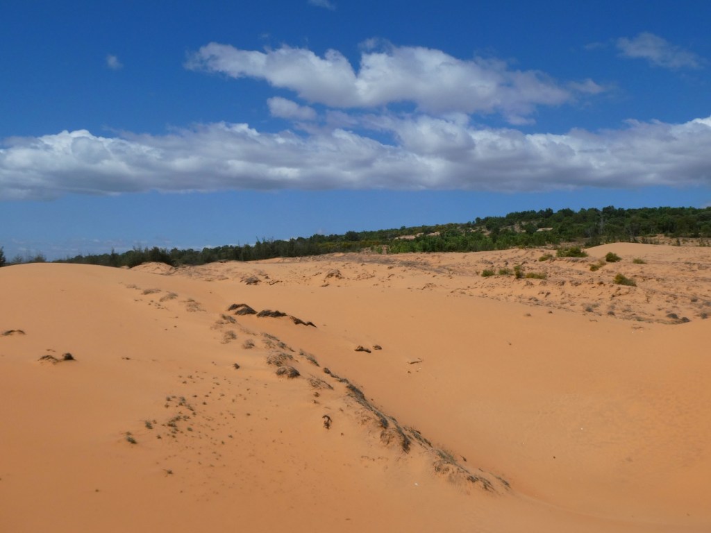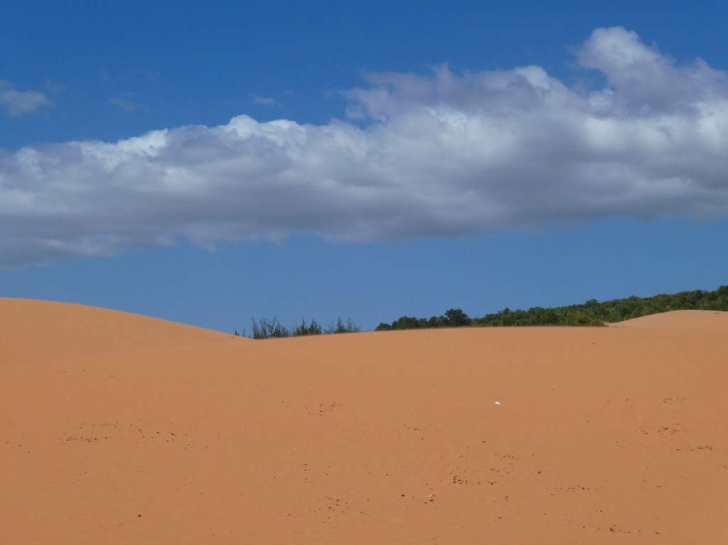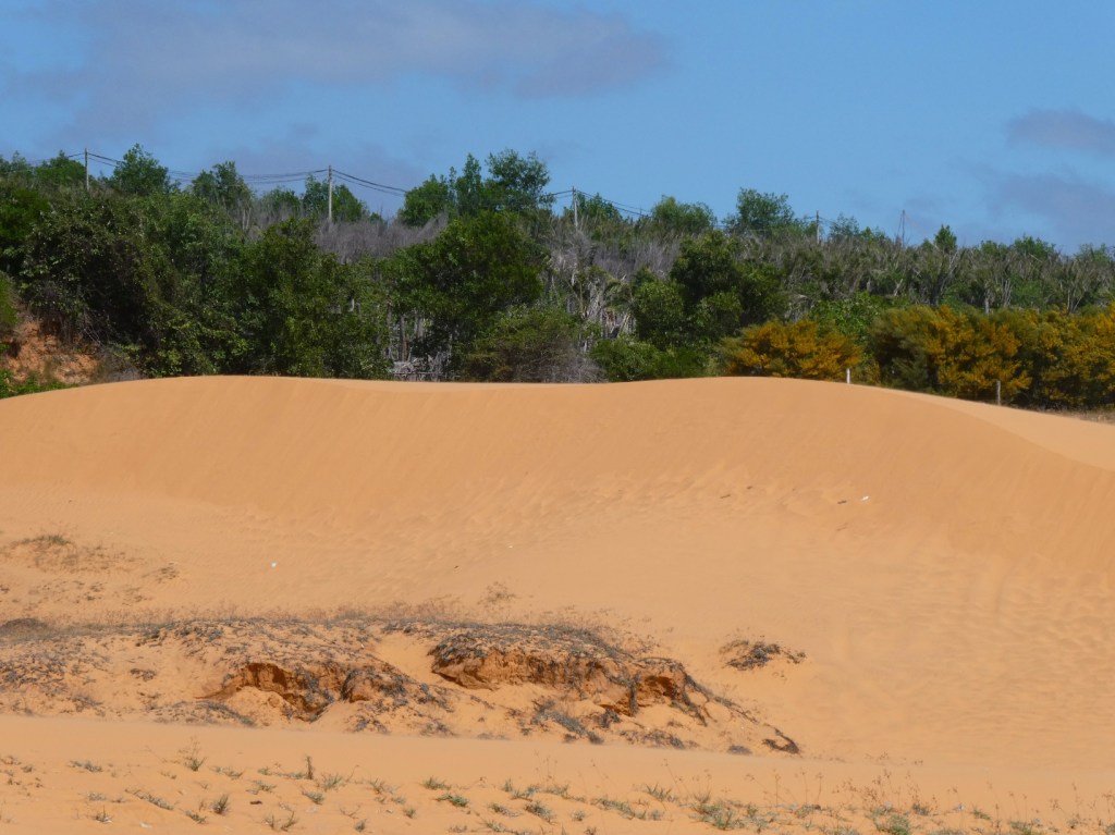 Meer geel dan echt rood, maar wel mooi. De duinen liggen vlak bij het dorpje Mui Ne en de strandresorts van Phat Thiet, en trekken daardoor veel toeristen. Op zich geen probleem, ze zijn groot genoeg, maar helaas leidt dat ook tot veel vervuiling met plasticafval. Jammer van het mooie gebied, misschien tijd om eens een grote opruimactie te organiseren?