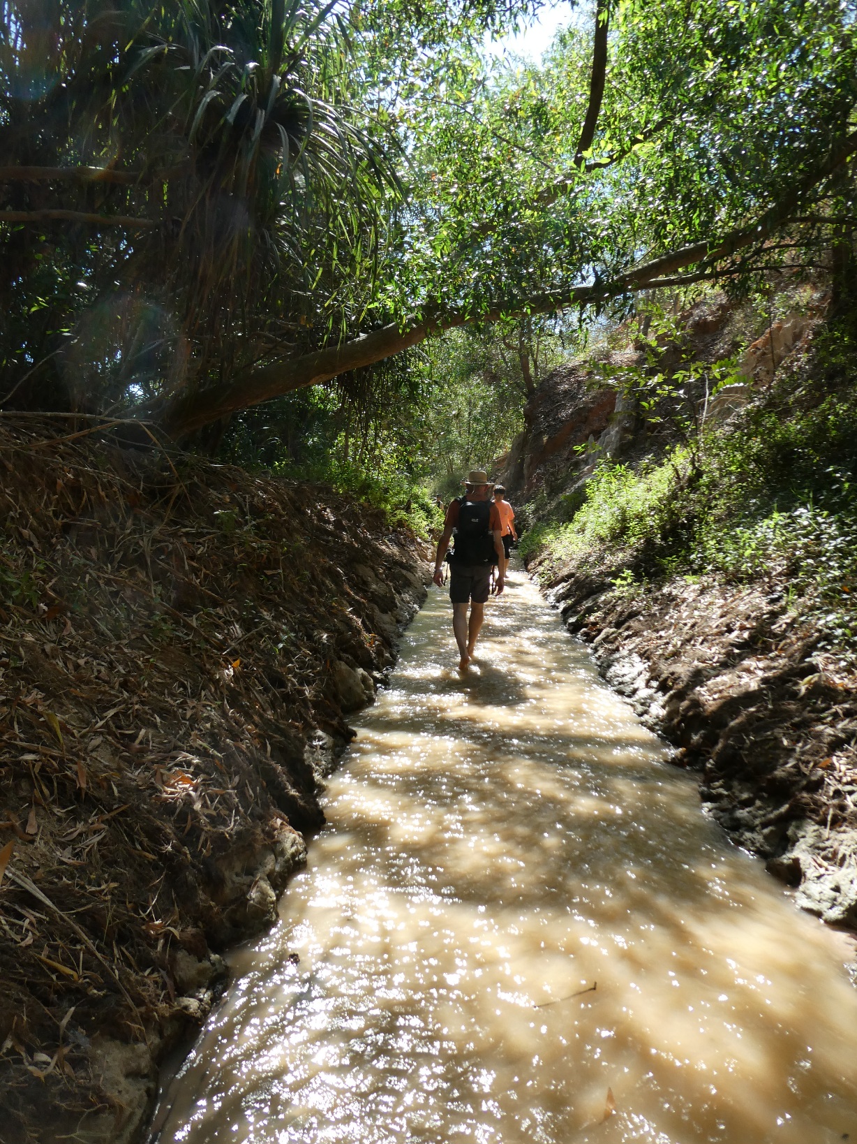 De enige manier om de gekleurde rotsen te zien is schoenen uit en door de beek lopen. Over het algemeen gaat dat prima, maar er zijn een paar plekken waar er meer stenen liggen.