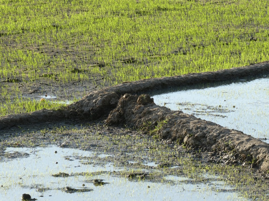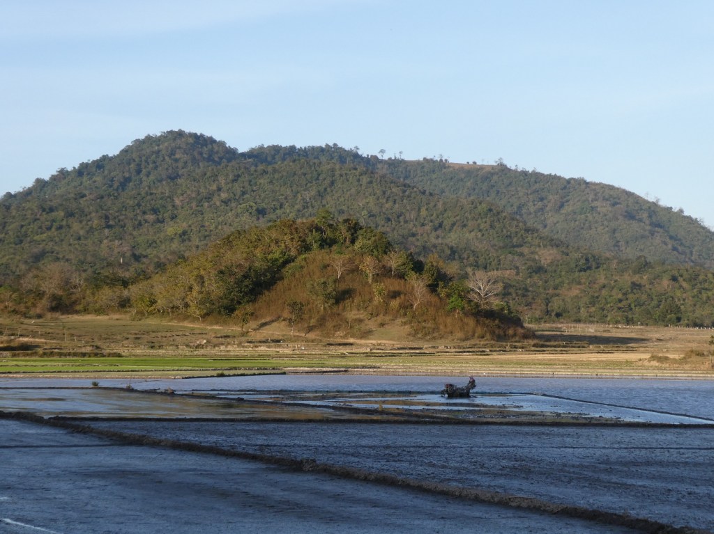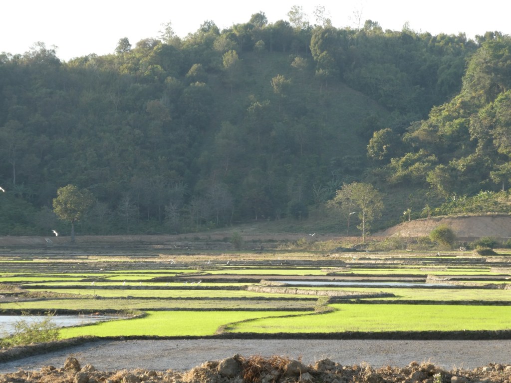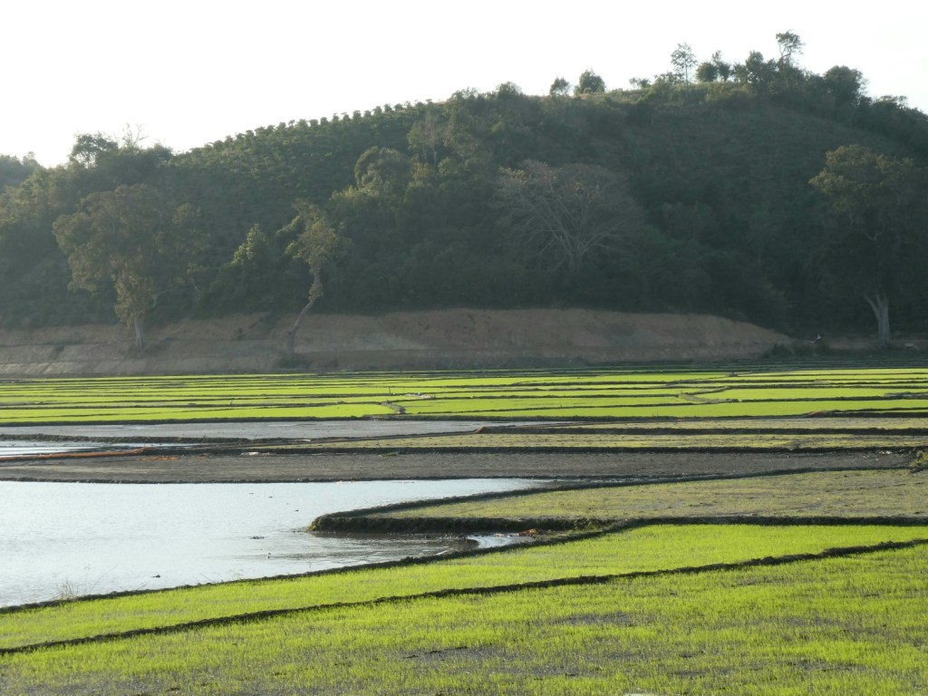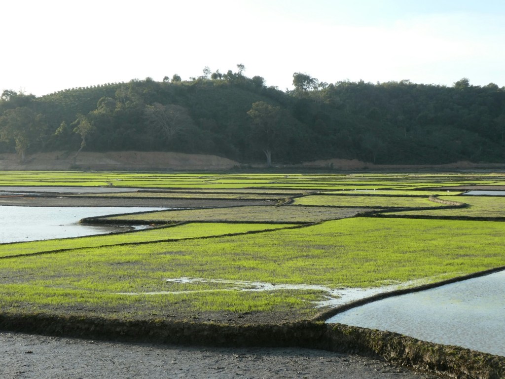 De modderige oevers van het Lakmeer zijn ideaal om rijst op te verbouwen. Dat gebeurt dan ook overal, op veldjes omgeven door muurtjes van modder.