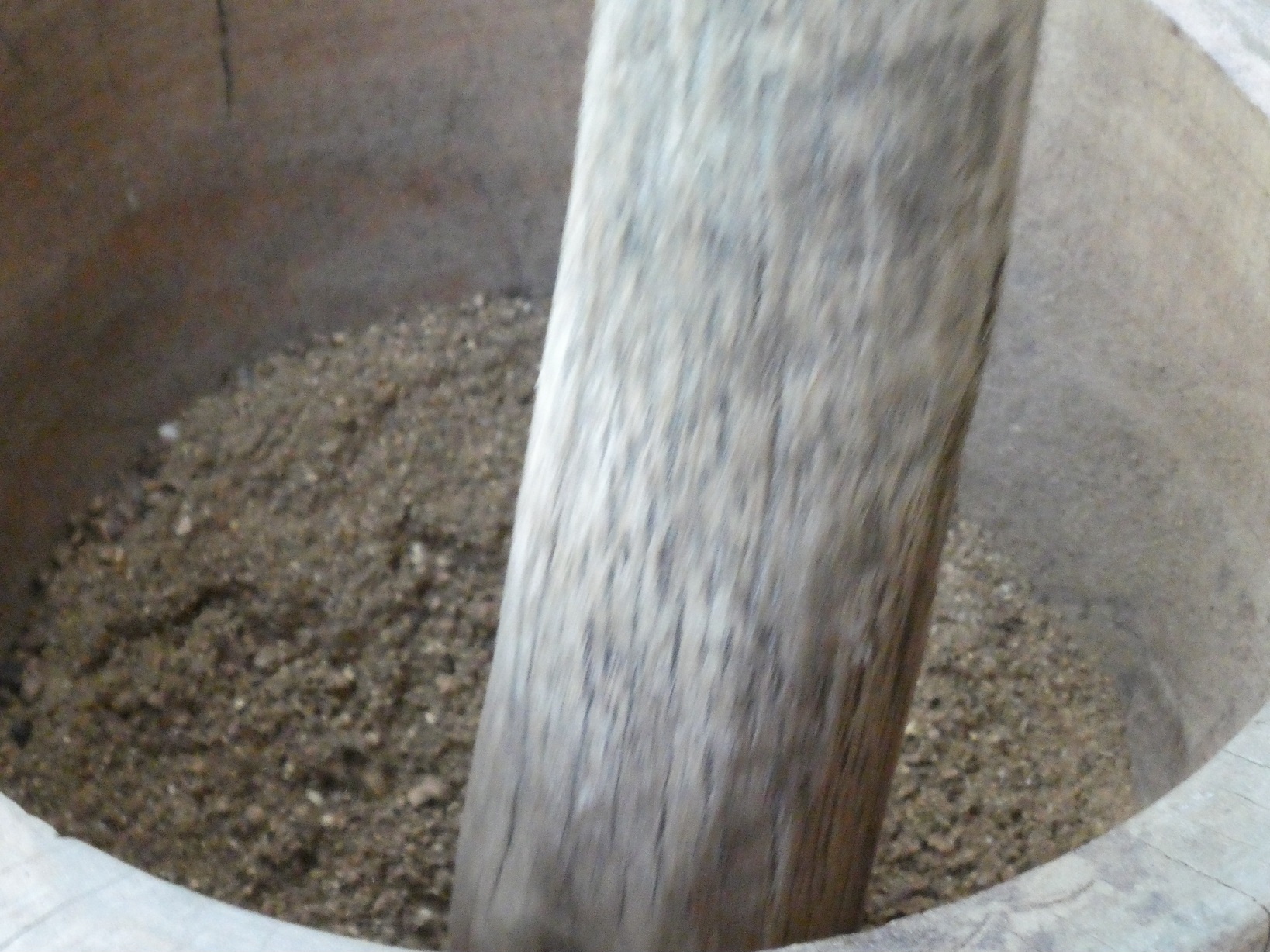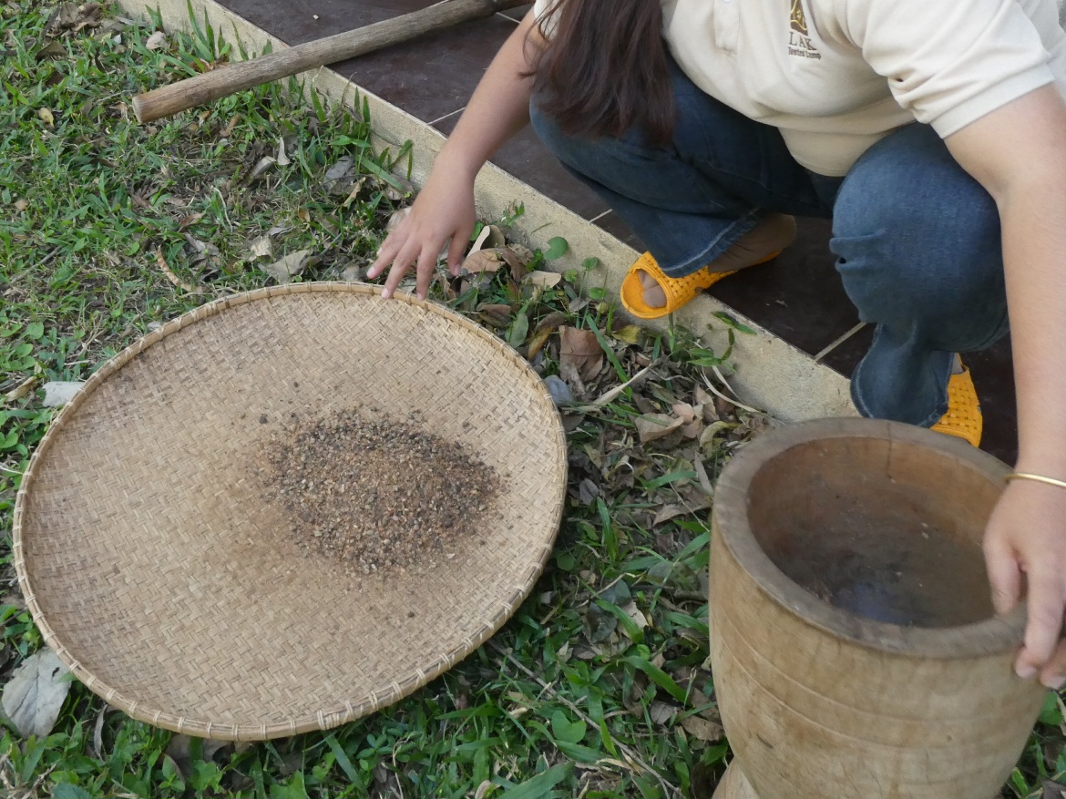 Weer op de platte mand om af te koelen, terwijl je tegelijk op het overblijvende vuurtje water kookt. En dan de bonen nog een keer stampen om er poeder van te maken.