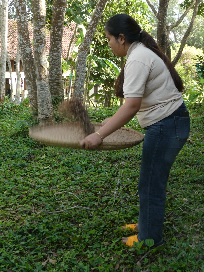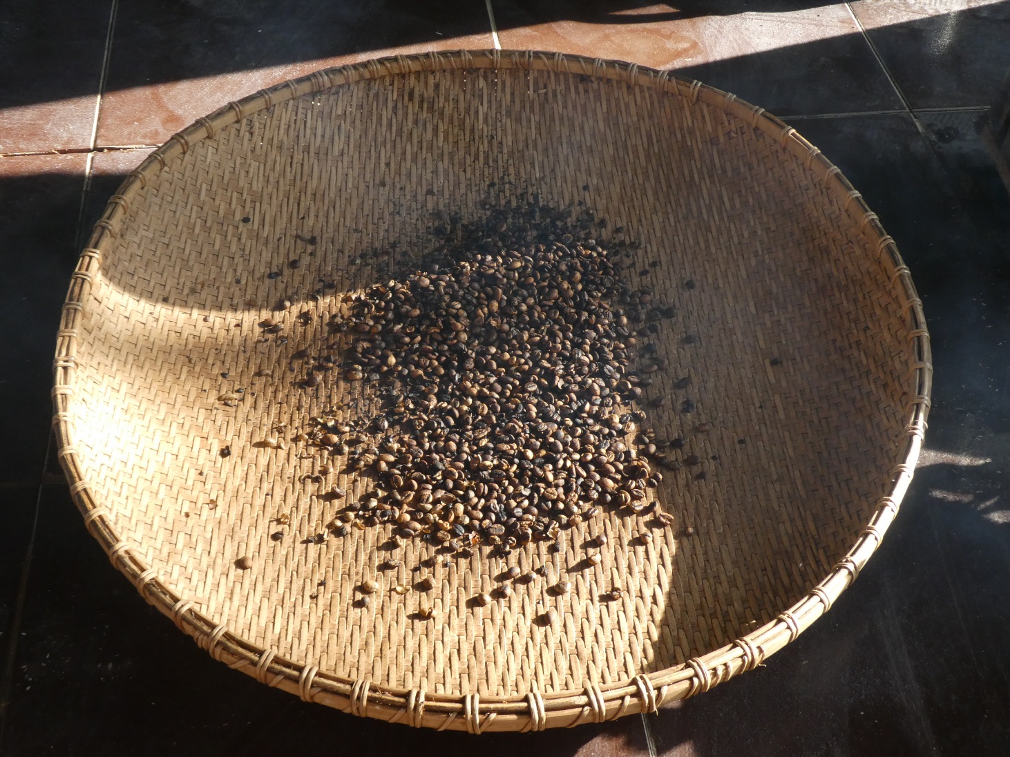 Vervolgens stort je ze in kleine porties op een platte mand en schud je die goed, zodat de schillen van de bonen gescheiden worden en je alleen de bonen overhoudt.