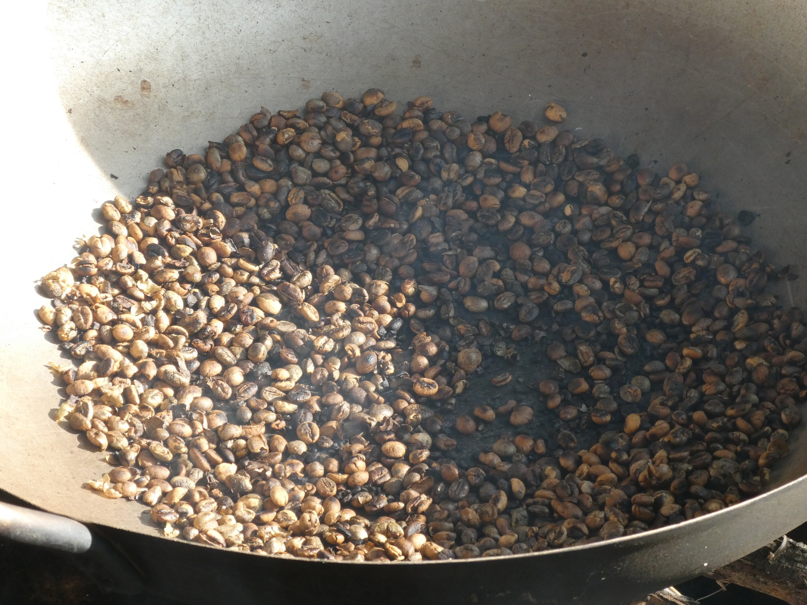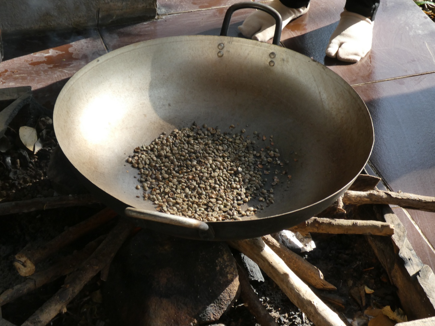 Dan maak je een heel heet vuur, zet daar een droge pan op, bonen er bij en roeren maar! Wel met stokjes uiteraard. Zo worden de bonen geroosterd.