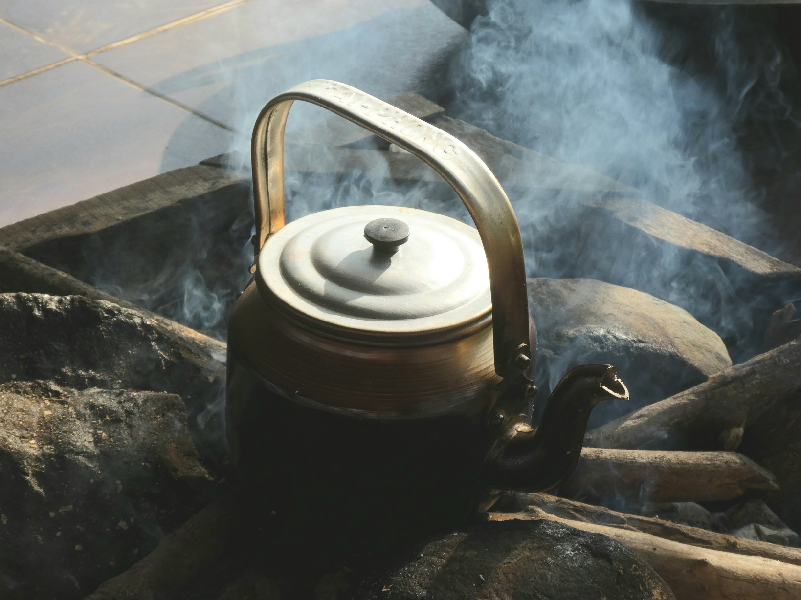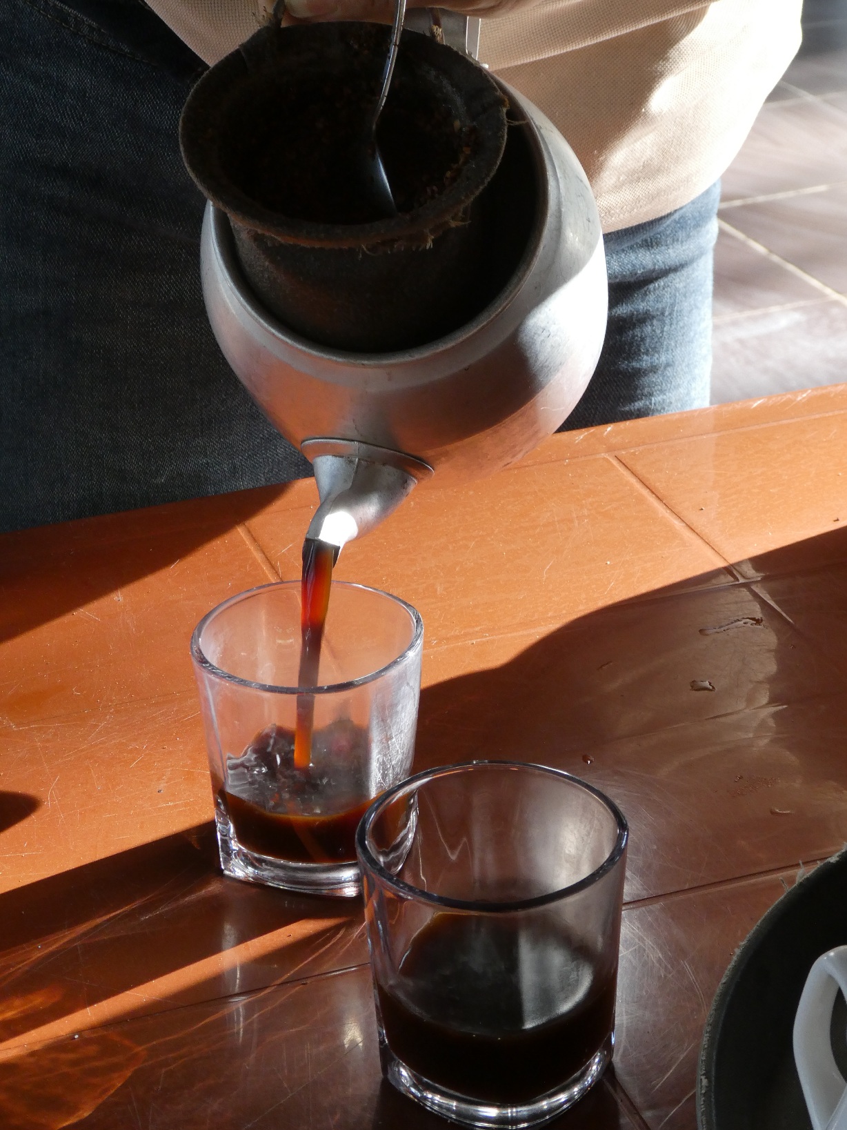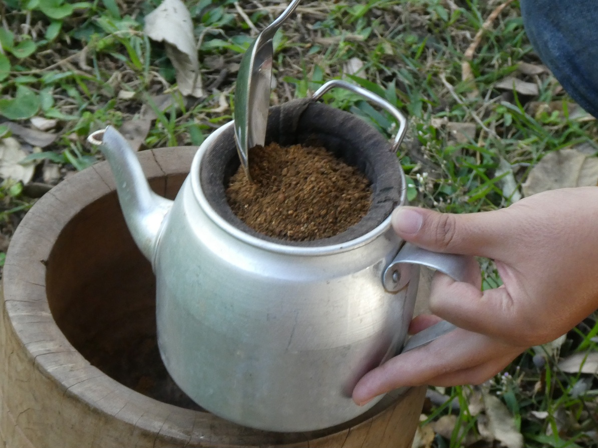 Tenslotte vul je een “sok” (koffiefilter) met het koffiepoeder en giet je er voorzichtig het hete water op.