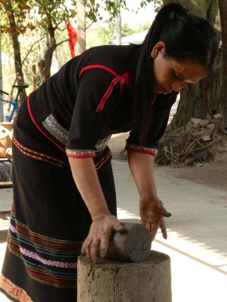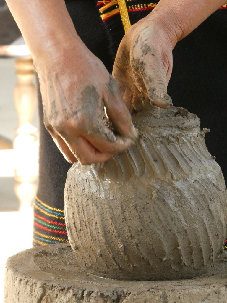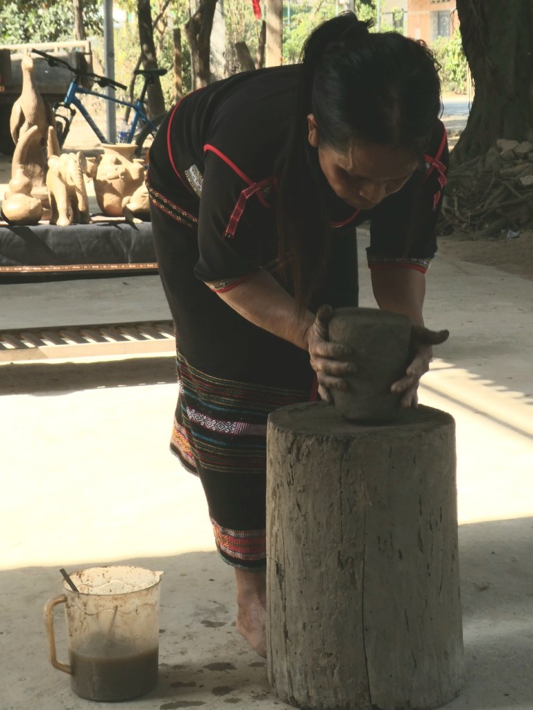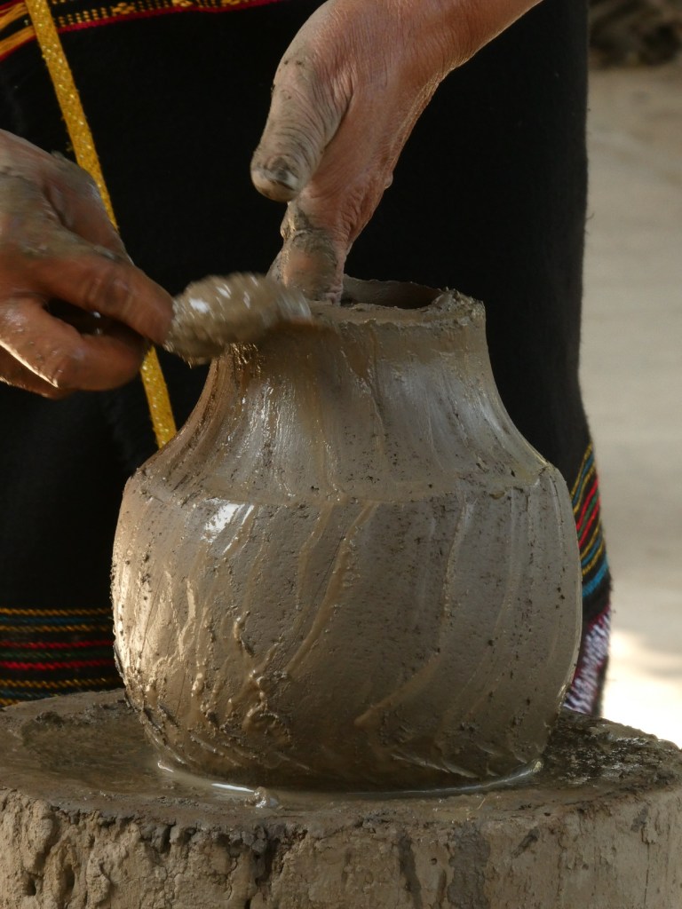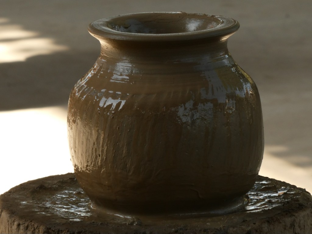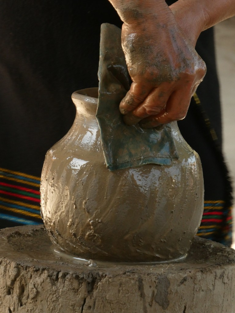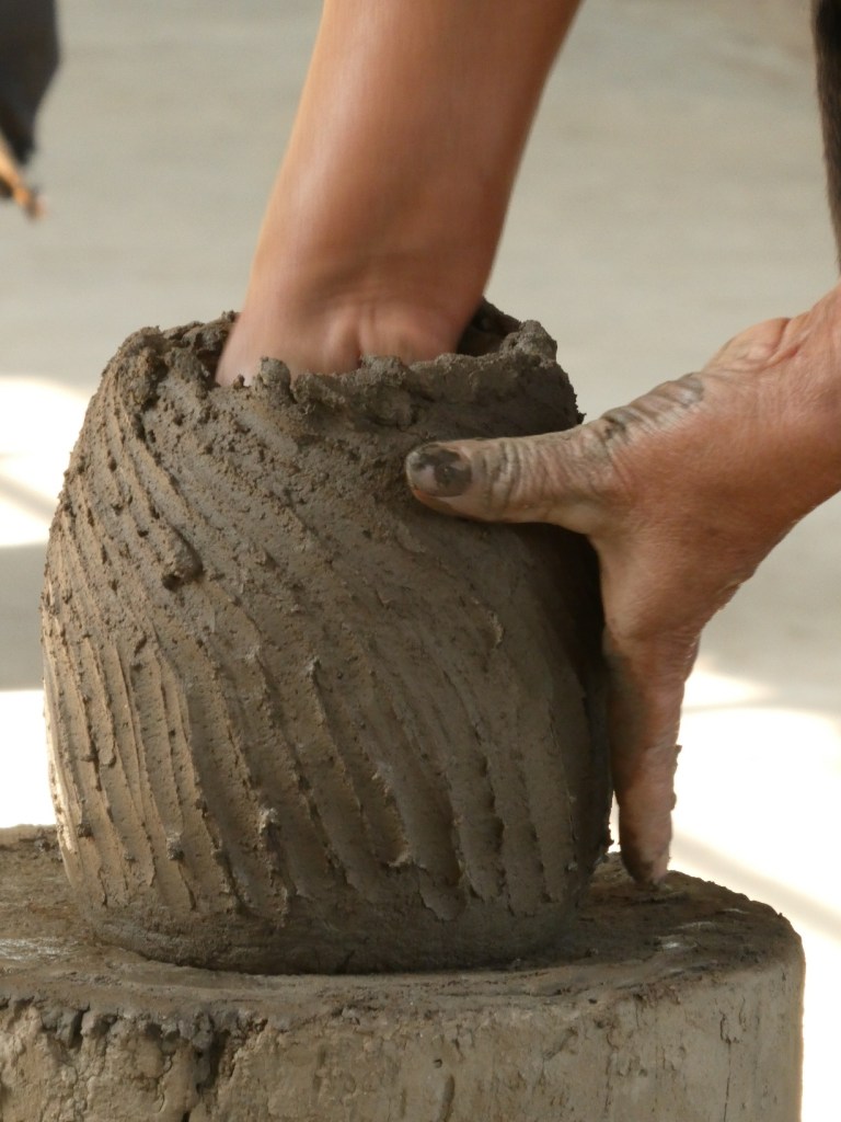 Pottenbakken zoals dat traditioneel gebeurt. Geen massaproductie, geen uitbuiting, geen draaischijf nodig. Ze loopt gewoon de hele tijd om het blok heen.