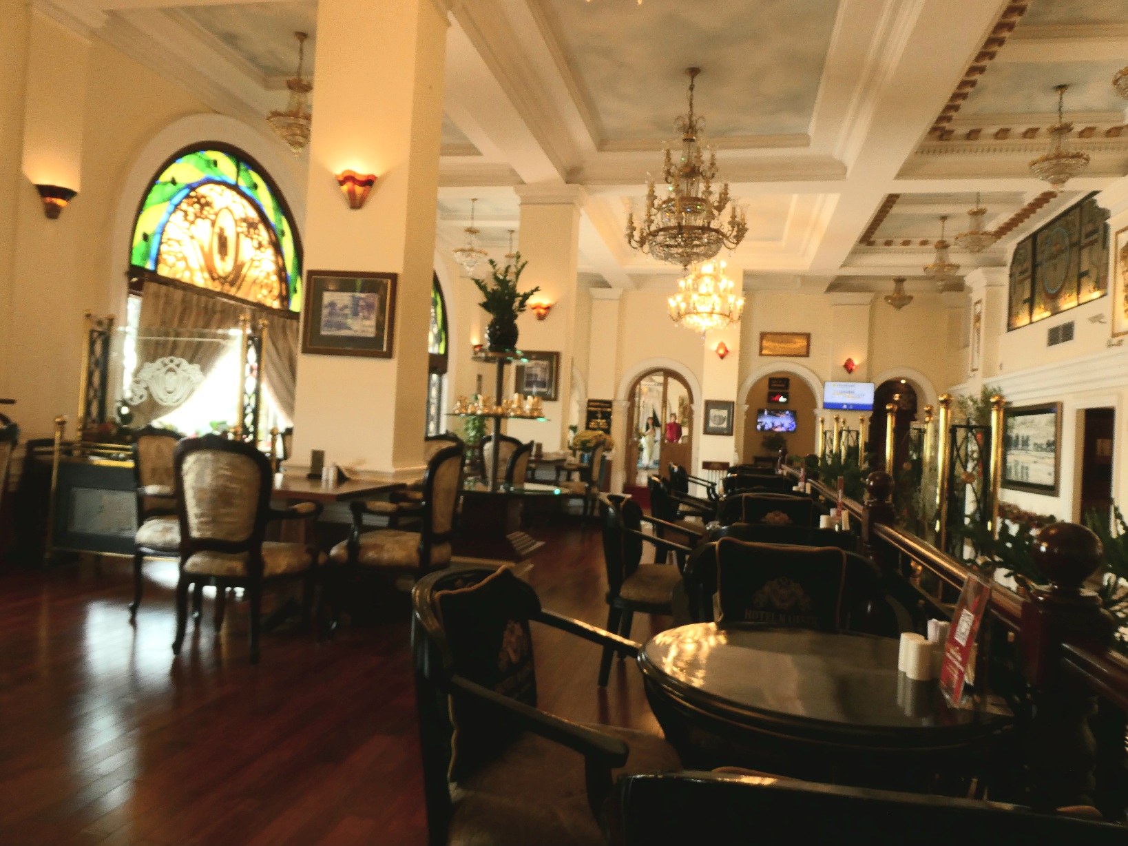 Het Majestic hotel is inmiddels exact honderd jaar oud, maar nog volop in gebruik. Gebouwd door een chinese zakenman, is het 5-sterrenhotel inmiddels in handen van een staatsbedrijf. Voor ons iets boven budget, maar een kopje koffie in de hal met originele details was ook prima.