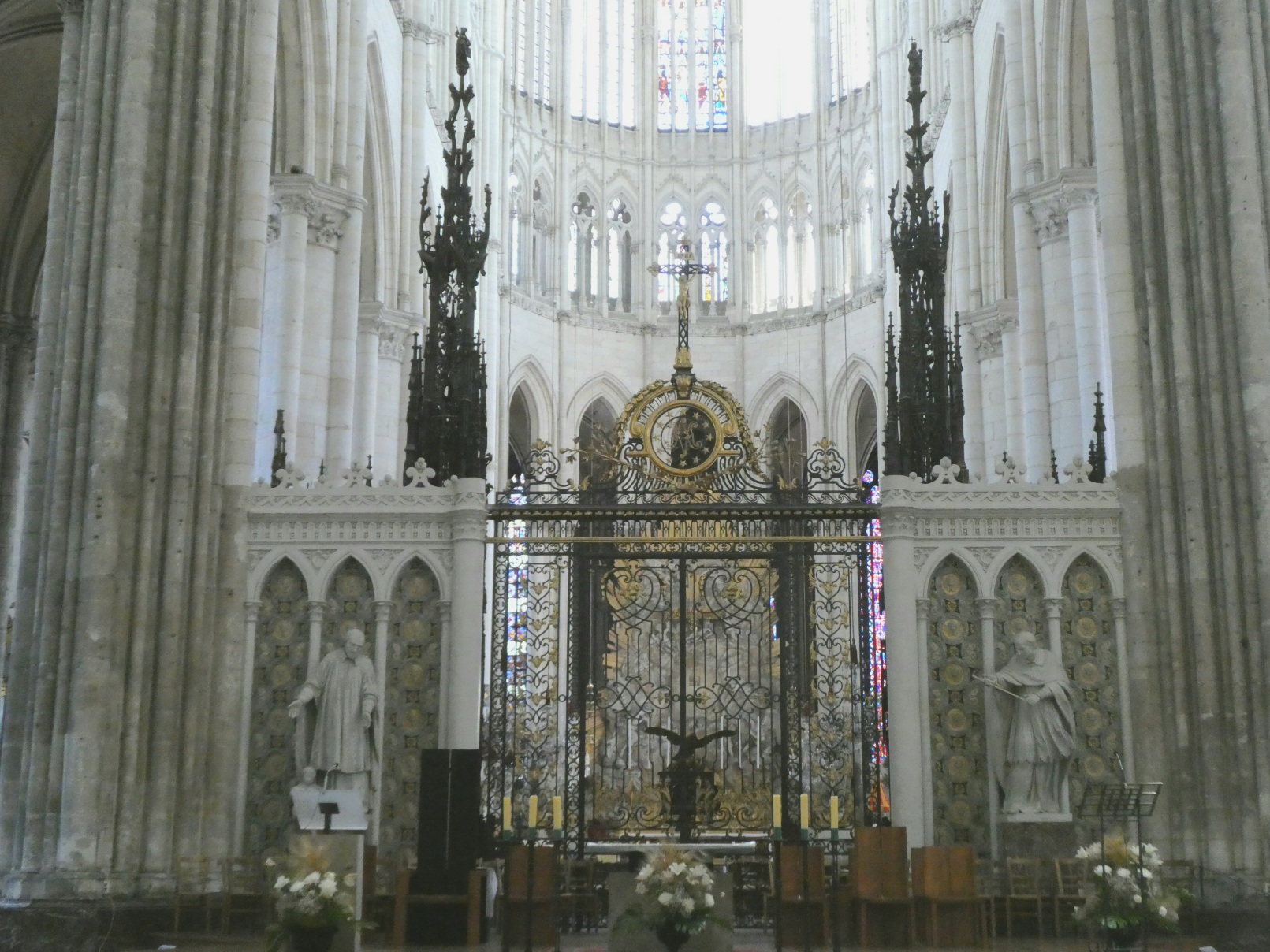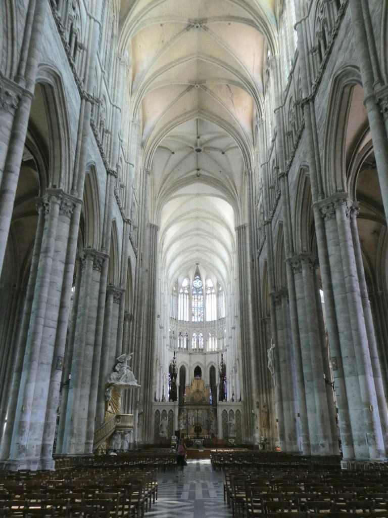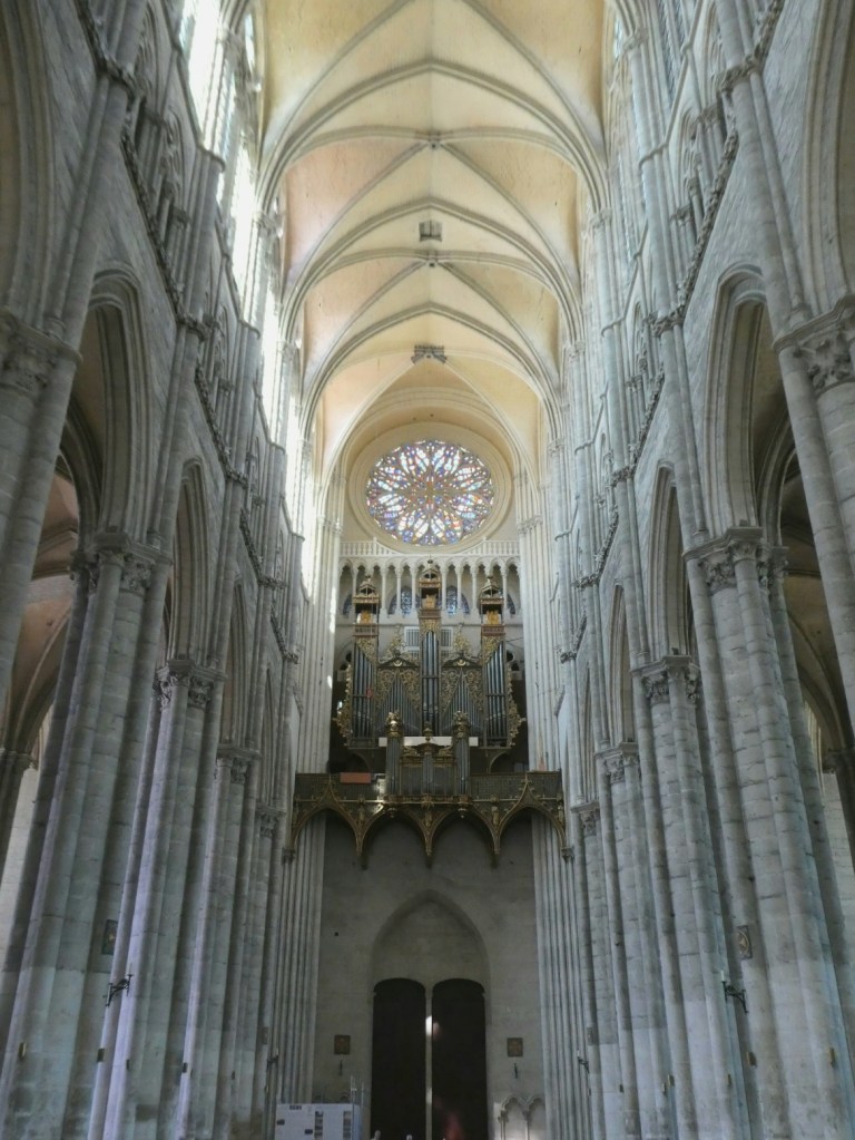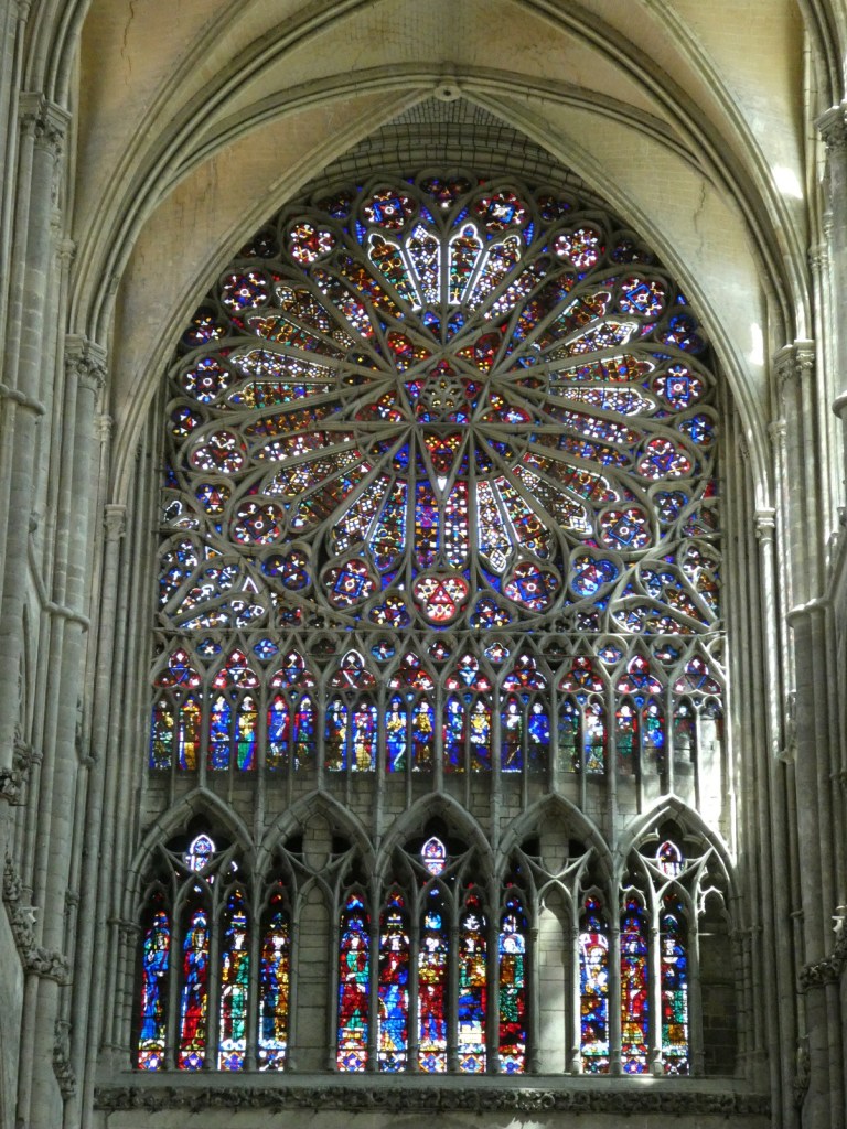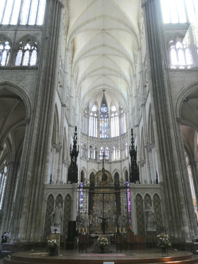 Het interieur van de kathedraal van Amiens is al net zo indrukwekkend als het exterieur. Door de enorme hoogte van 42 meter en de kleurrijke glas-in-lood ramen is de kerk heel licht en, zoals de bedoeling, verticaal opgebouwd.