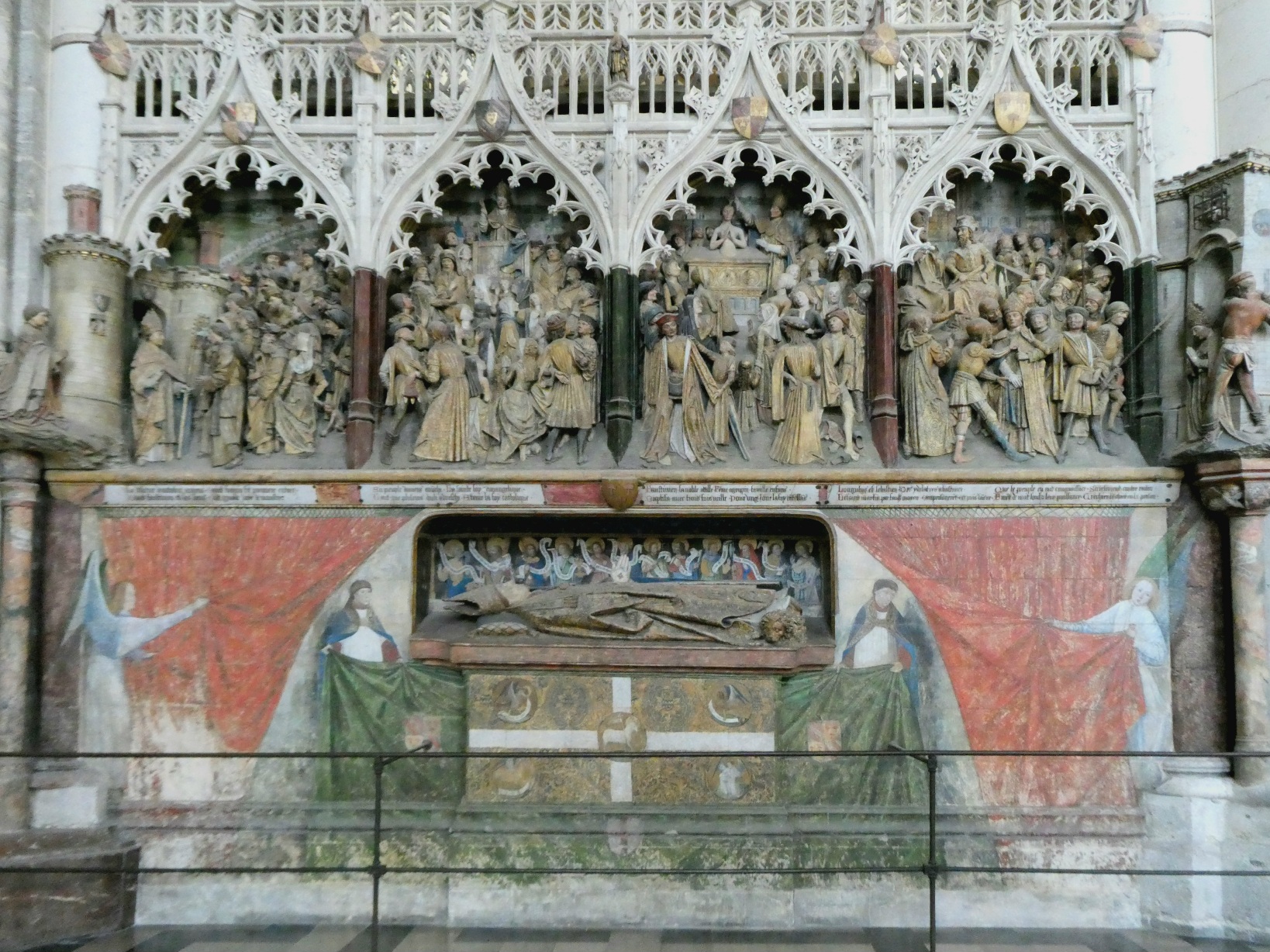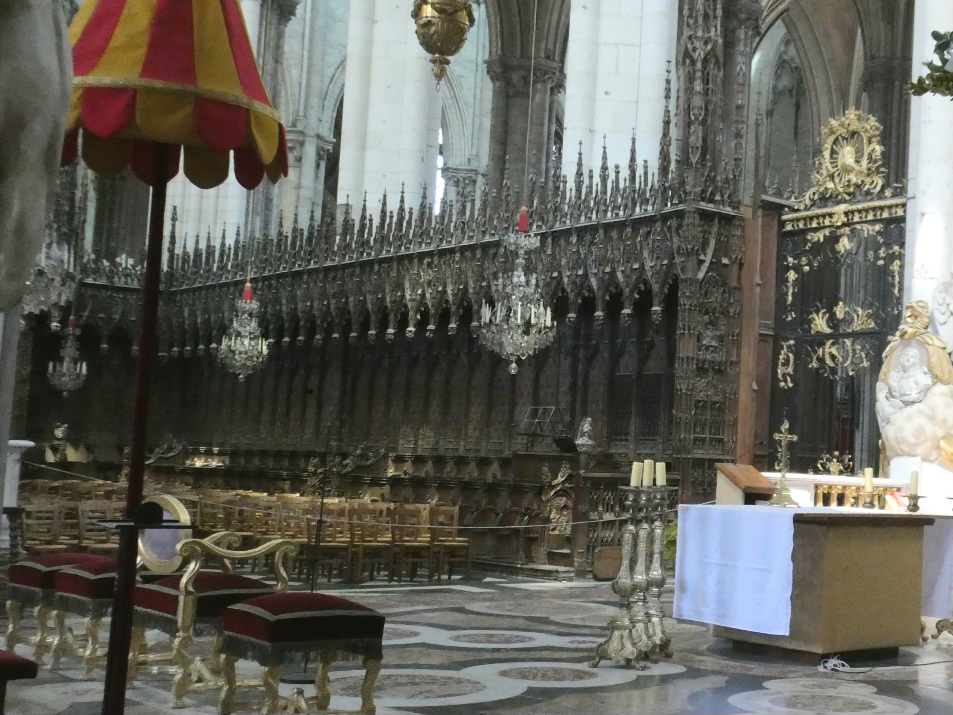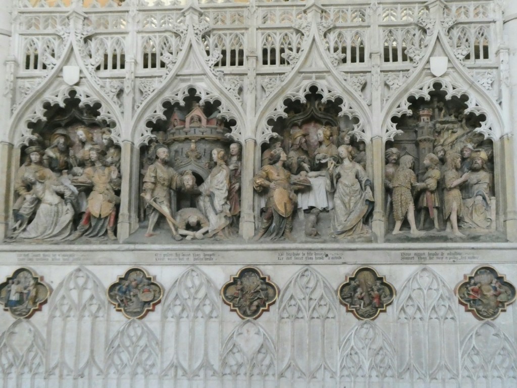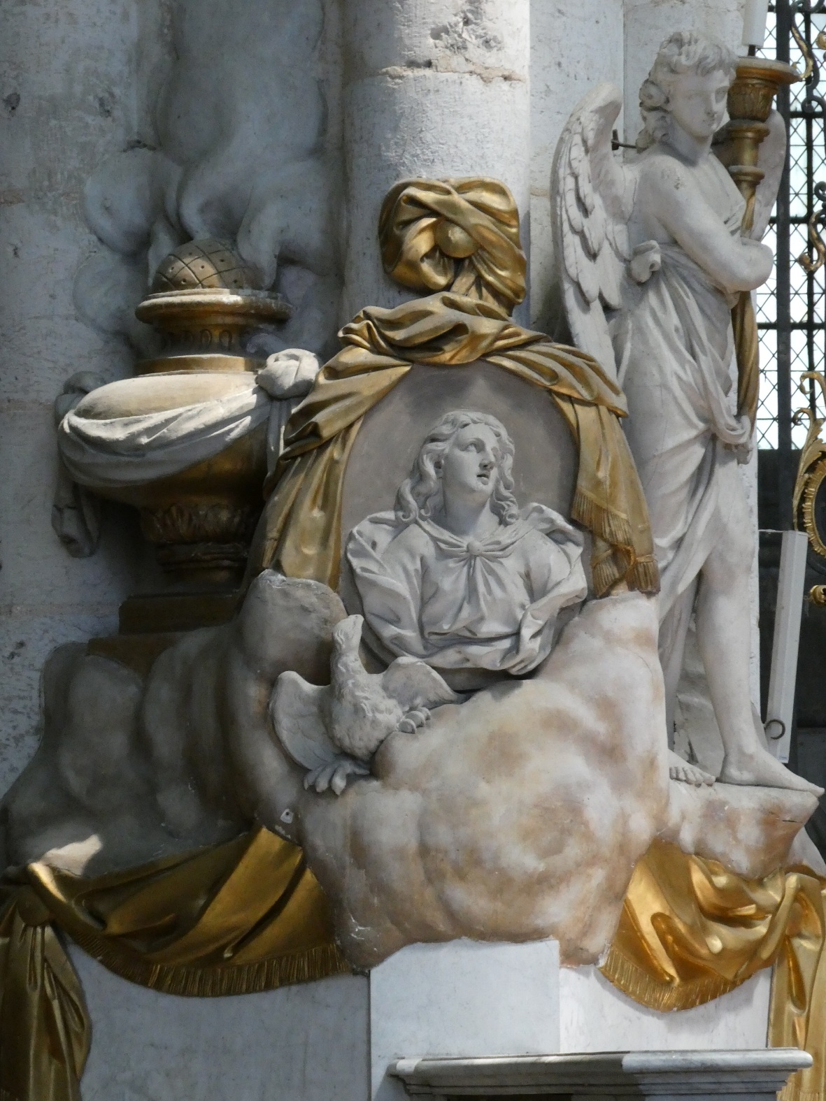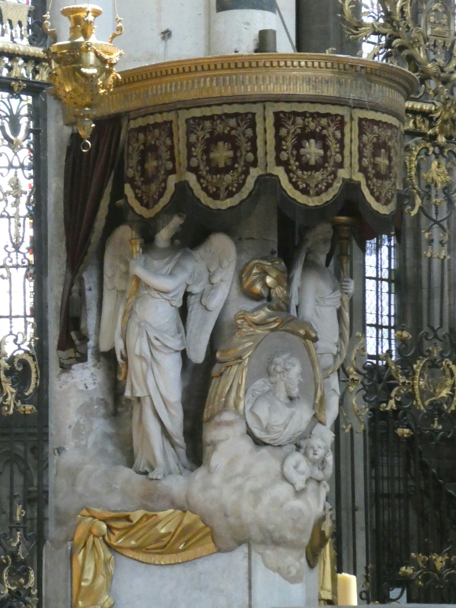 Het koor bevat mooie 16e eeuwse koorstoelen en veel goudversiering, maar het leukste is het grafmonument aan de achterkant met een huilende engel.