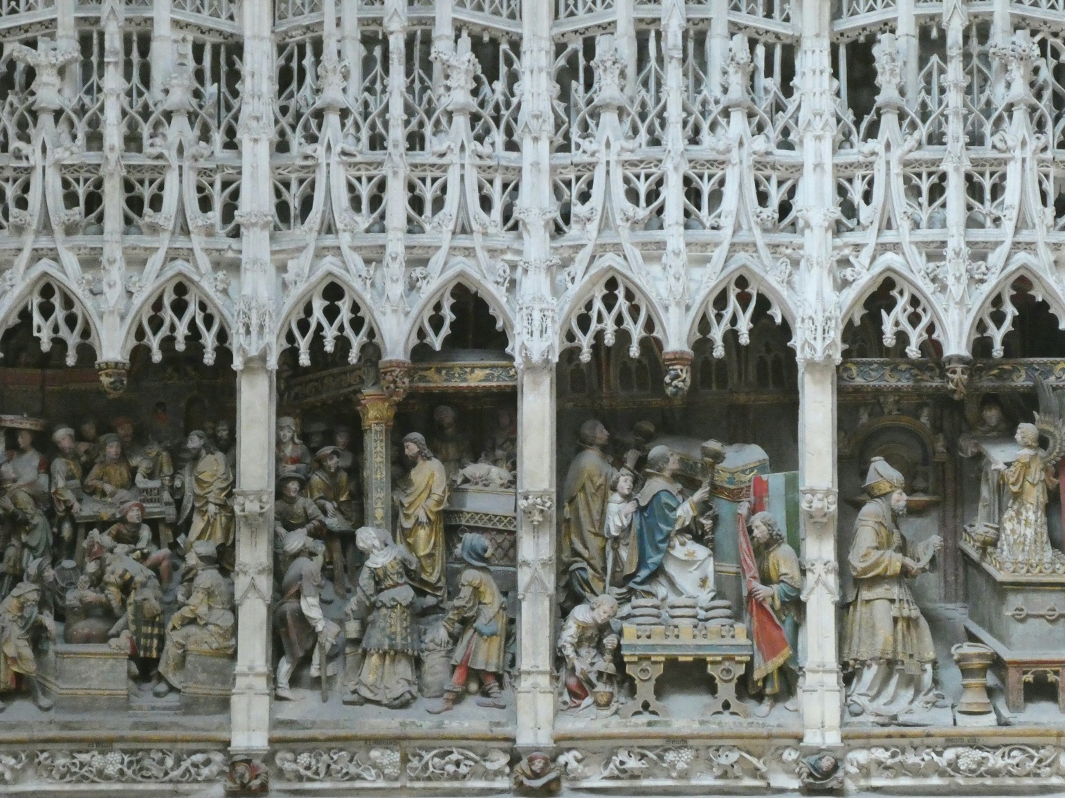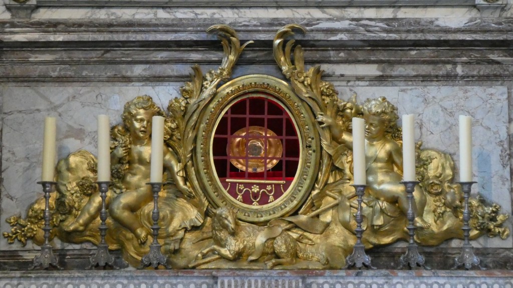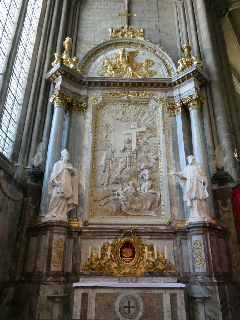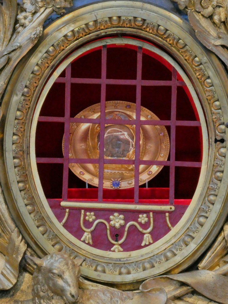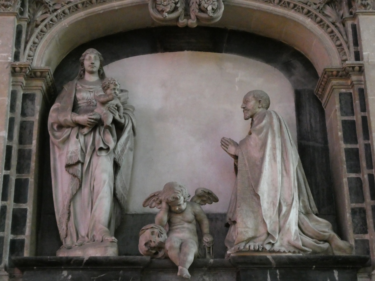 Het koor bevat mooie 16e eeuwse koorstoelen en veel goudversiering, maar het leukste is het grafmonument aan de achterkant met een huilende engel.