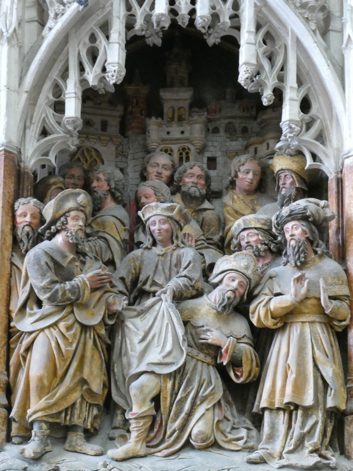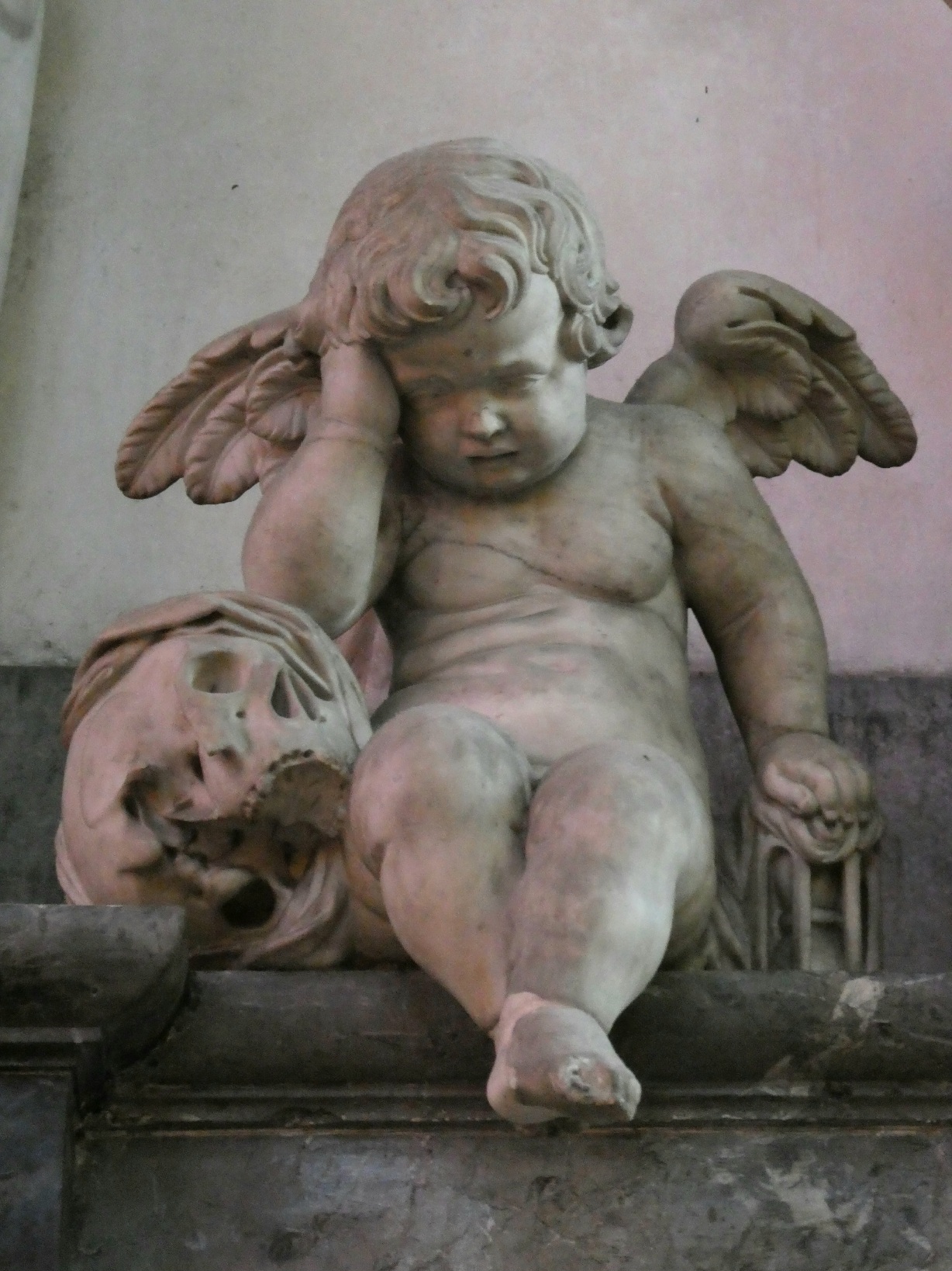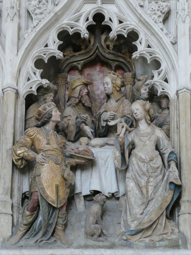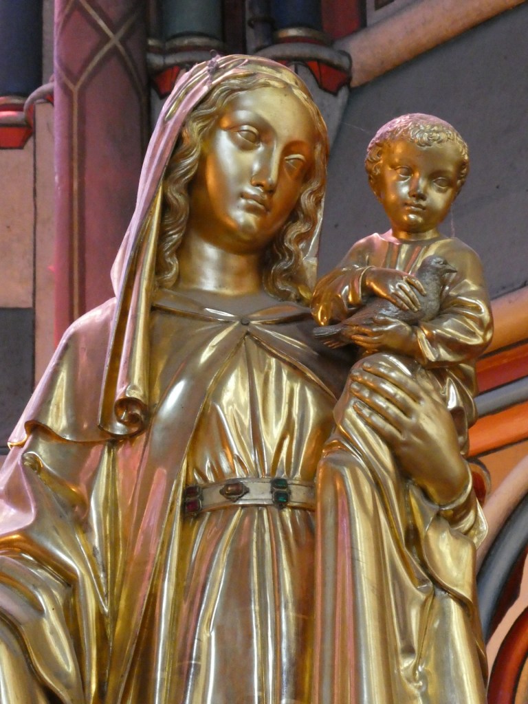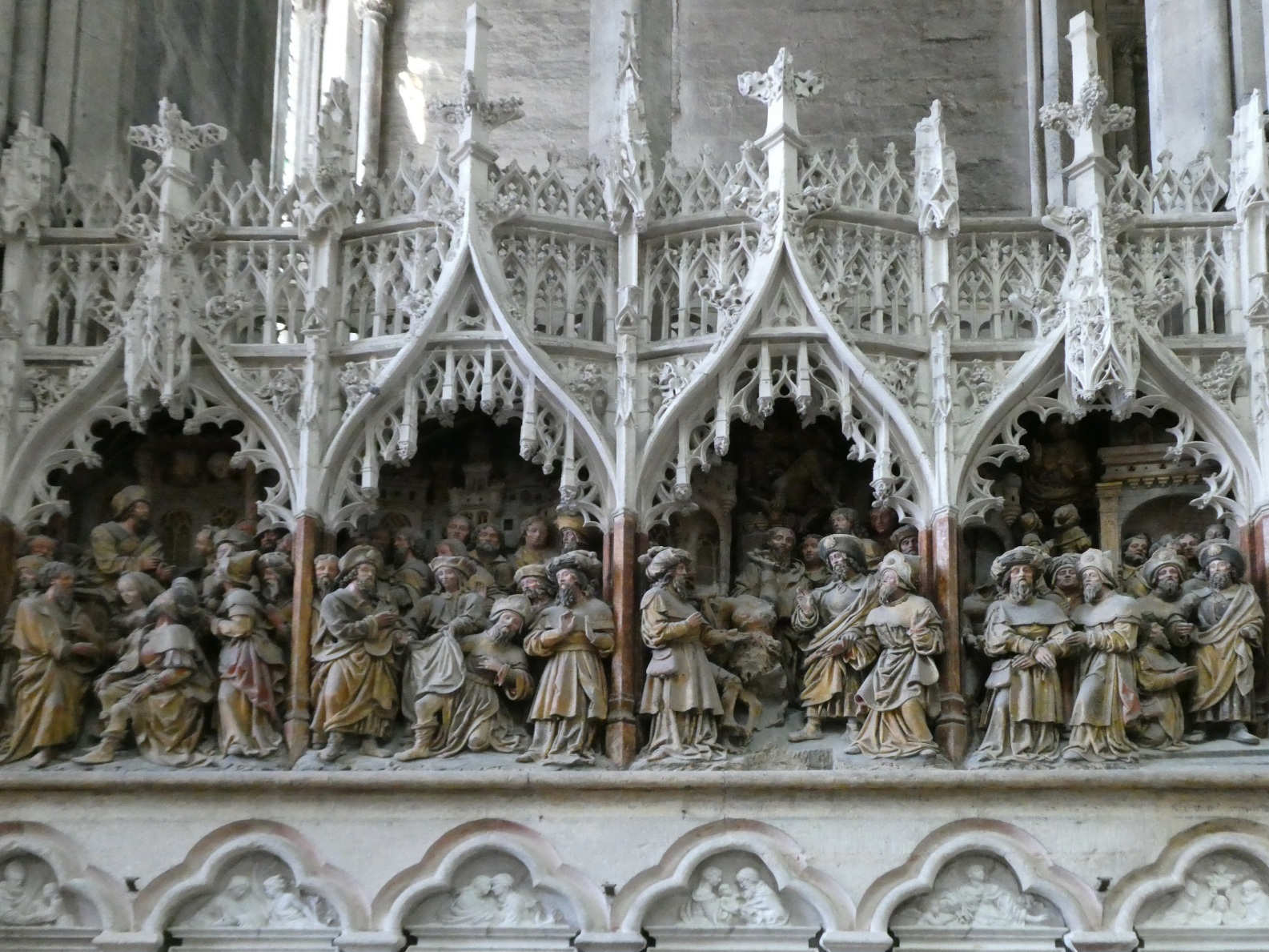 Het koor bevat mooie 16e eeuwse koorstoelen en veel goudversiering, maar het leukste is het grafmonument aan de achterkant met een huilende engel.