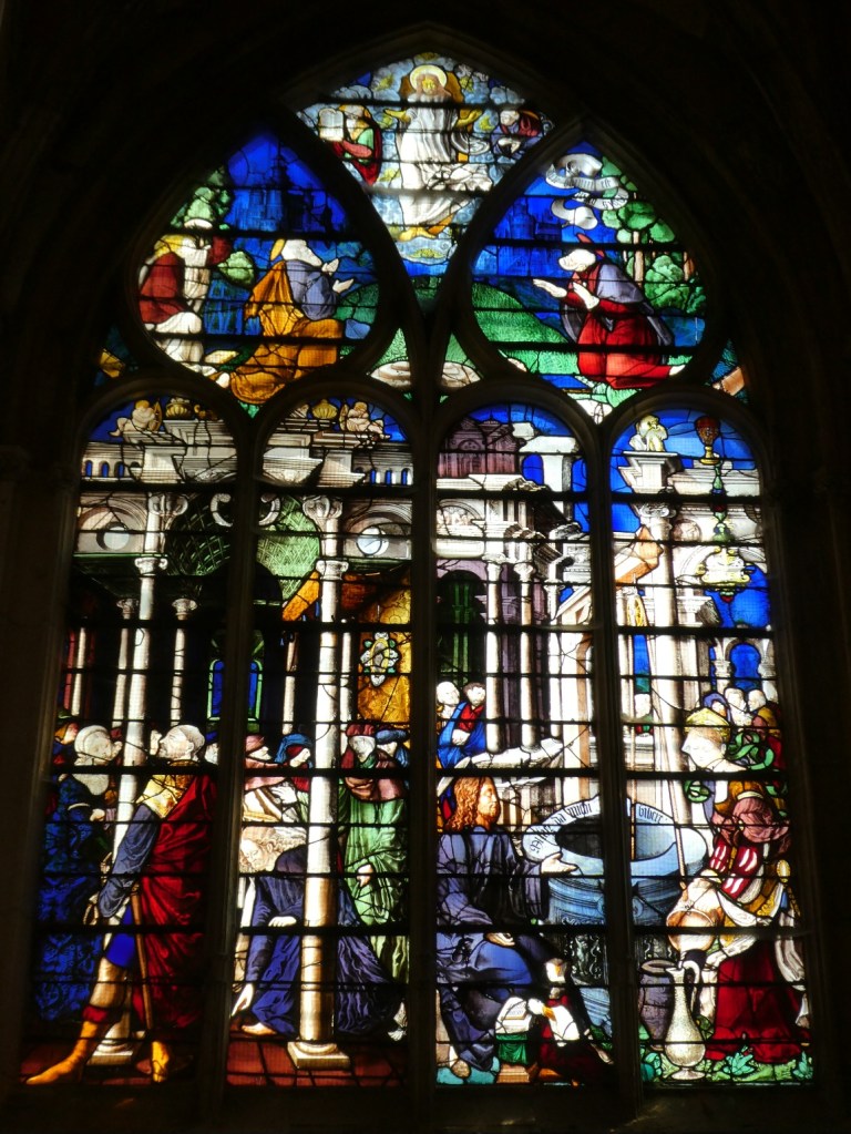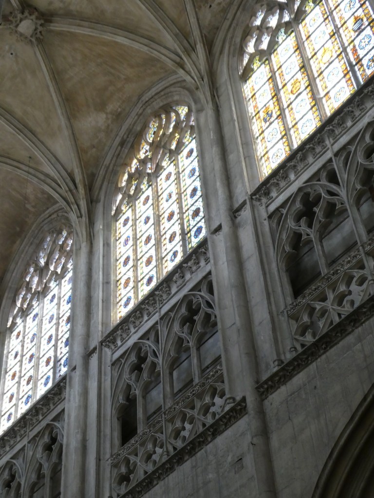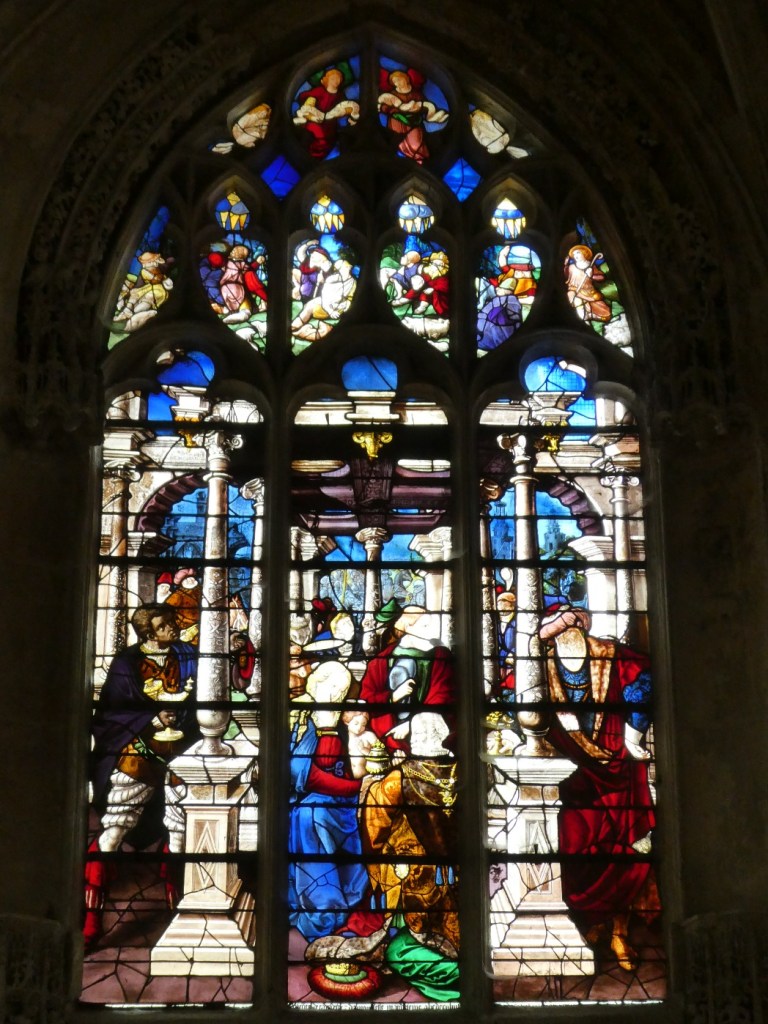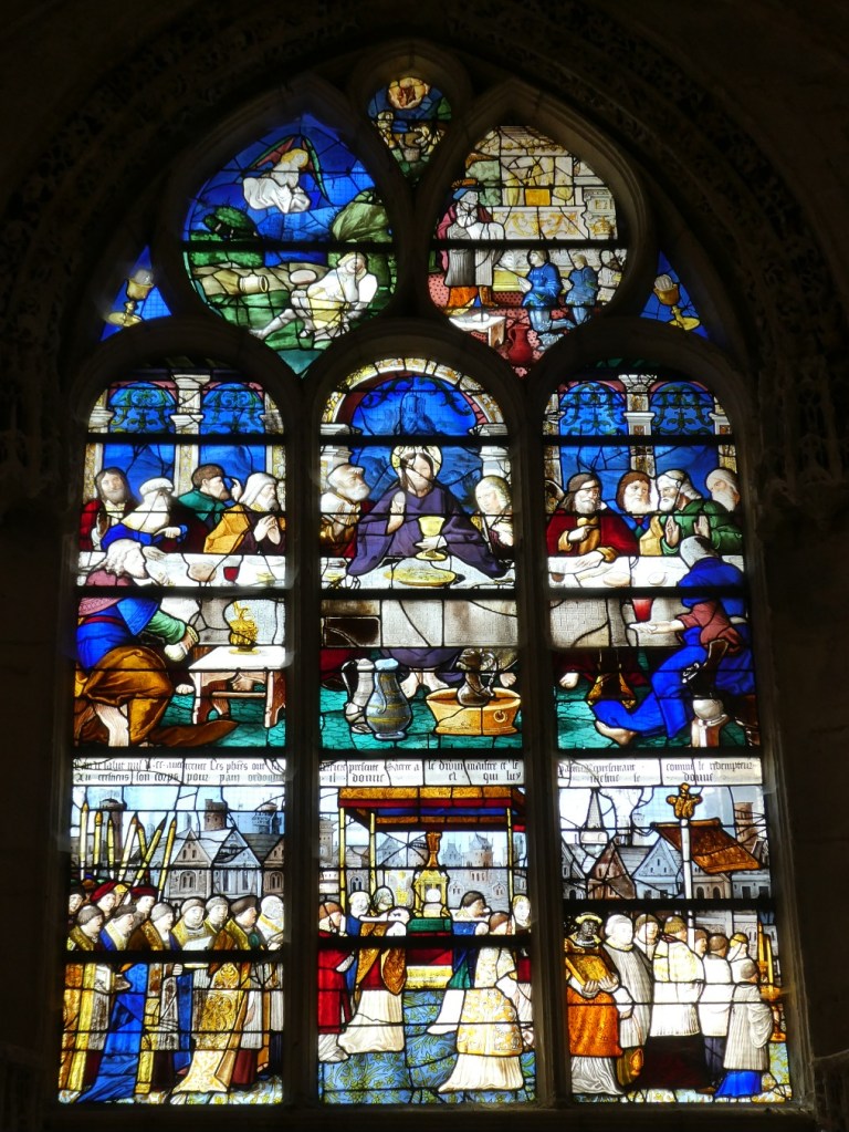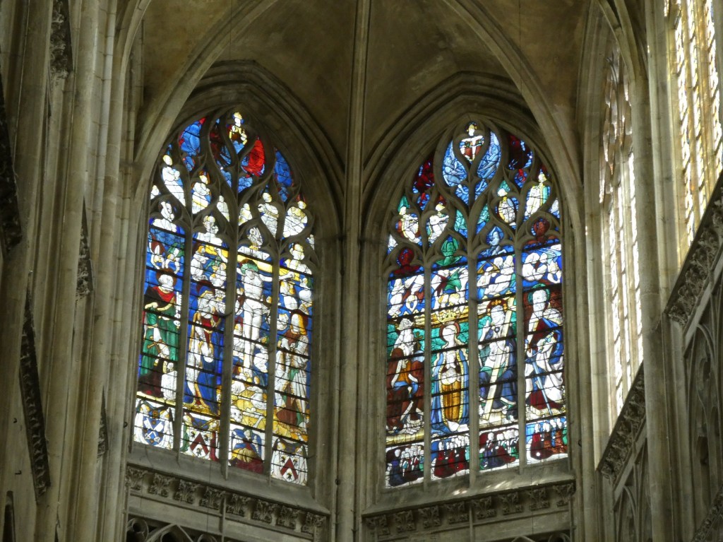 Maar het absolute hoogtepunt zijn de originele 15e en 16e eeuwse glas-in-lood ramen met kleurrijke taferelen die vaak goed herkenbaar zijn. Heel opvallend is een overwegend geelgekleurd raam.
