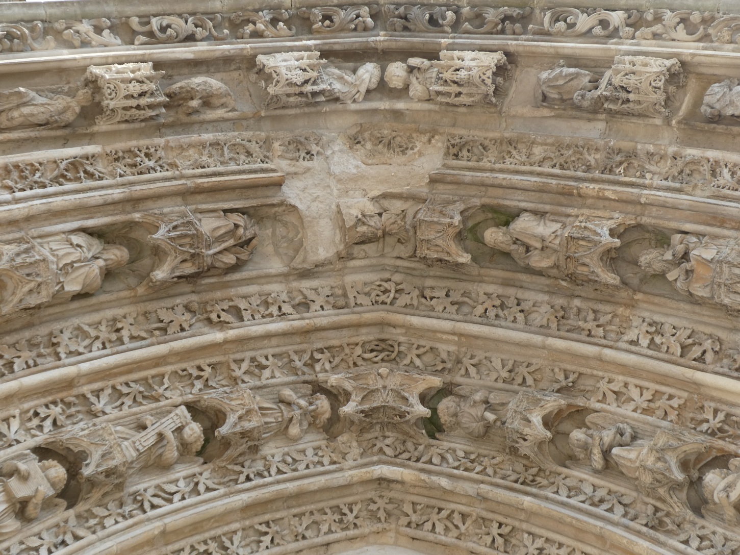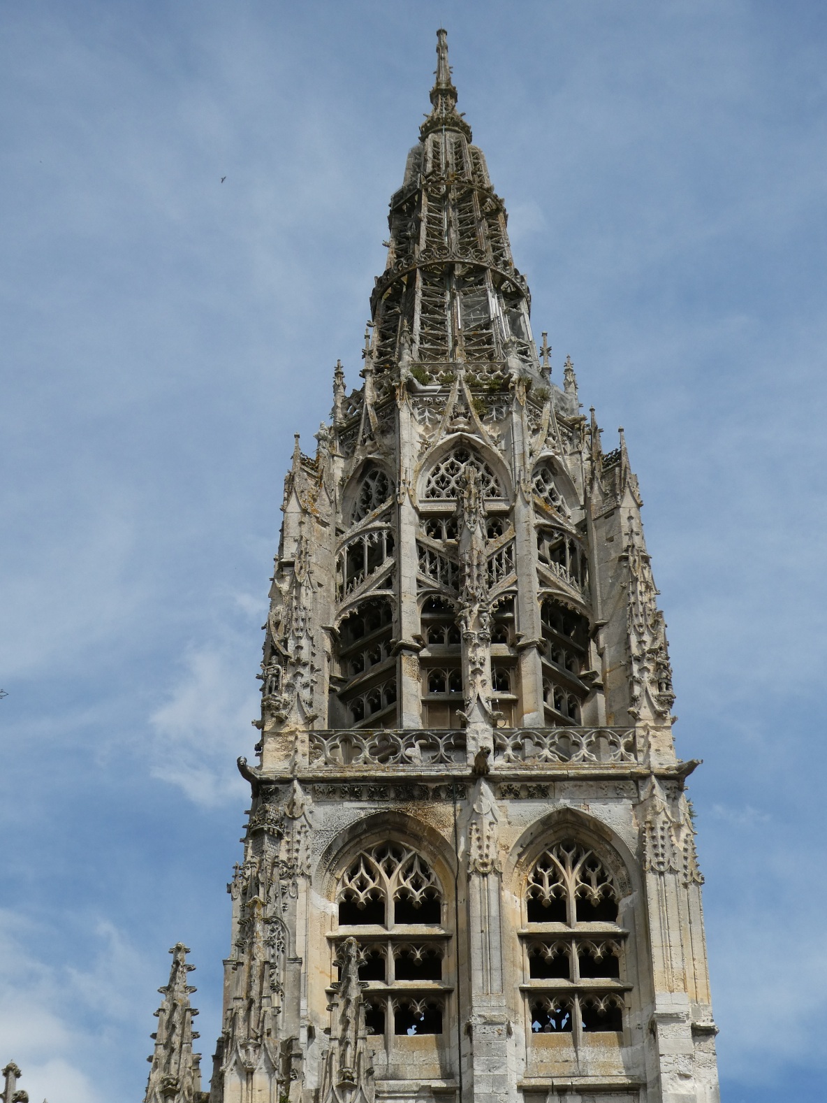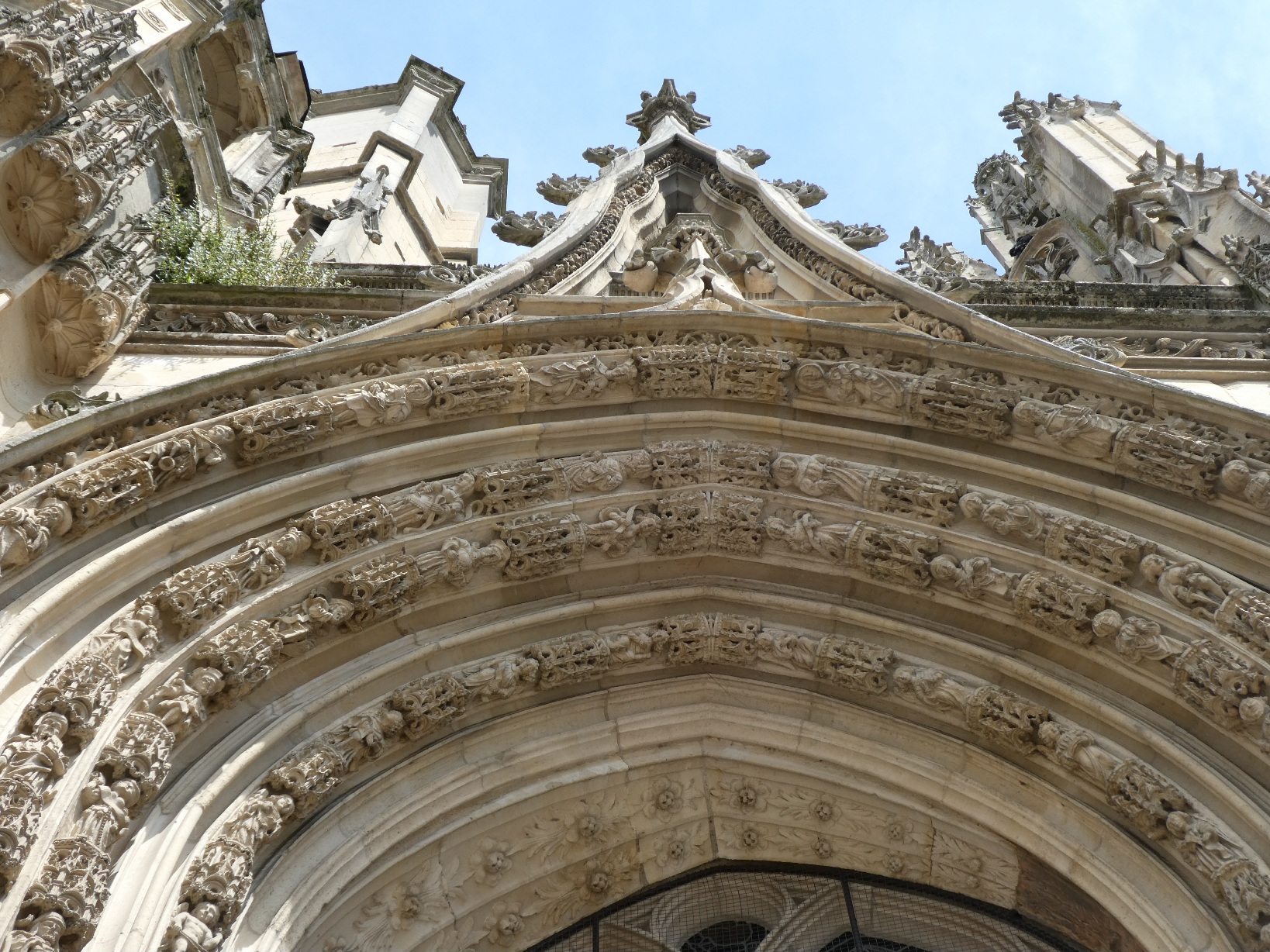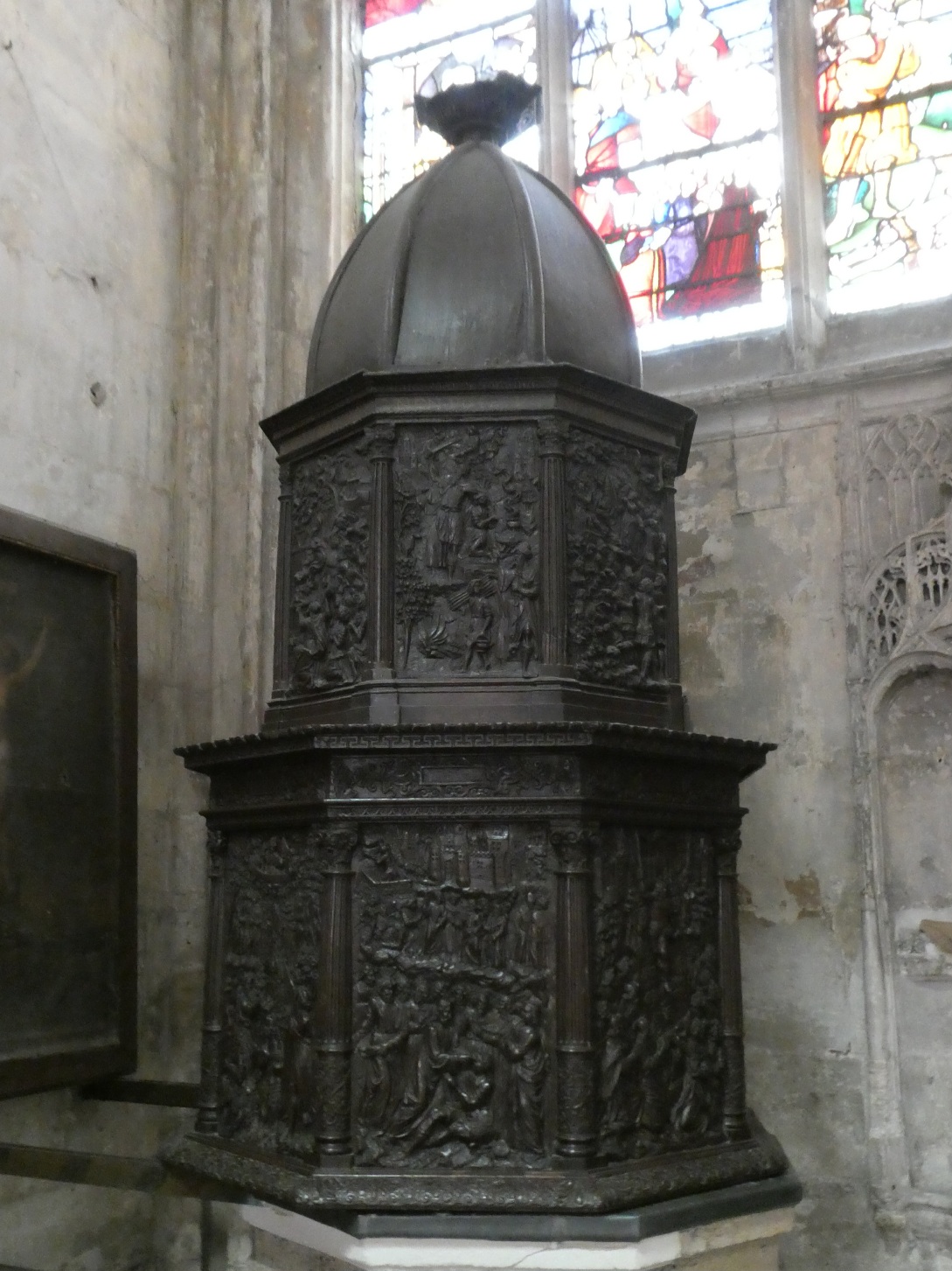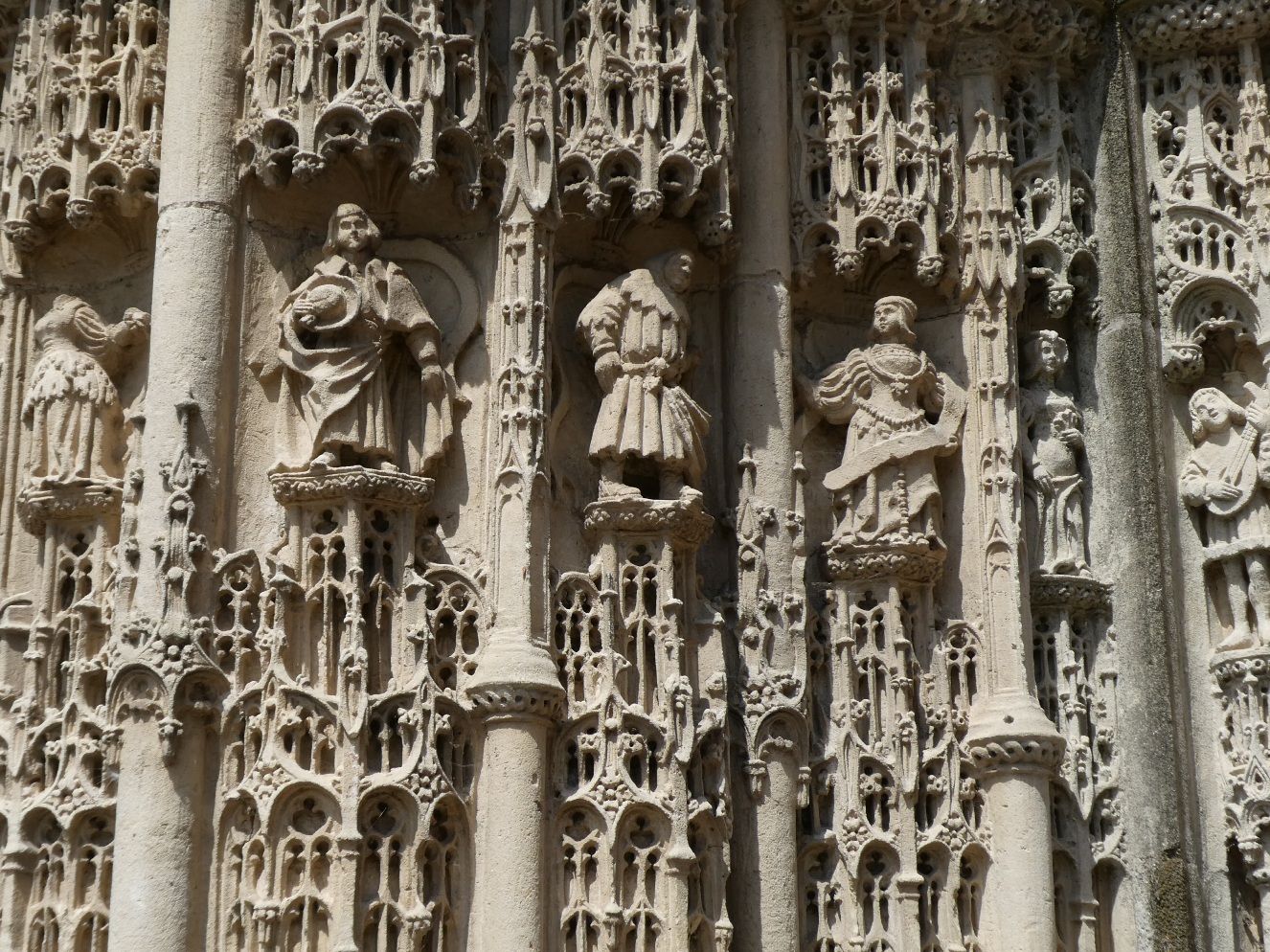 De 15e eeuwse kerk is aan de buitenkant opvallend door de fijn bewerkte toren en de meer dan 330 figuurtjes in de gevel.