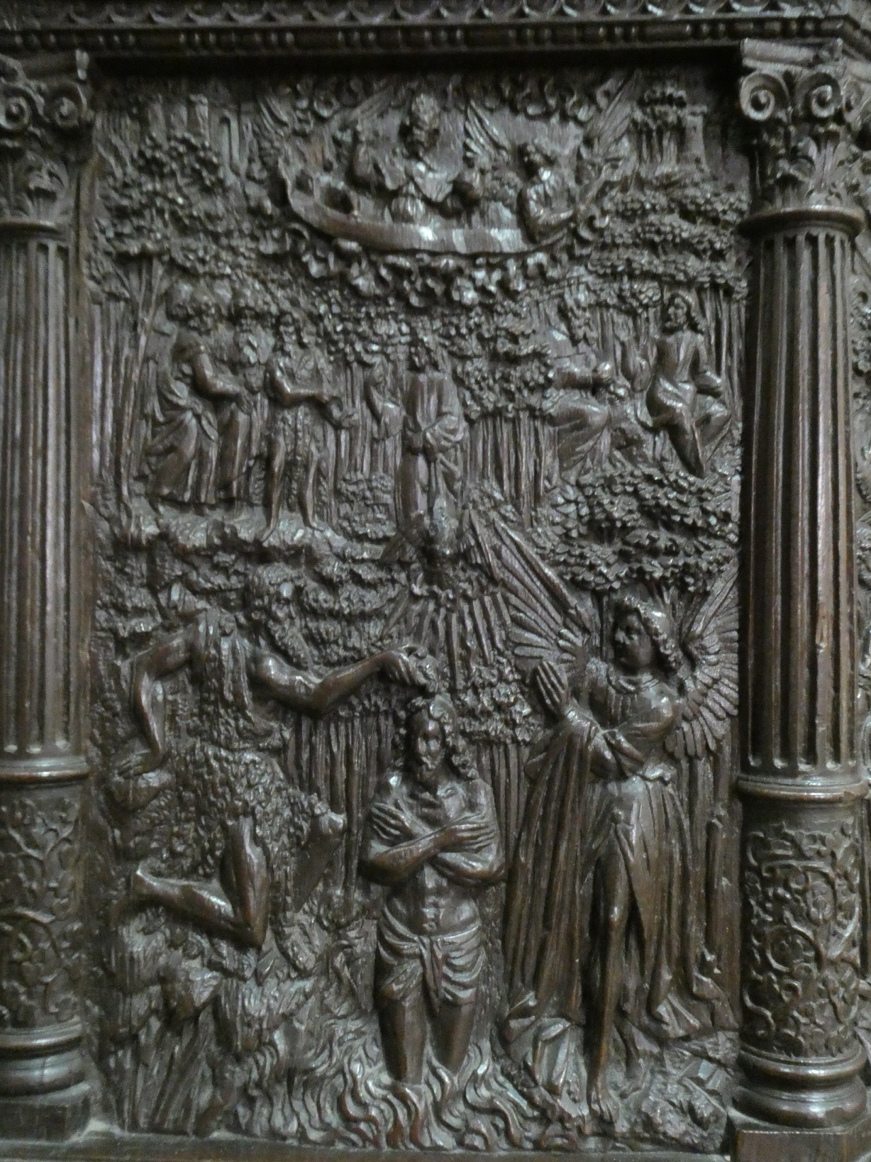 Ook binnen is die figuratieve aanpak doorgezet, in de pilaren en ook in het doopvont met 16 bijbelse scènes.