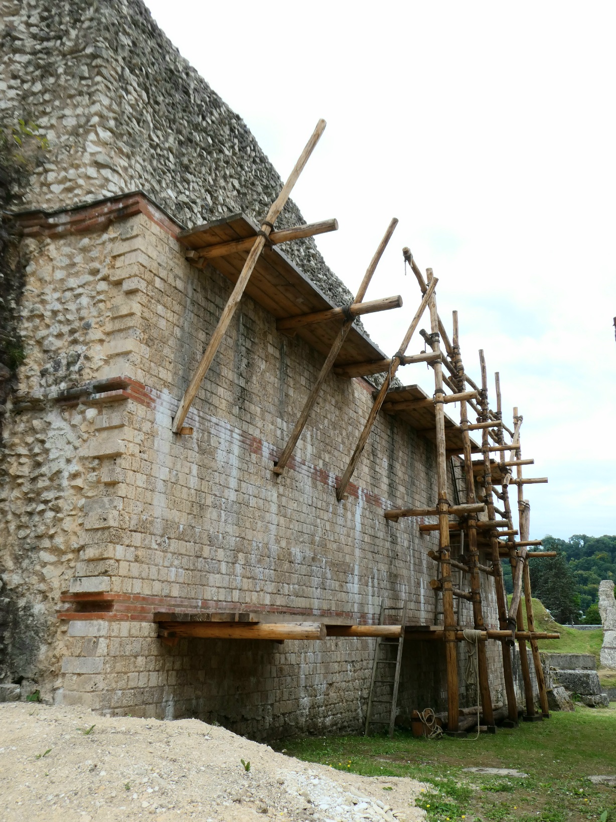 De ingangspoorten aan weerszijden werden gebruikt door het publiek om op de galerijen te komen, en via aparte ingangen kwamen de hoofdrolspelers op het podium of in de arena. Bij één van de muren is een steiger opgebouwd om te laten zien hoe de muren vroeger gebouwd werden.