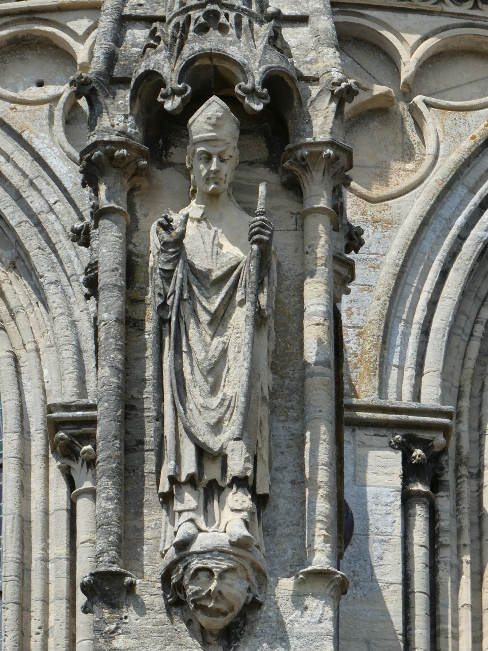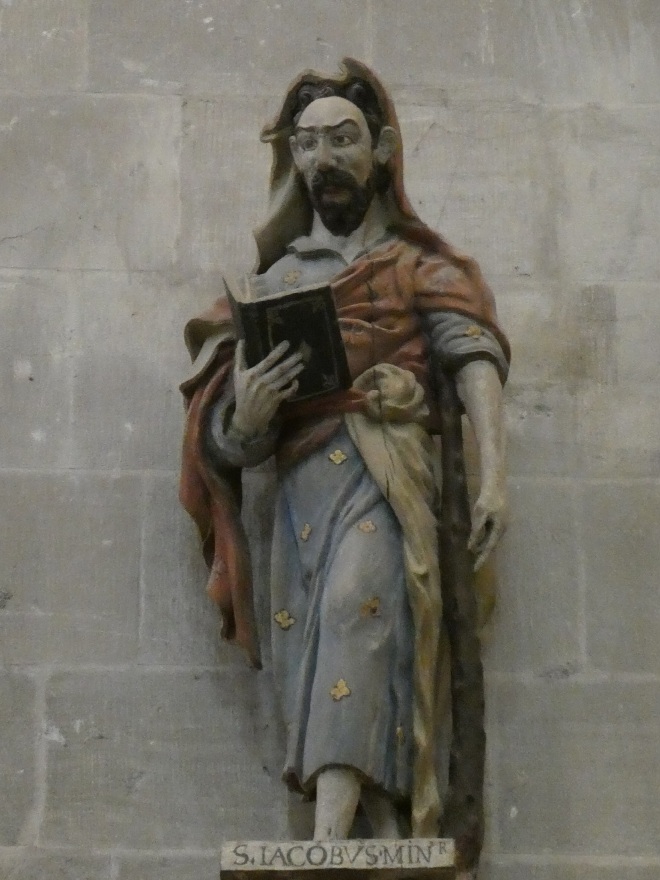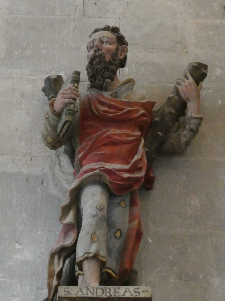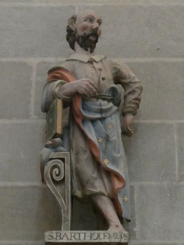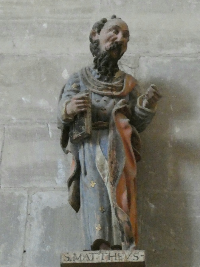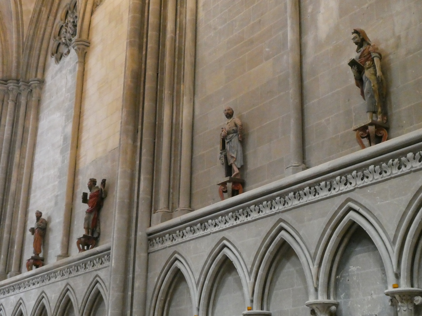 Enigszins verscholen, hoog op een rand, staan nog vier 14e eeuwse heiligenbeelden.