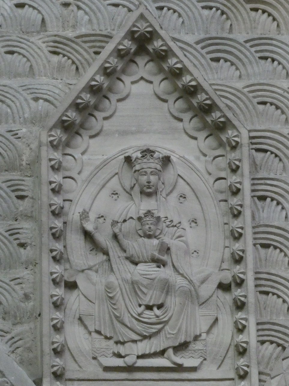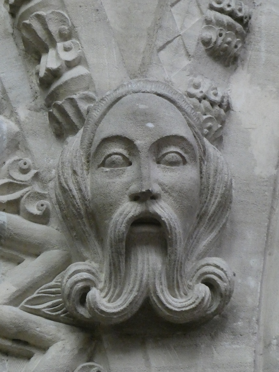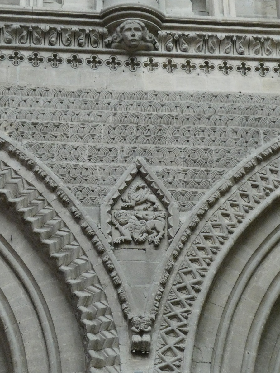 De witte, origineel romaanse, bogen in het schip zijn bewerkt met prachtig beeldhouwwerk.