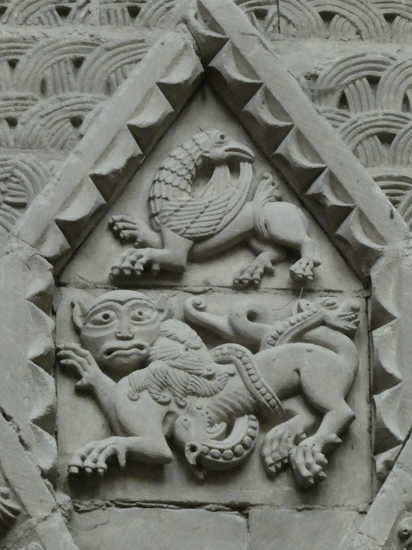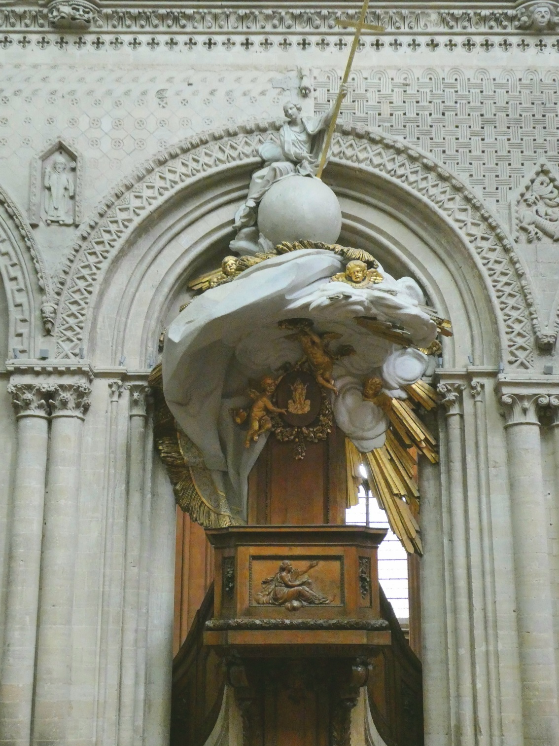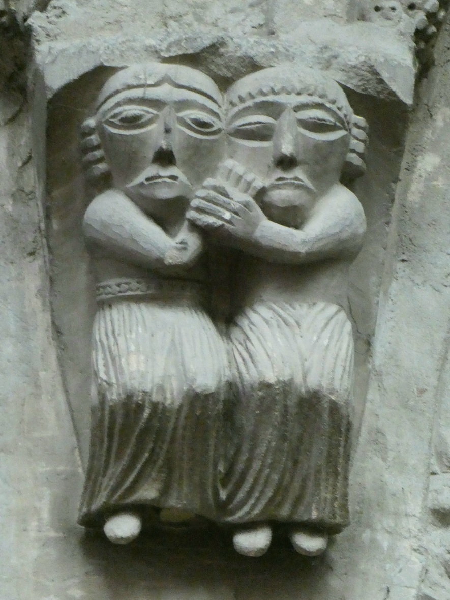 De witte, origineel romaanse, bogen in het schip zijn bewerkt met prachtig beeldhouwwerk.