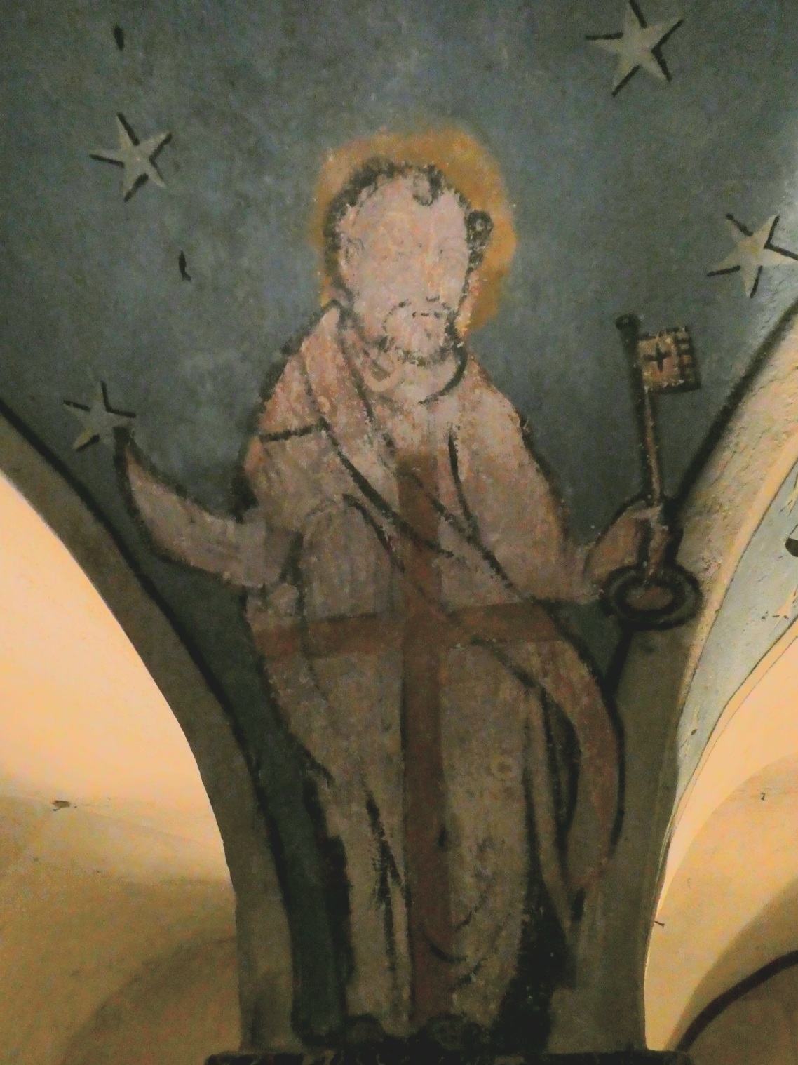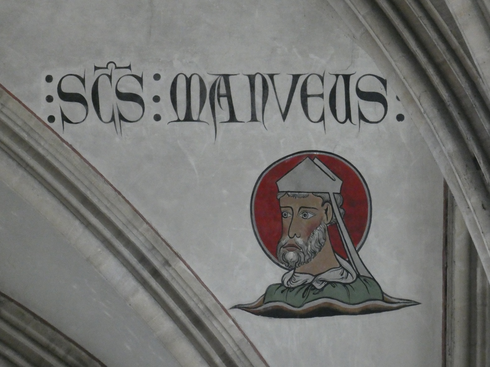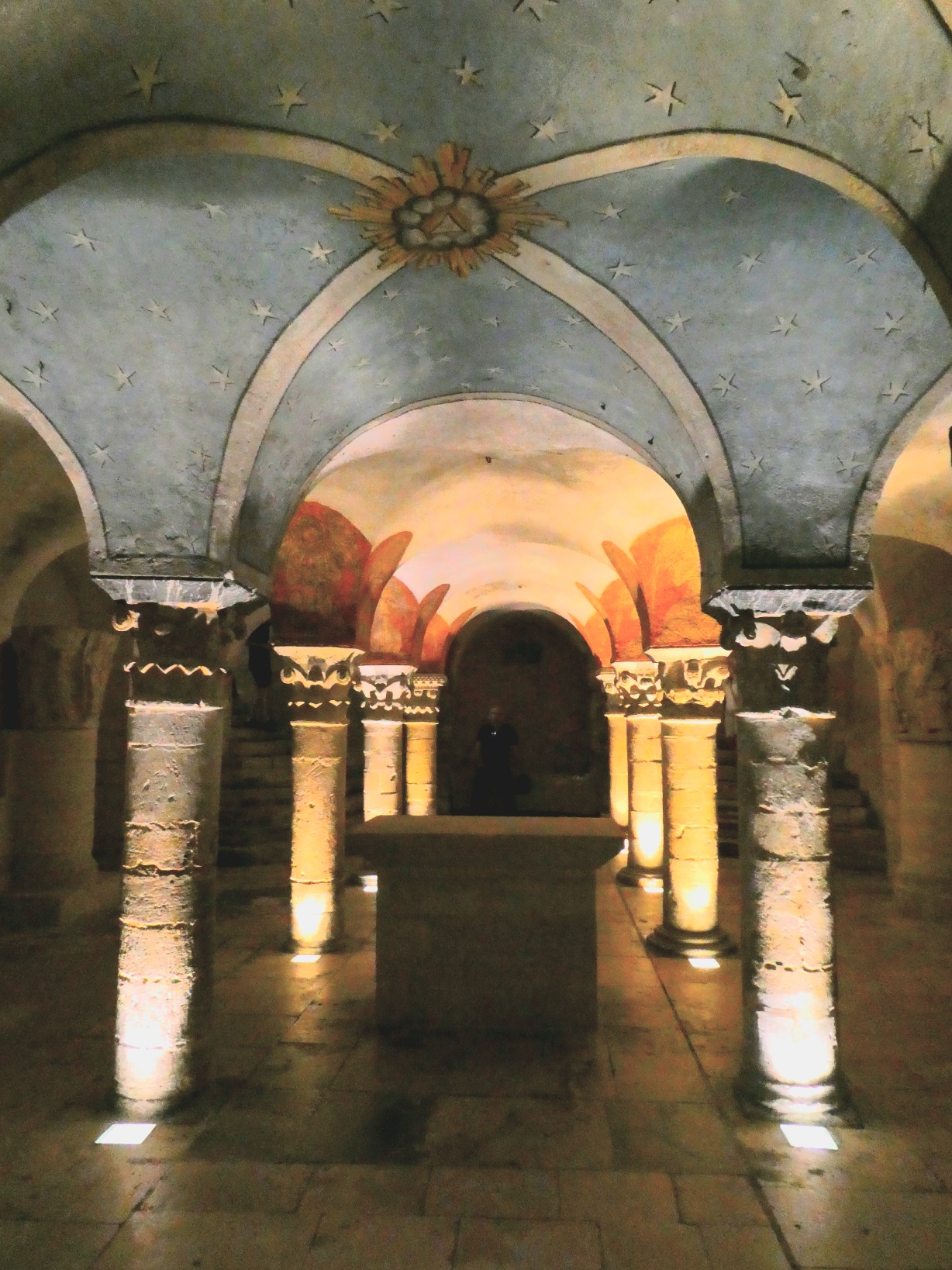 De crypte is wat is overgebleven van de kerk die in 1160 afbrandde. De schilderingen zijn het resultaat van een 15e eeuwse restauratie.