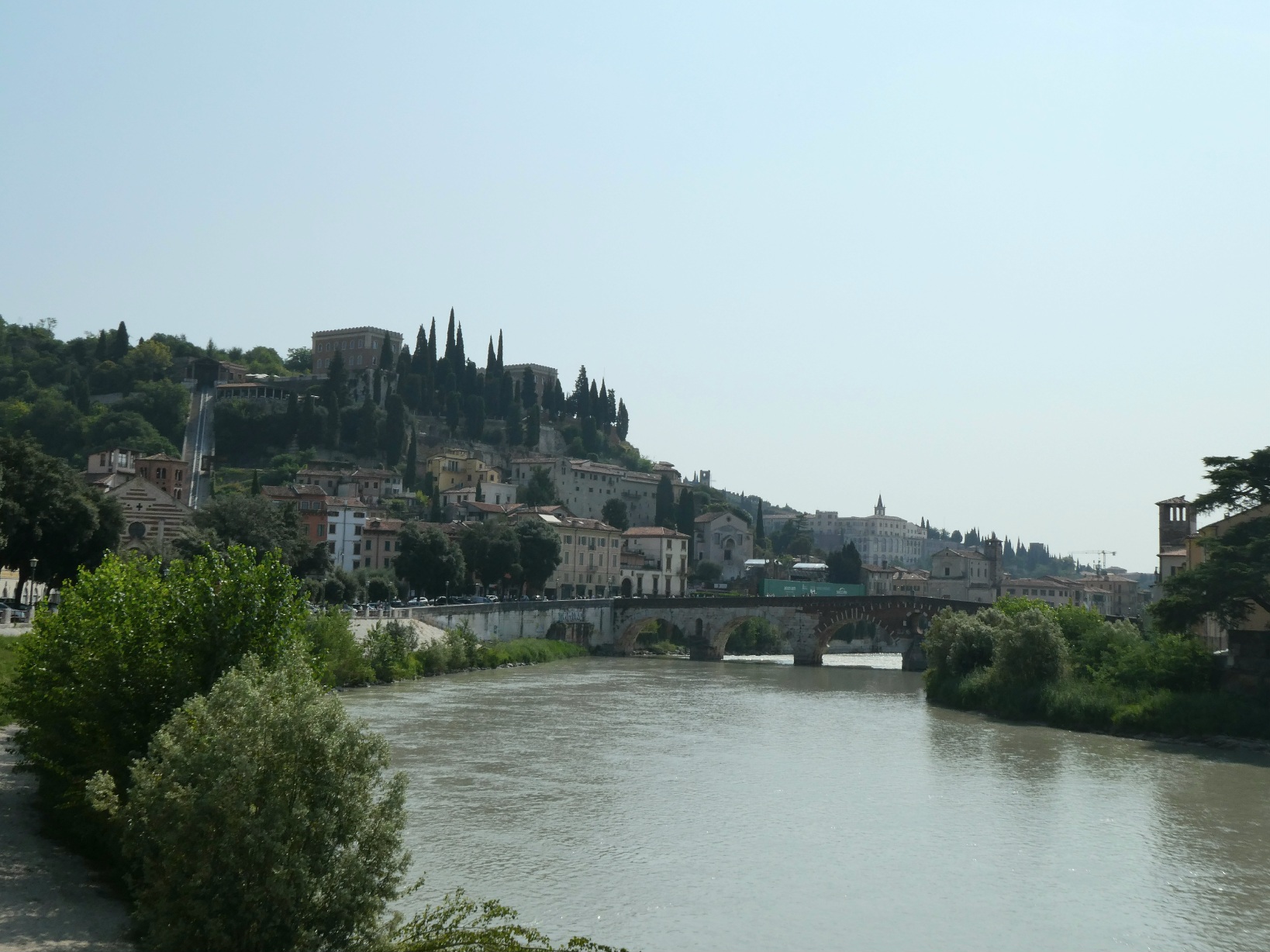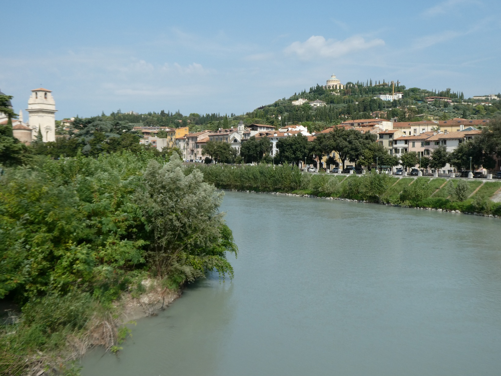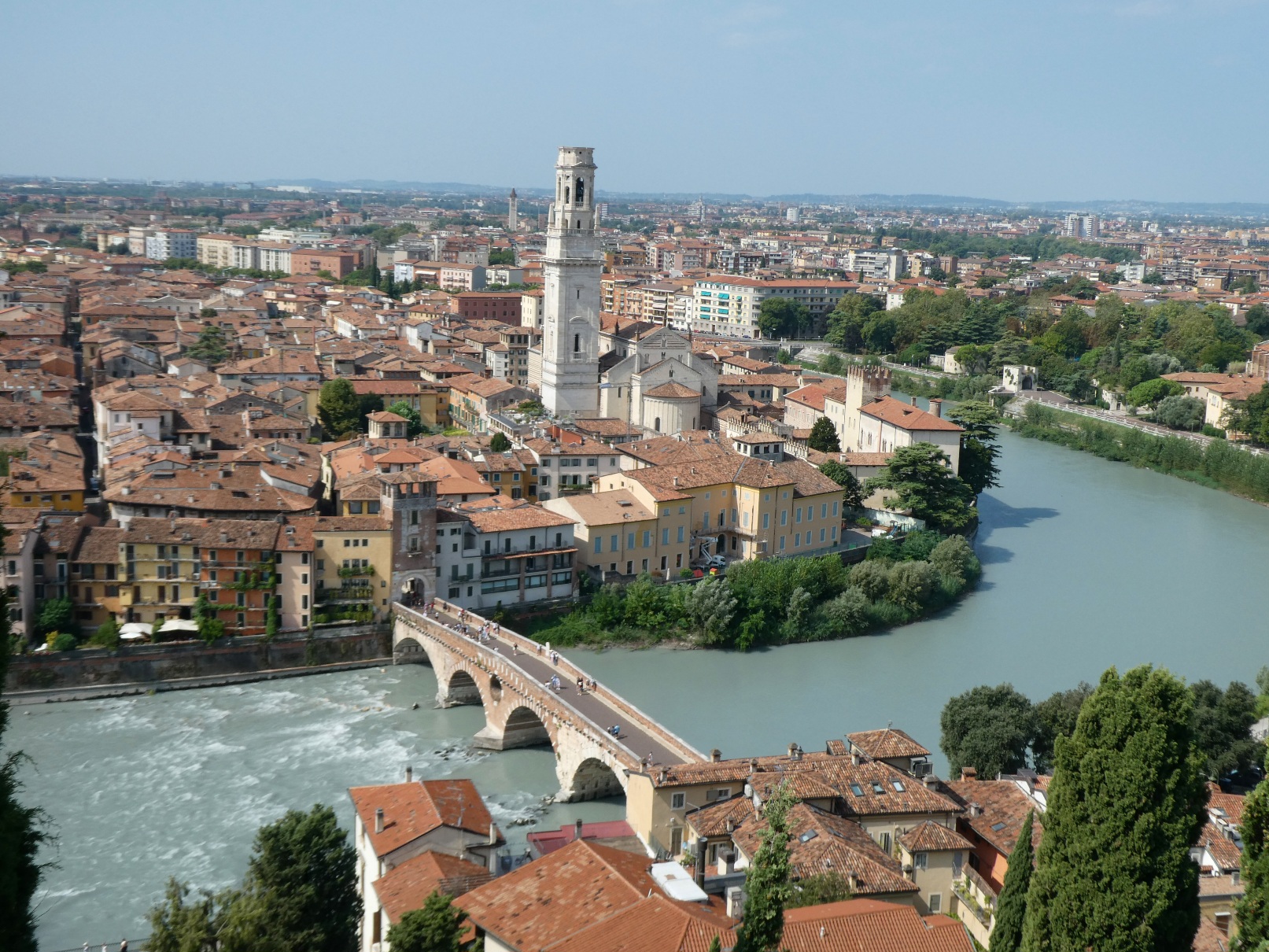 De oude stad van Verona is gebouwd in een bocht van de rivier de Adige, dus de rivier is overal zichtbaar.