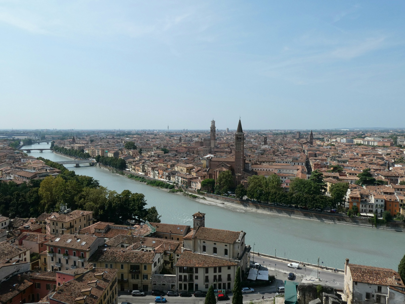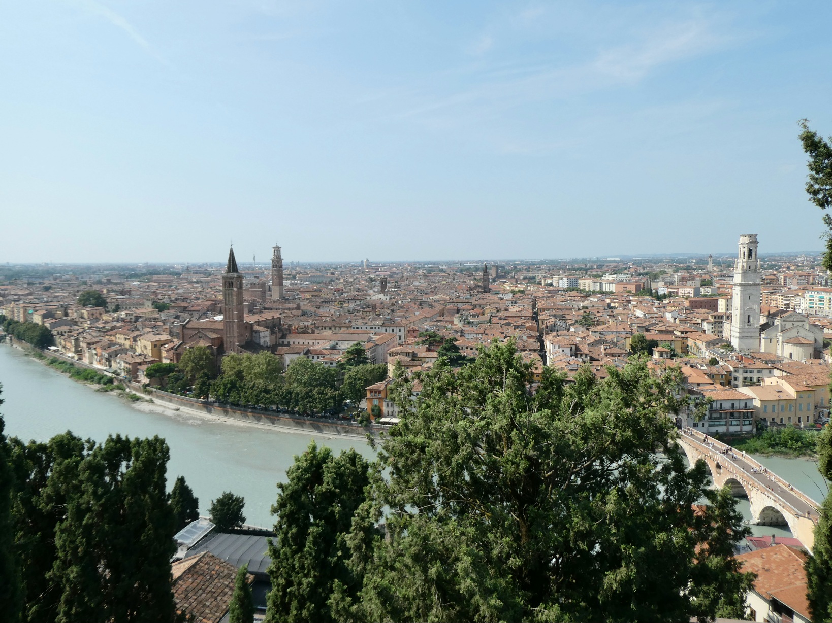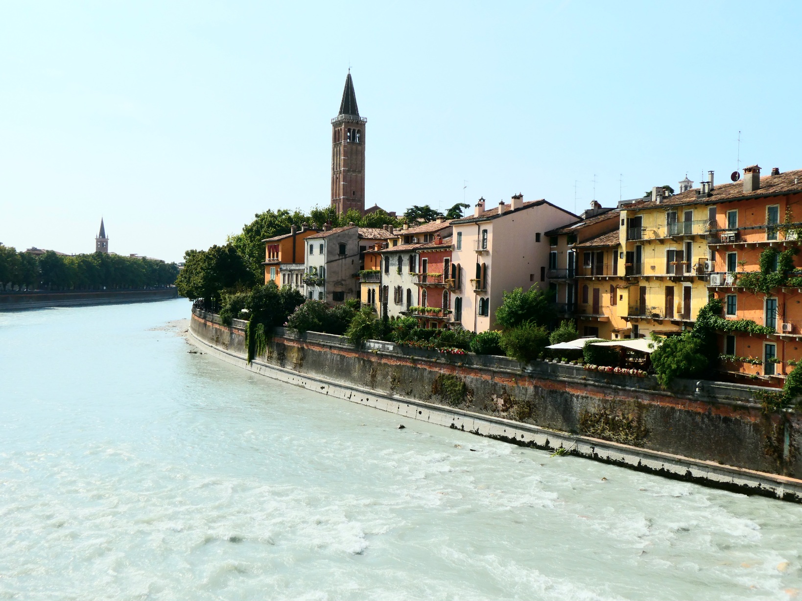 De oude stad van Verona is gebouwd in een bocht van de rivier de Adige, dus de rivier is overal zichtbaar.