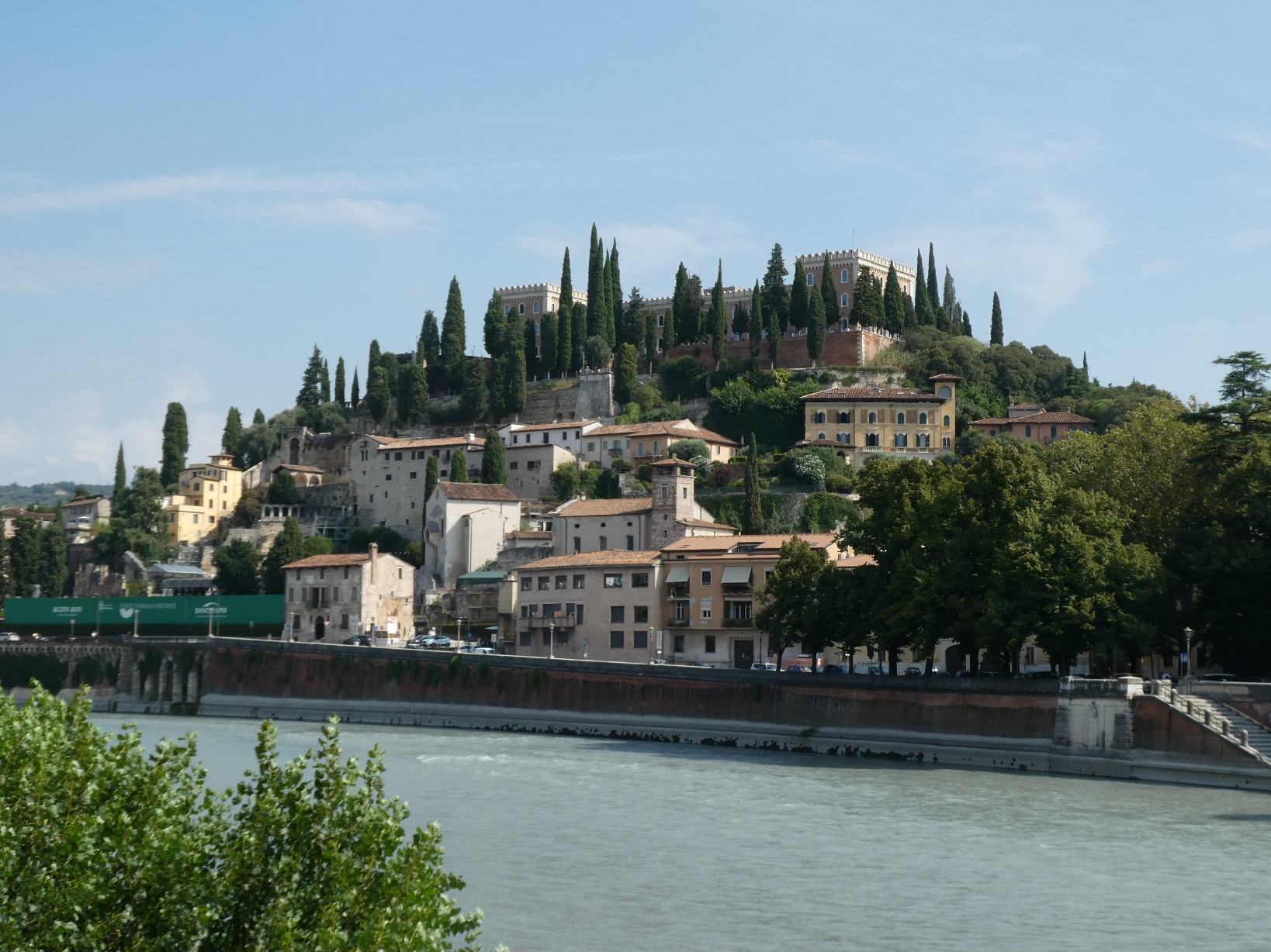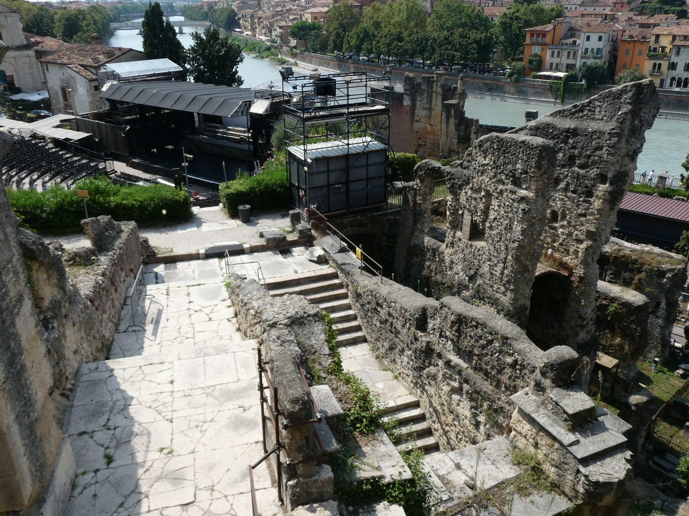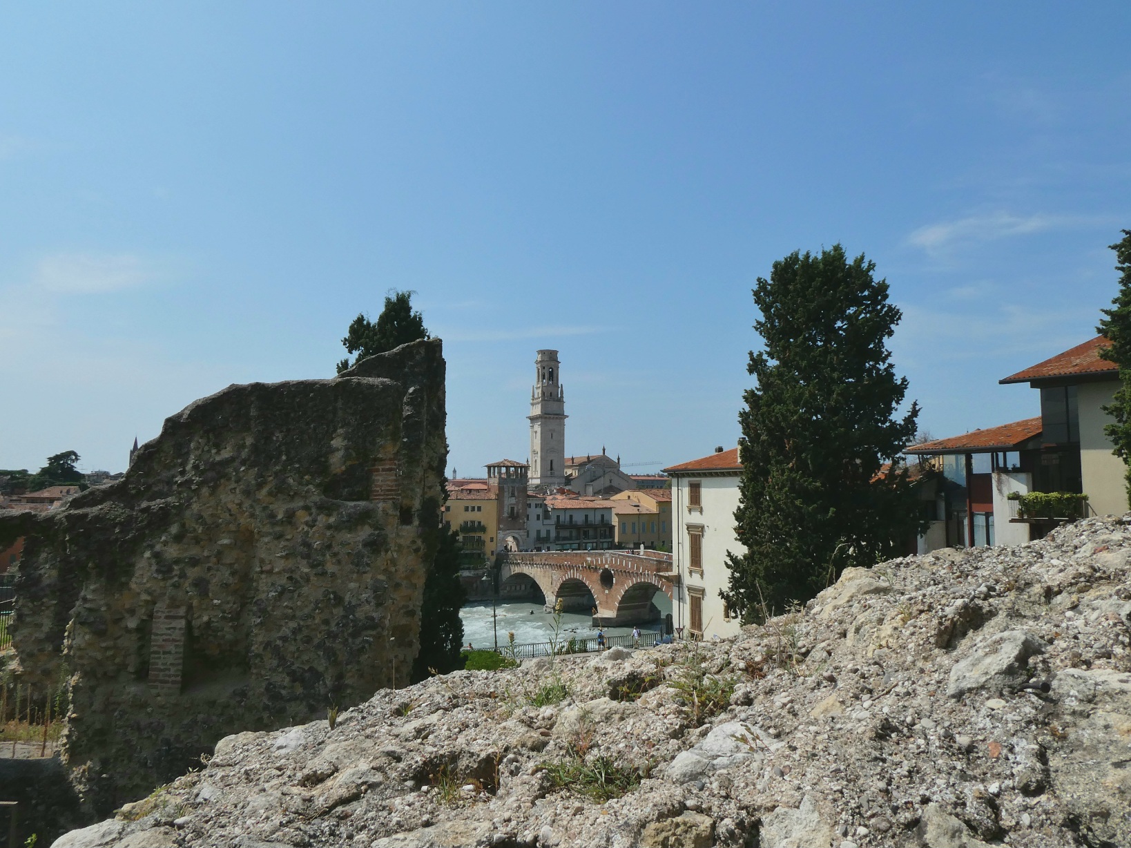 Verona is niet ontstaan waar nu het stadscentrum ligt, maar aan de overkant van de Adige, op de San Pietroheuvel. Al in de prehistorie werd de heuvel bewoond, maar in de Romeinse tijd (bloeiperiode 1e eeuw voor Christus tot 3e eeuw daarna) werd het centrum verplaatst naar de overkant en een Romeinse stad gebouwd. Op de top van de San Pietro (best een steile klim, je kunt ook een kabelbaantje nemen) ligt nu een oninteressant “kasteel”, een 19e eeuwse kazerne.