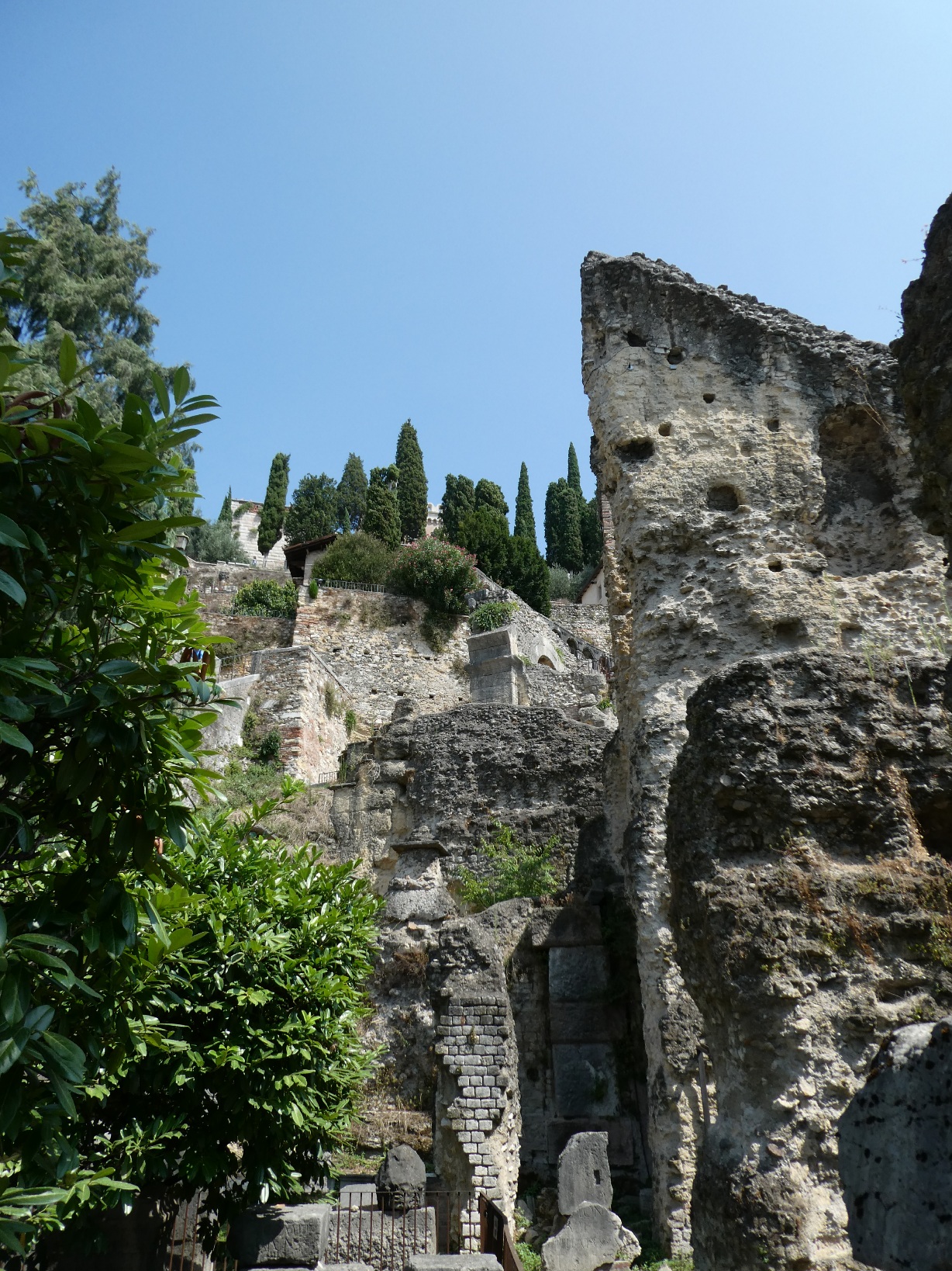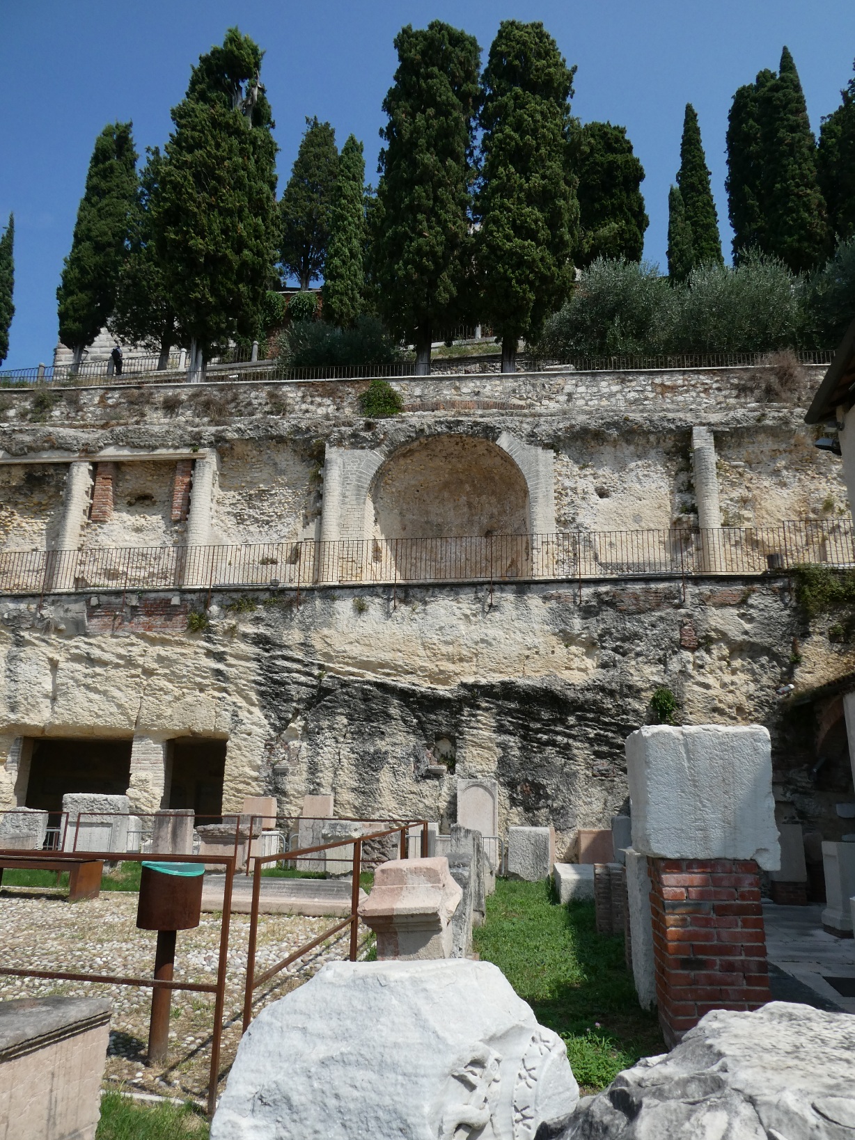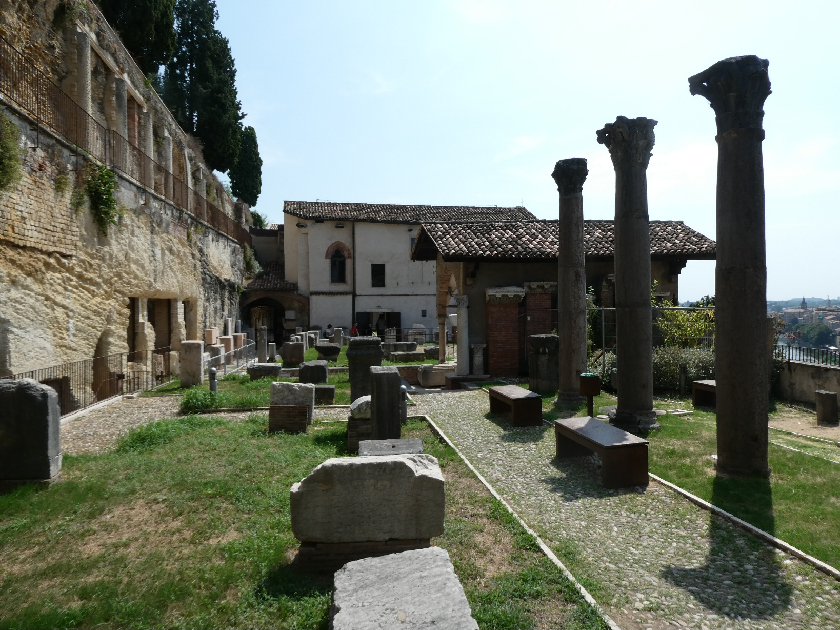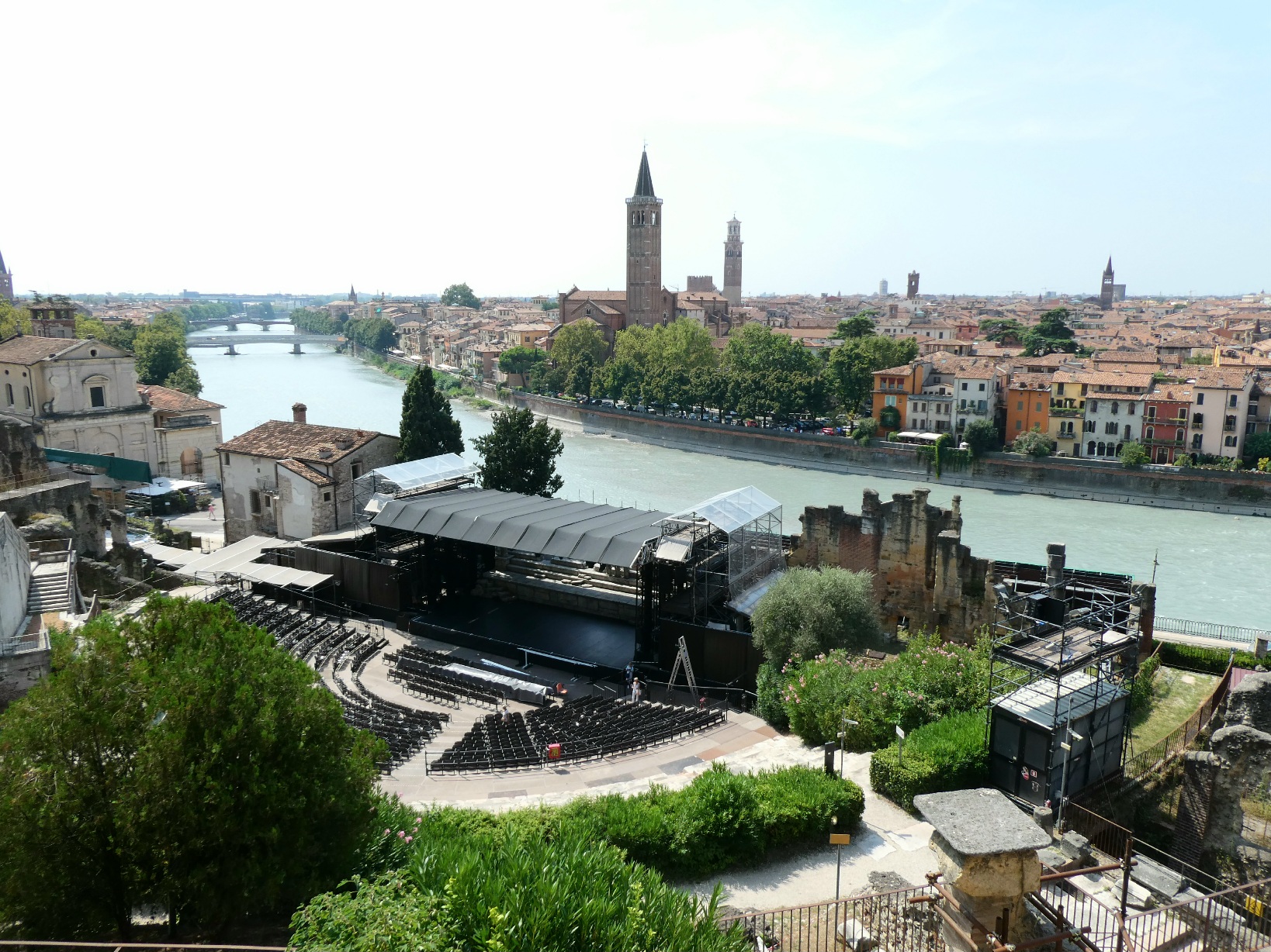Verona is niet ontstaan waar nu het stadscentrum ligt, maar aan de overkant van de Adige, op de San Pietroheuvel. Al in de prehistorie werd de heuvel bewoond, maar in de Romeinse tijd (bloeiperiode 1e eeuw voor Christus tot 3e eeuw daarna) werd het centrum verplaatst naar de overkant en een Romeinse stad gebouwd. Op de top van de San Pietro (best een steile klim, je kunt ook een kabelbaantje nemen) ligt nu een oninteressant “kasteel”, een 19e eeuwse kazerne.