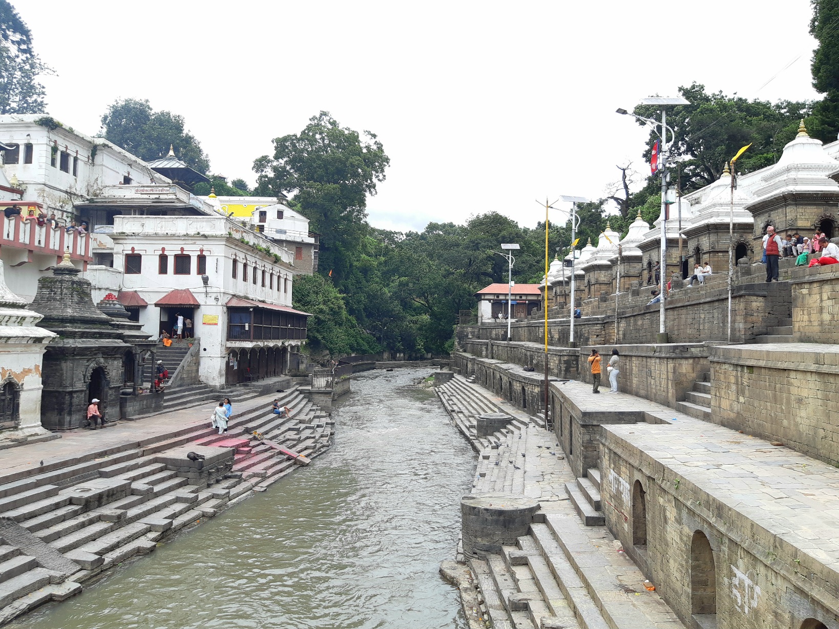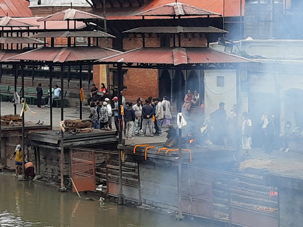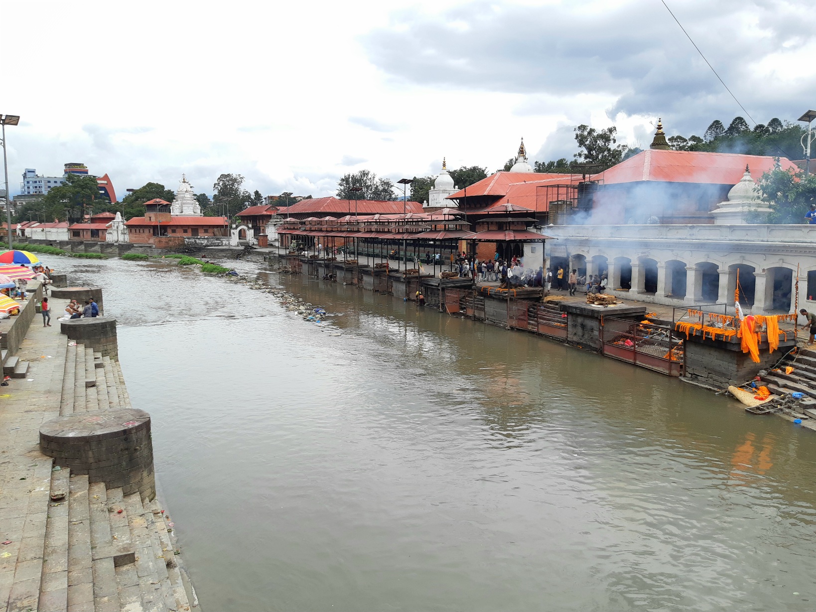 Pashupatinath ligt aan de Bagmati rivier, een voor hindoes heilige rivier die uitmondt in de Ganges. Op de kades langs de Bagmati, voor de eigenlijke tempel, vinden daarom crematies plaats. In de openlucht, dus voor iedereen zichtbaar (en te ruiken als je per ongeluk in de rook komt). De draagbaren voor de lijken worden ter plekke in elkaar gezet van bamboestokken. Na afloop worden de as en de overblijvende bloemversieringen simpelweg in de Bagmati geveegd.