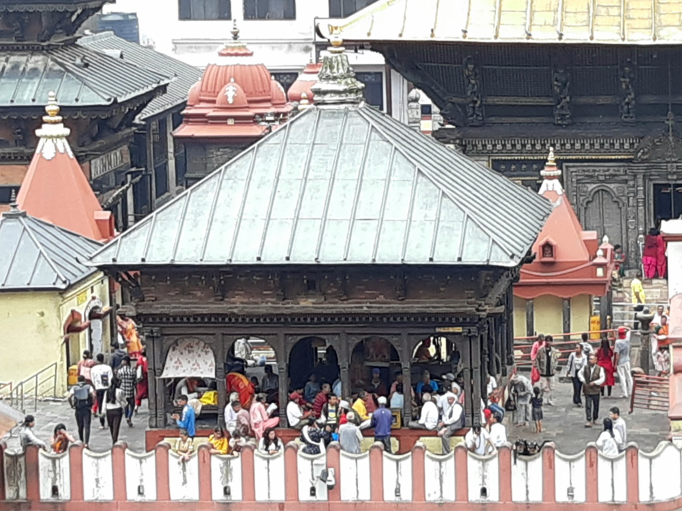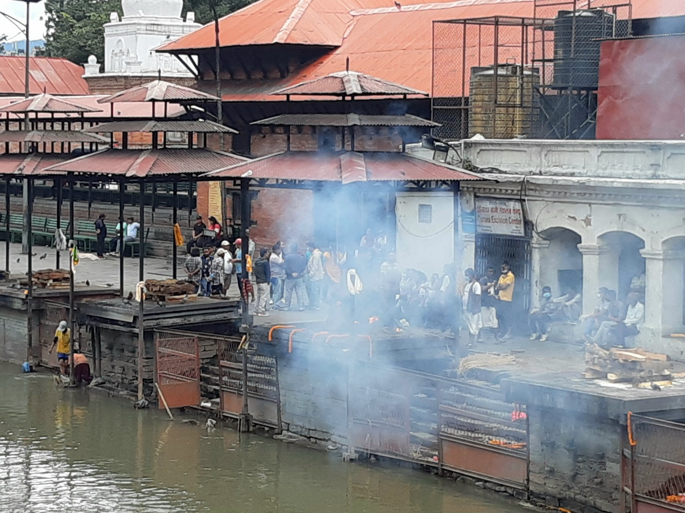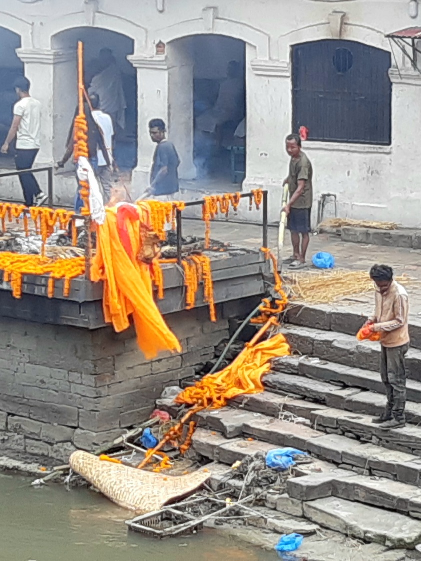 Pashupatinath ligt aan de Bagmati rivier, een voor hindoes heilige rivier die uitmondt in de Ganges. Op de kades langs de Bagmati, voor de eigenlijke tempel, vinden daarom crematies plaats. In de openlucht, dus voor iedereen zichtbaar (en te ruiken als je per ongeluk in de rook komt). De draagbaren voor de lijken worden ter plekke in elkaar gezet van bamboestokken. Na afloop worden de as en de overblijvende bloemversieringen simpelweg in de Bagmati geveegd.