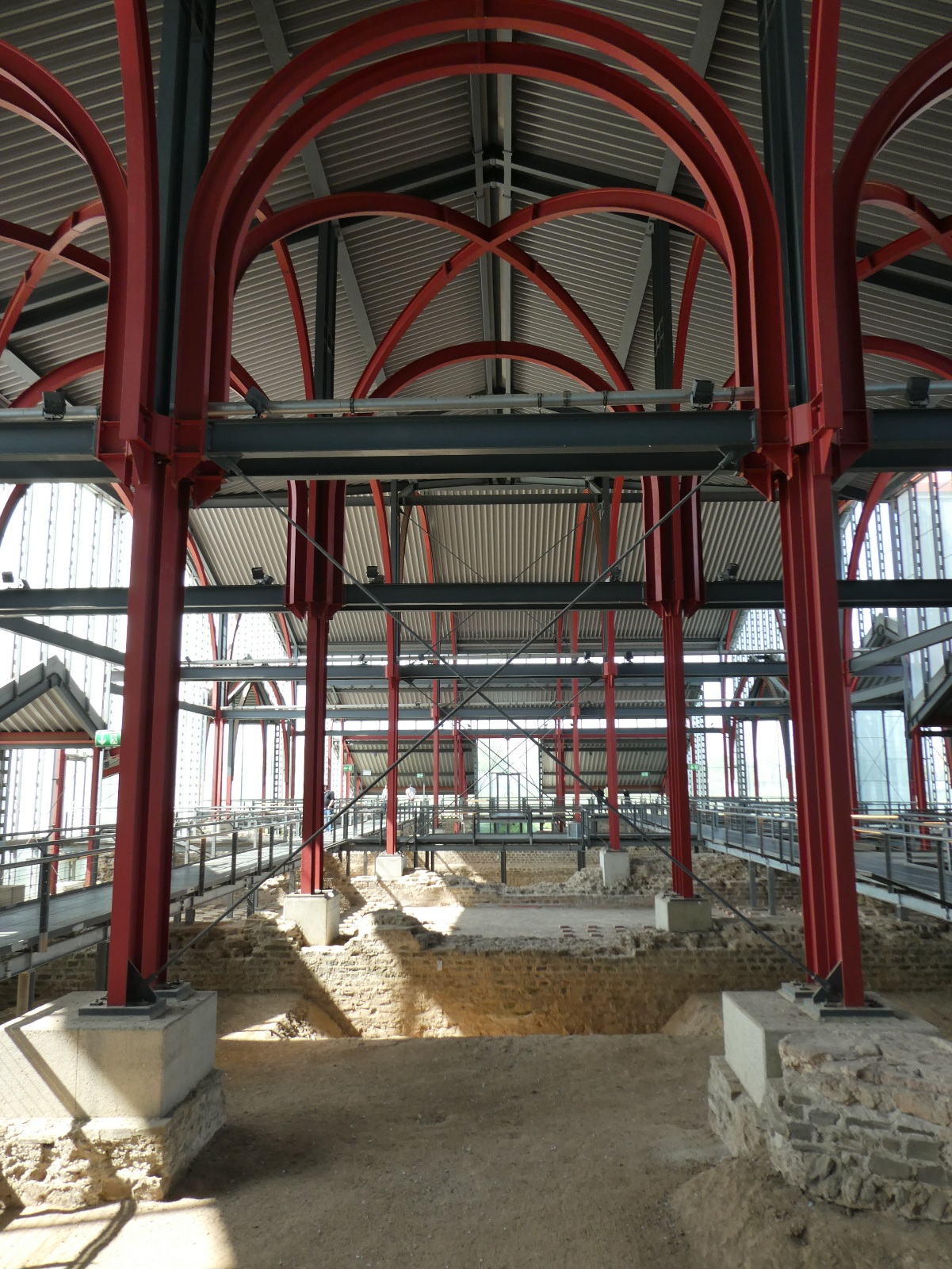 Binnenin het gebouw is een stalen constructie, in de originele vorm, over de fundamenten van de oude thermen geplaatst, met stalen loopbruggen die het mogelijk maken door de hele constructie te lopen zonder schade aan te richten.