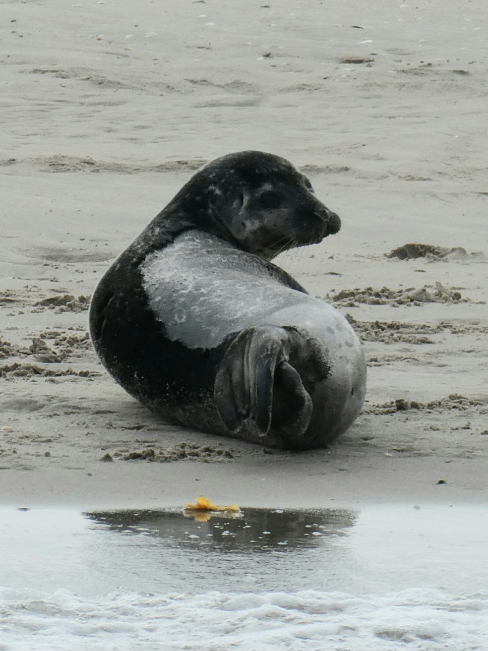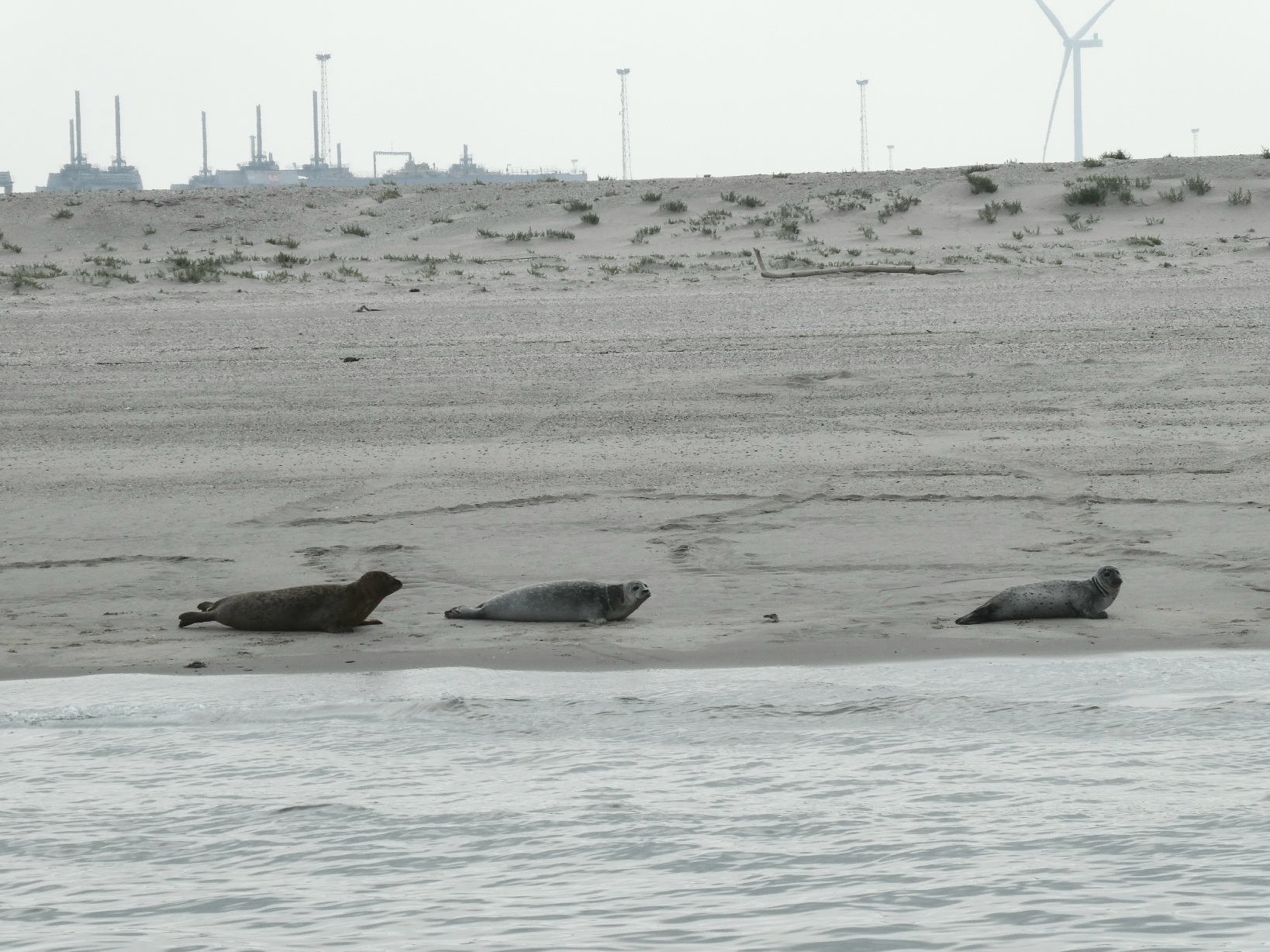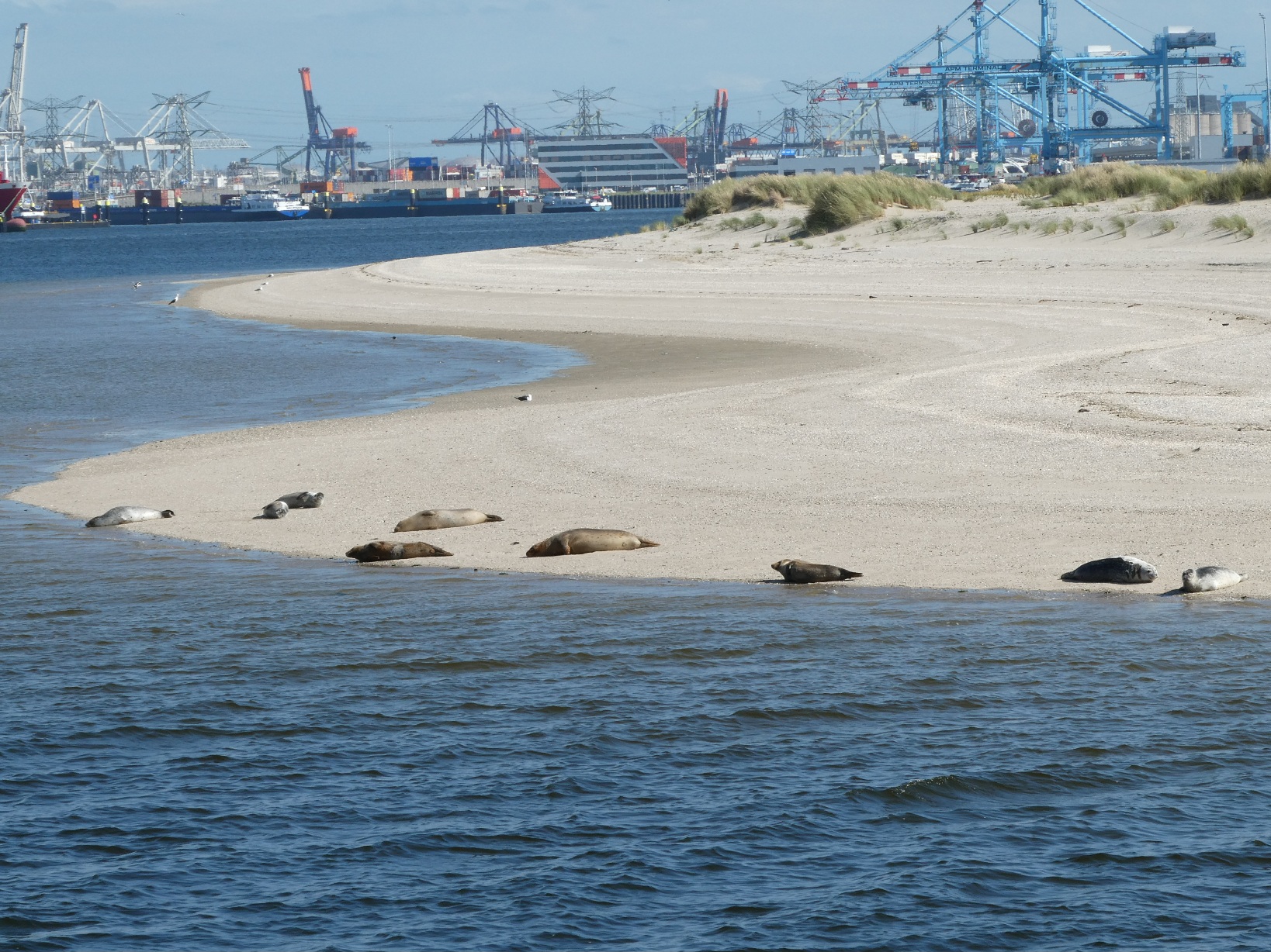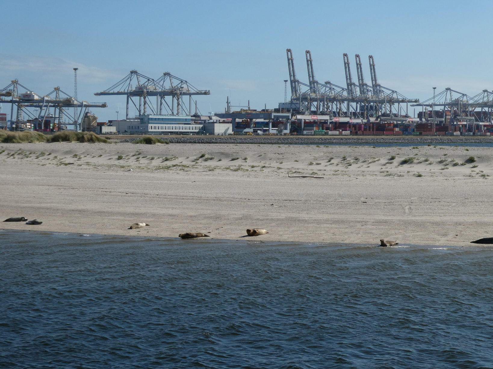 Tussen de zware scheepvaart, industrie en windmolens op de Tweede Maasvlakte, is een klein zandstrand. Dat blijkt een ideale plek voor zeehonden, met jonkies.