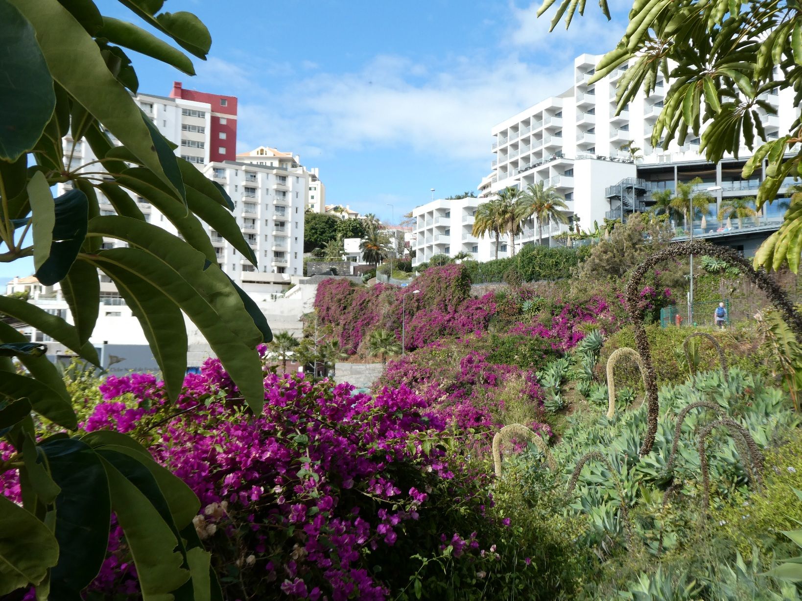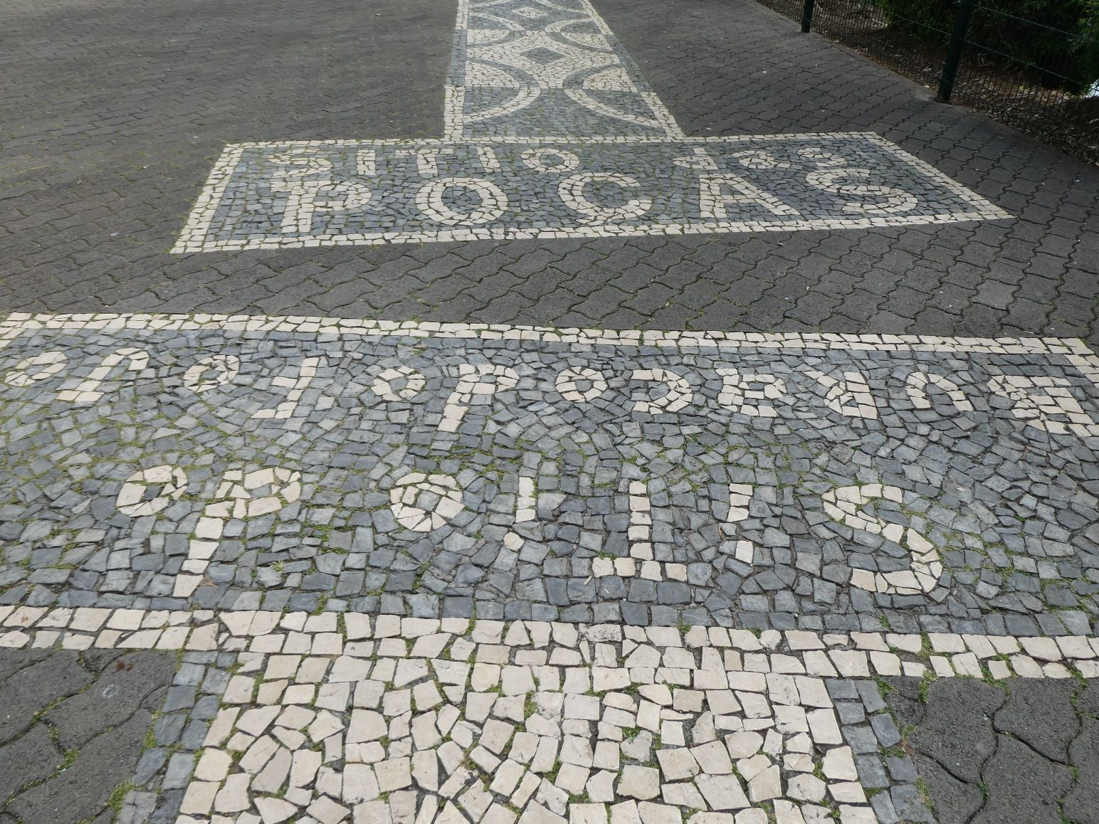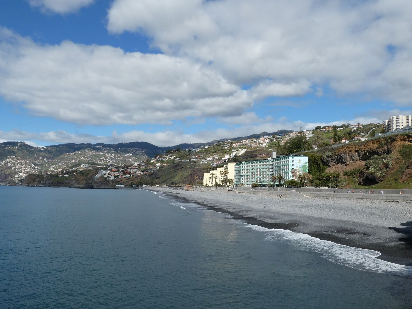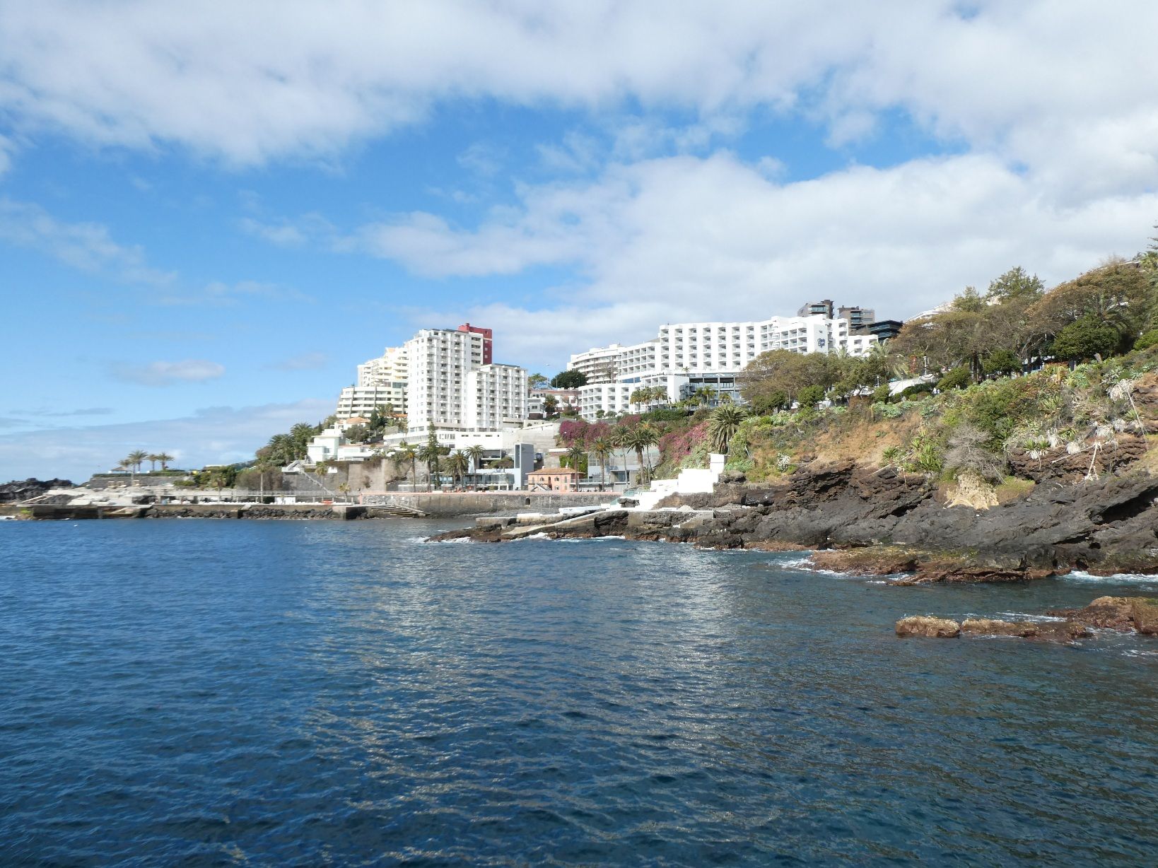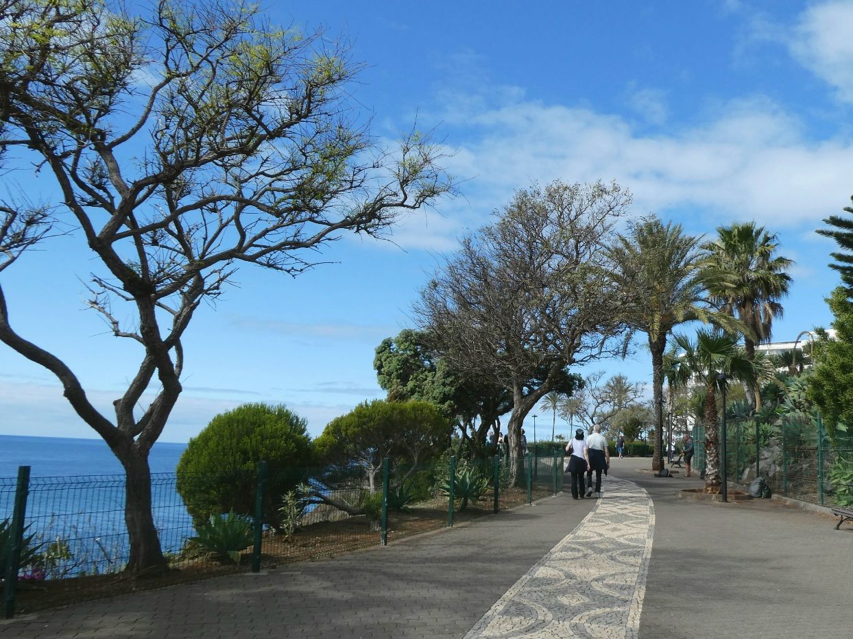 Aan de westkant van Funchal ligt een hele rij hotels langs de kust. Tussen de hotels en het water is een lange, goed onderhouden wandelweg aangelegd. In de steentjes is steeds aangegeven waar je je bevindt.