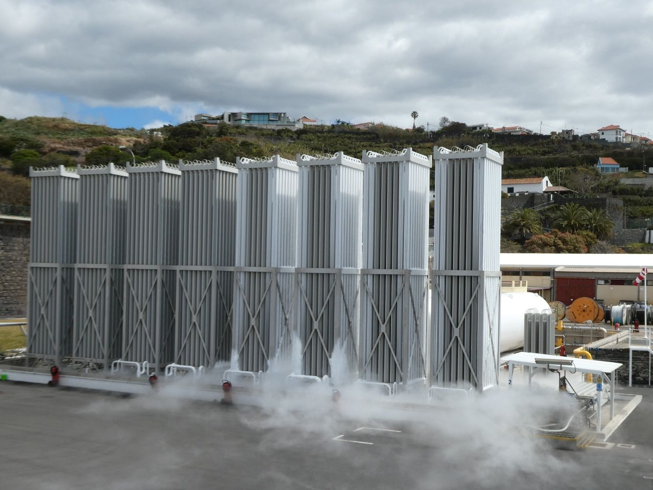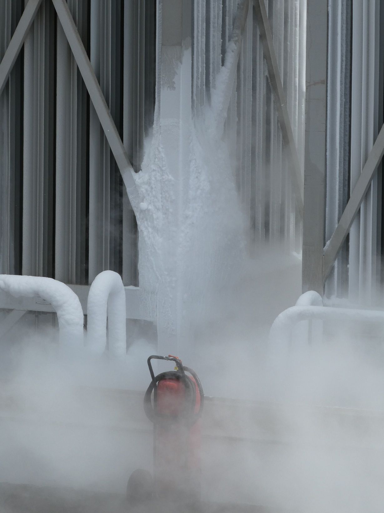 Loop je nog voorbij het strand, dan kom je niet alleen langs een kleine waterval, maar ook bij een paar industriële gebouwen, waaronder een lng-installatie. Temperatuur -150°, dus veel ijs en bevroren gas.